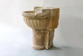 Breng tijdloze elegantie in uw buitenruimte of interieur met deze prachtige antieke natuurstenen fontein. Dit originele erfgoedobject, vervaardigd uit massieve kalksteen, straalt de charme en grandeur van vervlogen eeuwen uit. De kom met handgehouwen reliëf en de robuuste sokkel maken dit stuk een echte blikvanger voor wie houdt van exclusiviteit en authenticiteit.