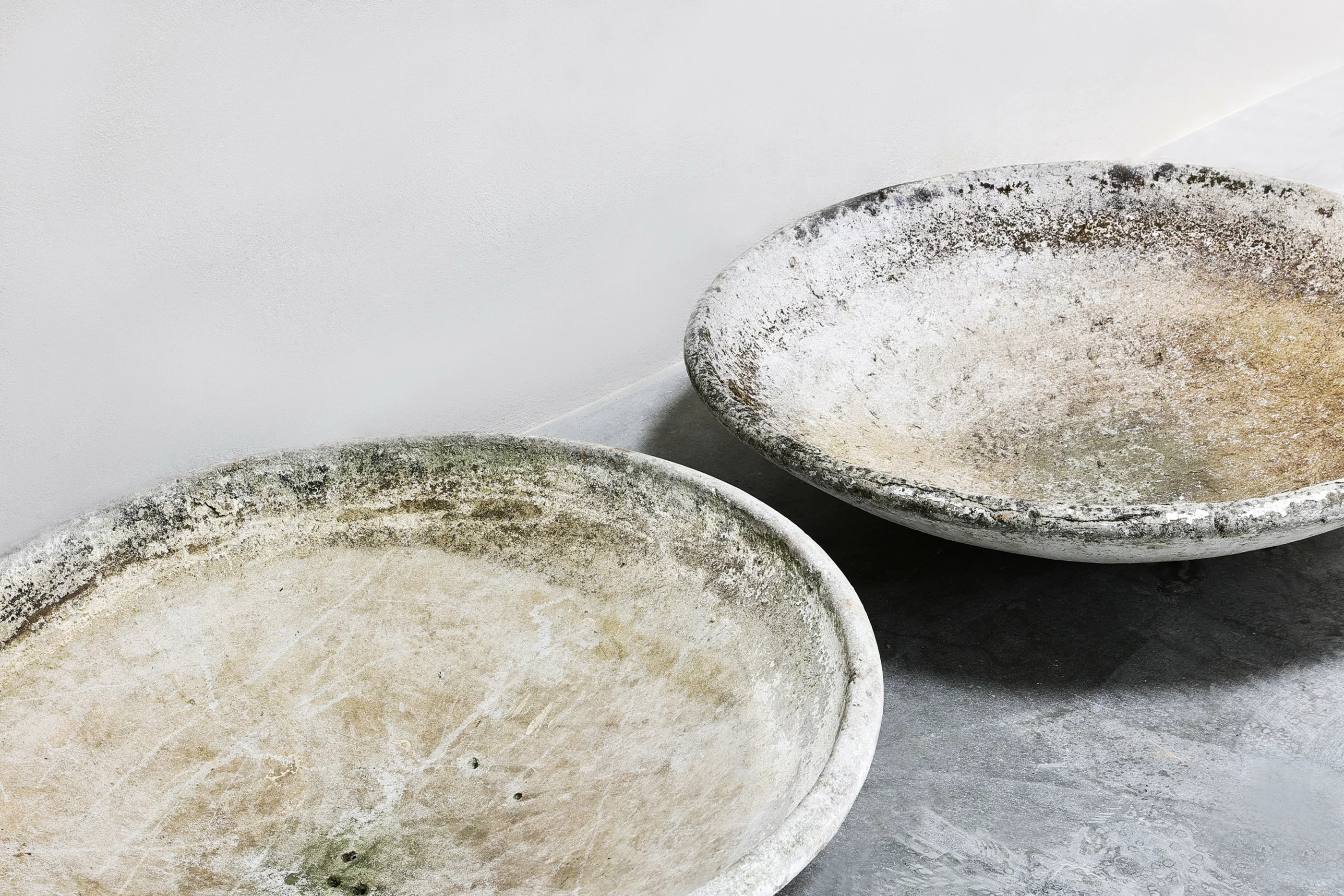 Deze set antieke natuurstenen schalen uit de 19e eeuw onderscheidt zich door de robuuste vorm en het authentieke patina. Oorspronkelijk gebruikt op boerderijen en landgoederen als voeder- of waterschaal, vandaag geliefd als karaktervolle decoratie.