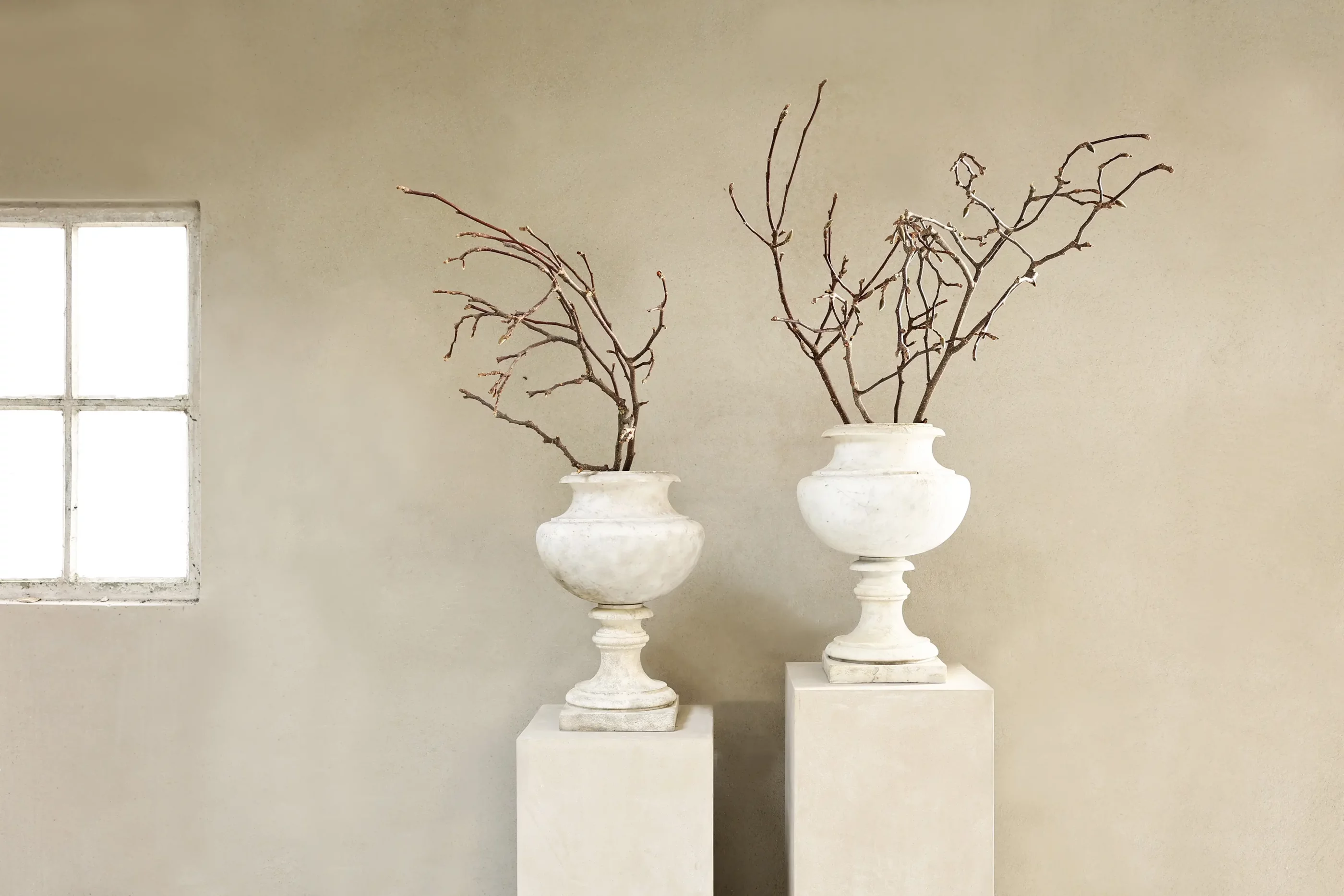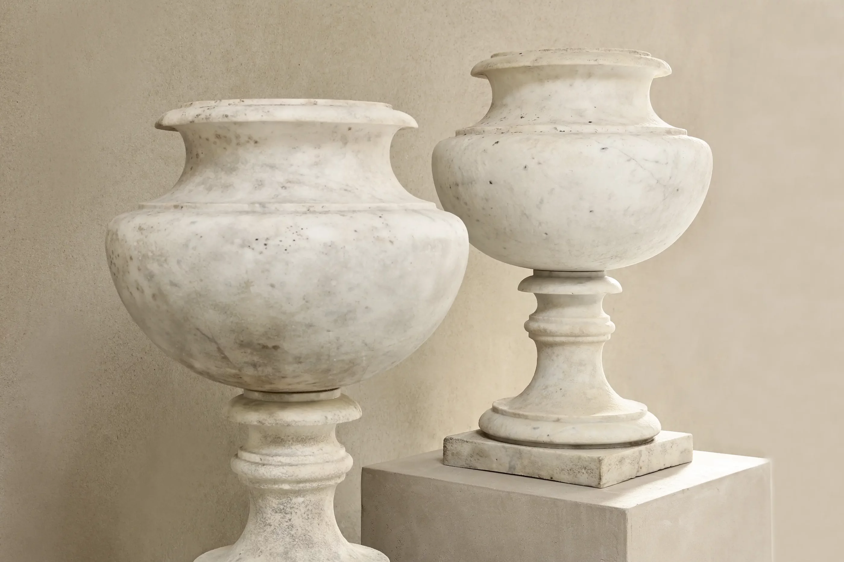 Deze prachtige marmeren vazen brengen direct een gevoel van rust, klasse en verfijning in elke ruimte. Met hun klassieke urnvorm en subtiele aders in het natuursteen stralen ze pure elegantie uit. Of je ze nu plaatst in een stijlvol interieur, een entree, serre of op een luxe terras – deze vazen trekken op een rustige maar indrukwekkende manier de aandacht.