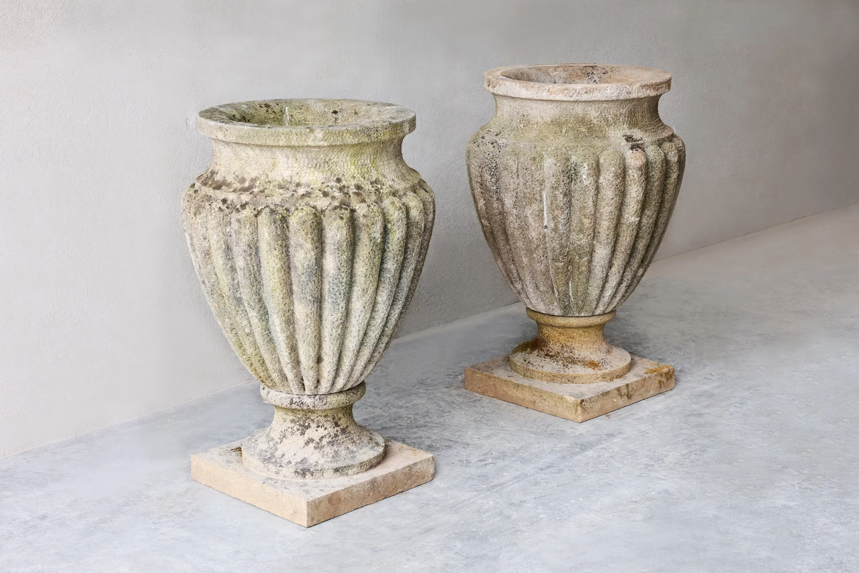 Dit fraaie stel gecanneleerde siervazen is rond 1950 vervaardigd uit massieve kalksteen. De elegante balustervorm met diep uitgesneden cannelures doet denken aan Franse tuinarchitectuur uit de eerste helft van de 20e eeuw. Beide vazen tonen een prachtig geleefde patina met sporen van mos en vergrijzing – precies zoals je hoopt bij een object dat jarenlang buiten heeft gestaan.