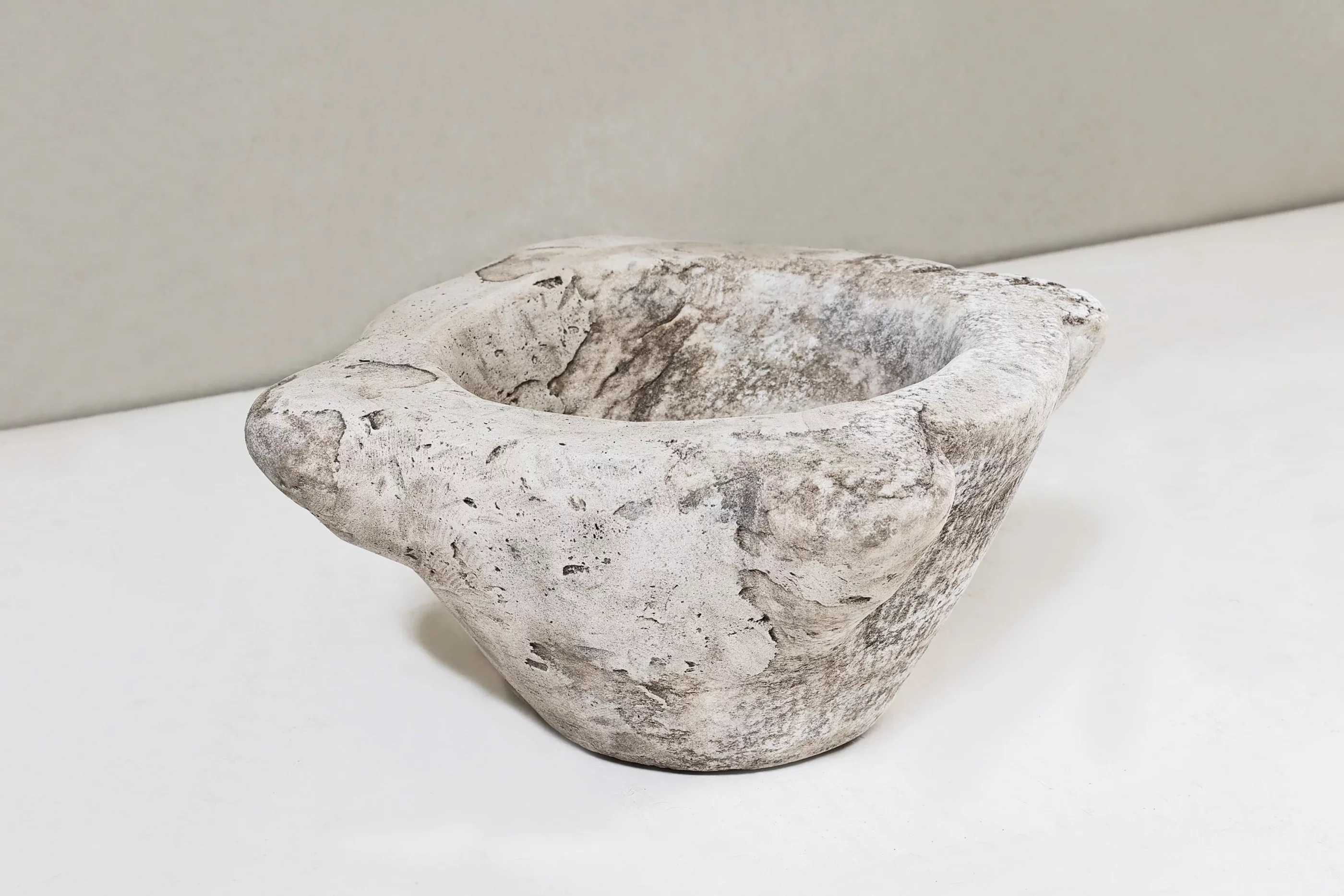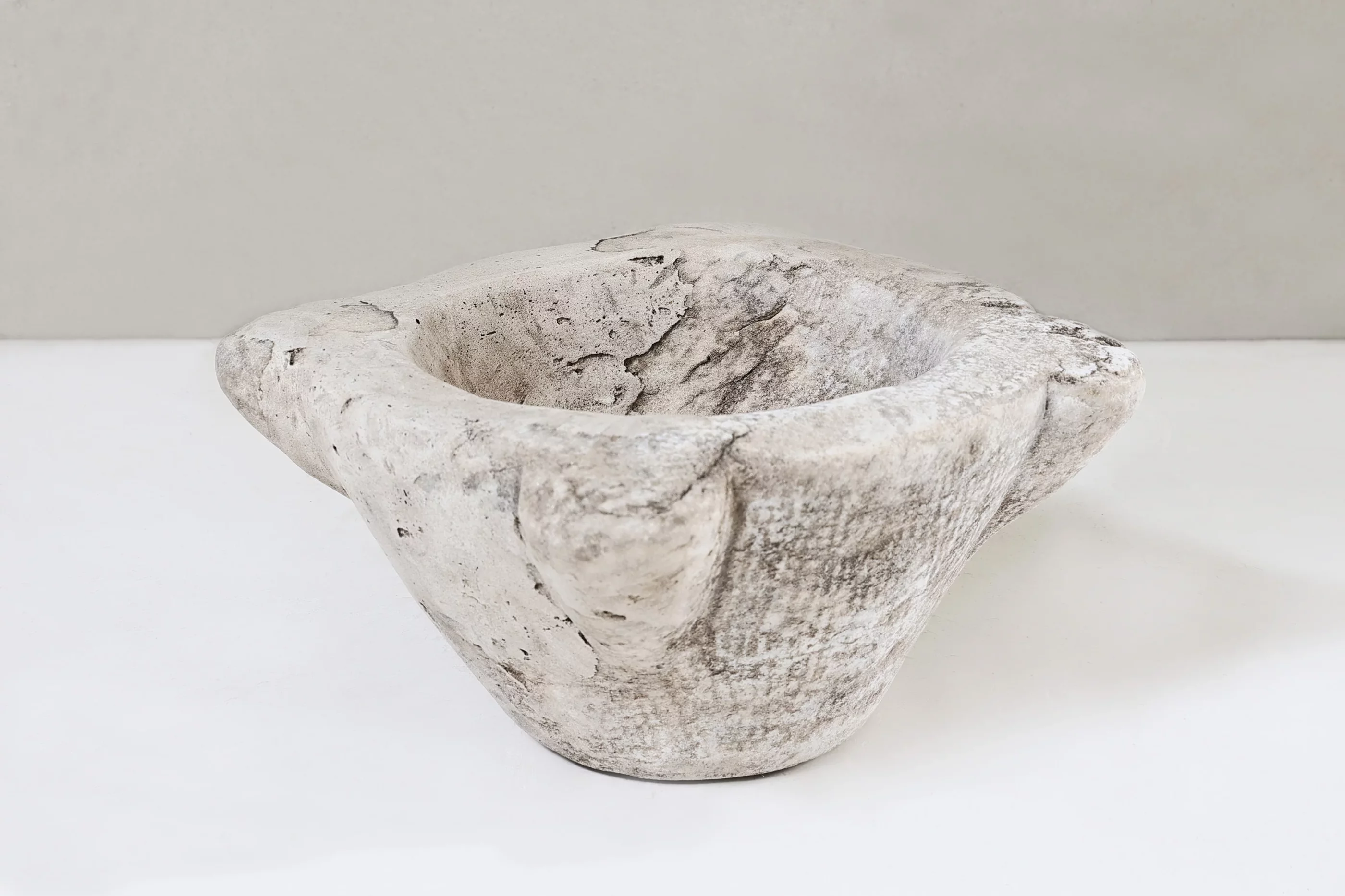 Deze antieke vijzel is volledig met de hand uit natuursteen gehouwen en straalt vakmanschap en authenticiteit uit. Oorspronkelijk gebruikt als functioneel object in keukens en werkplaatsen, vormt hij vandaag de dag een bijzonder decoratief stuk met historische waarde.