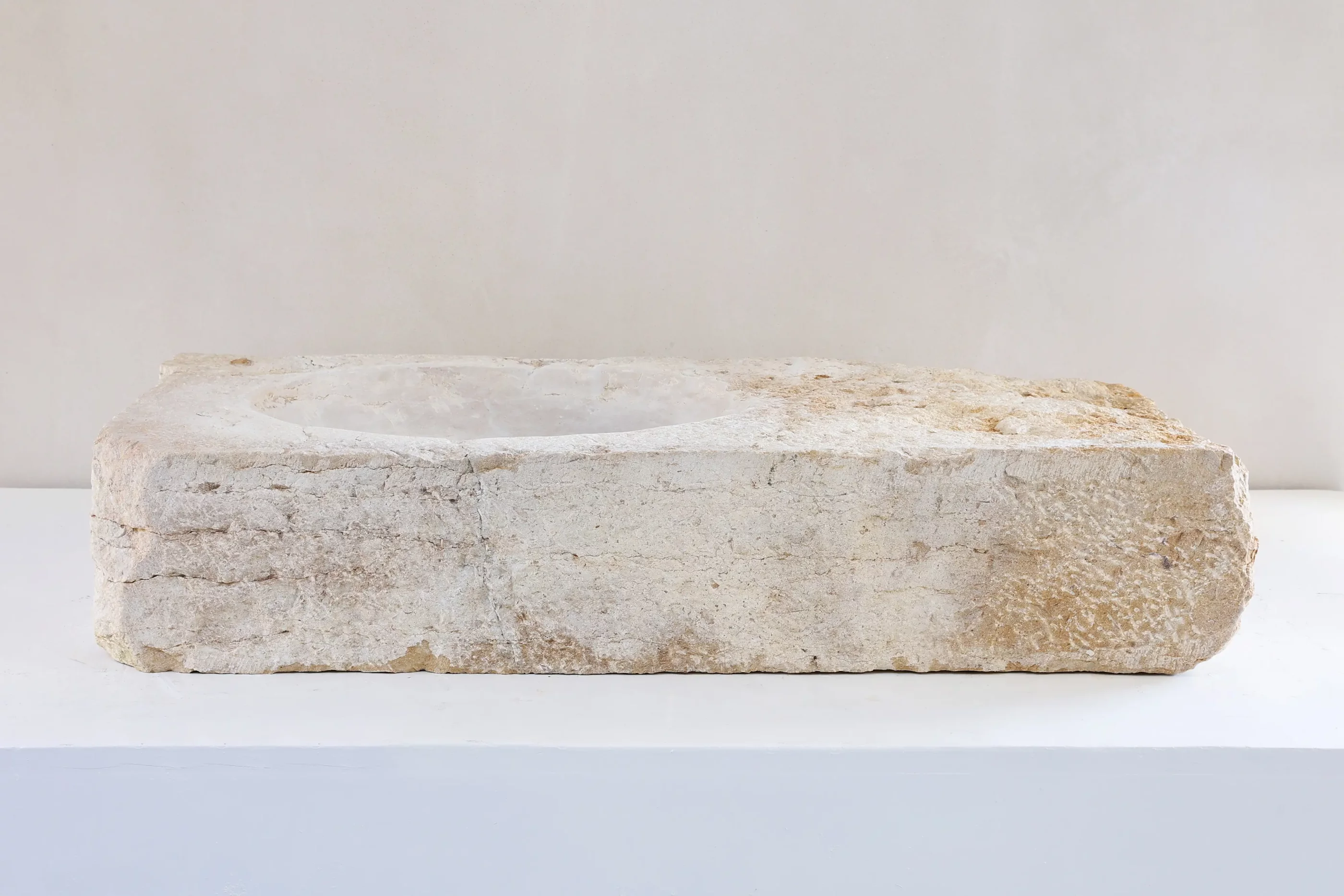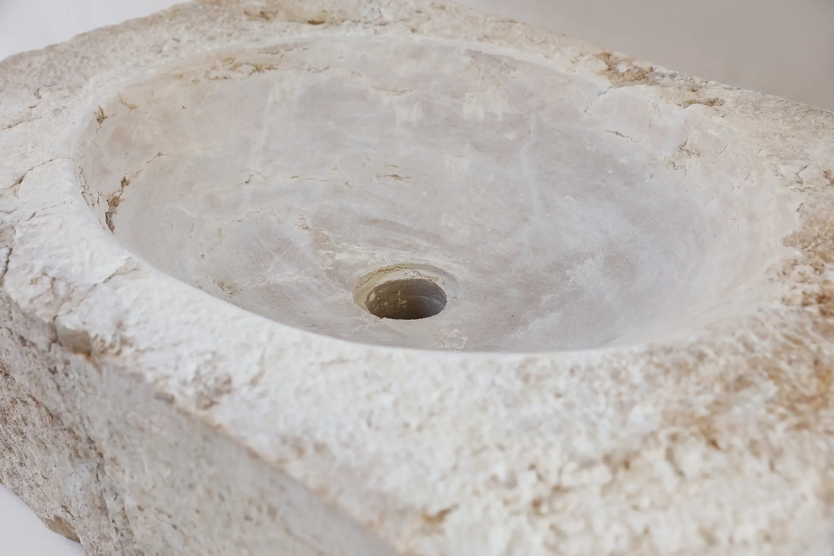 De wasbak heeft een eenvoudige, robuuste vorm met een uitgeholde kom en een onbewerkte buitenzijde. De kalksteen vertoont natuurlijke kleurvariaties en kleine onregelmatigheden.