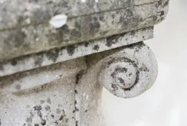 Een margelle de puits is de rand- of afdeksteen van een waterput die de opening beschermt en een robuuste bovenzijde biedt. Dit exemplaar refereert aan een kapiteel (bovenstuk van een zuil) met sierlijke voluten, een geliefd motief in 18e-eeuwse buitenarchitectuur. De handgehakte afwerking, onregelmatige houwsporen en natuurlijke patina onderscheiden het overtuigend van moderne reproducties.