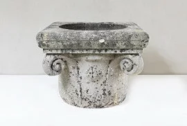 Compacte margelle de puits (waterputrand) in de gedaante van een kapiteel met voluten, handgehakt uit één massief blok kalksteen. Met een buitenmaat van 56 × 56 cm en een hoogte ca. 44 cm is dit een zeldzaam tuinornament dat uitstekend inzetbaar is als fonteinbasis, plantenbak of sculpturaal accent in patio of landschapstuin.