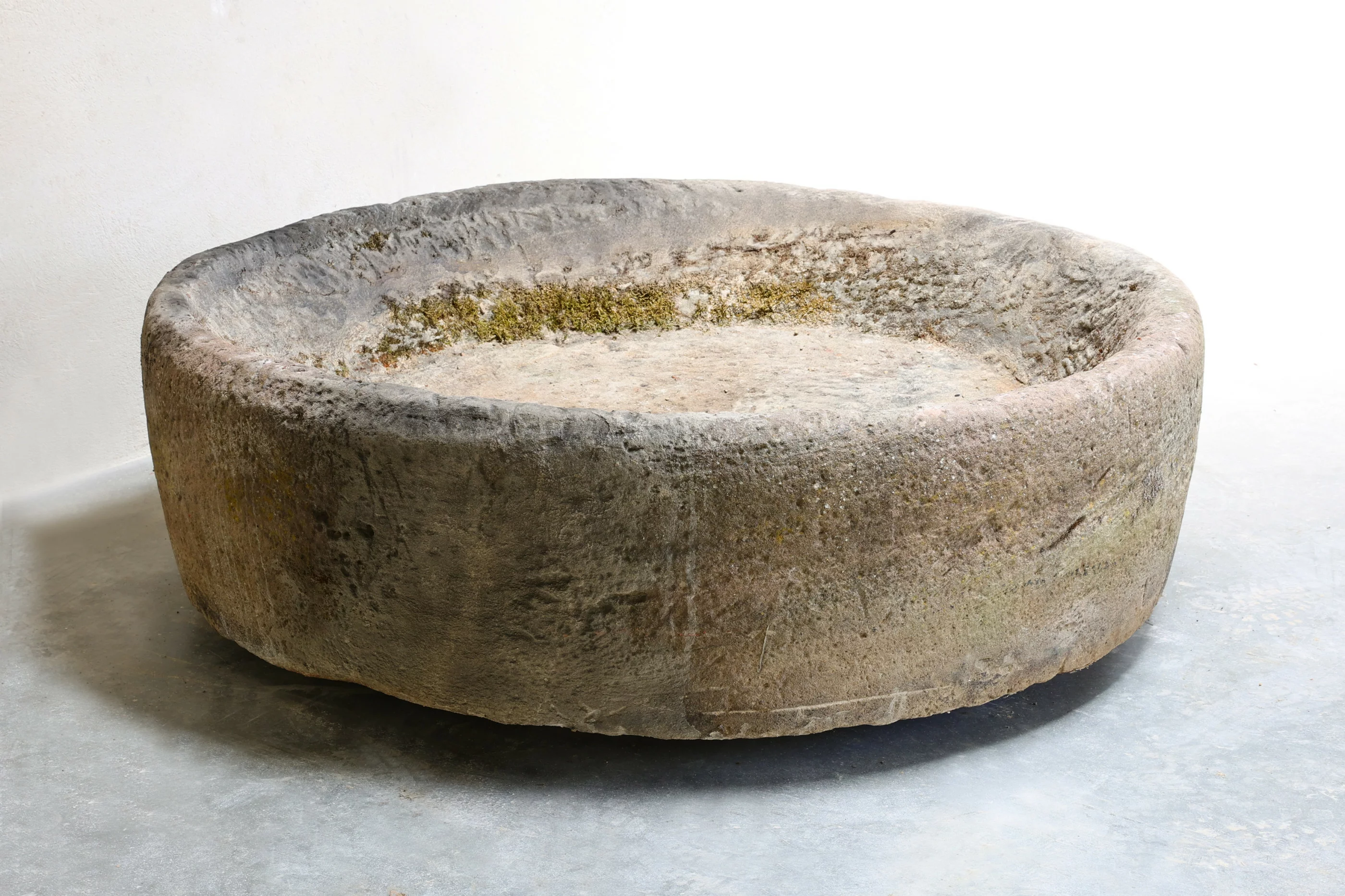 Dit object is oorspronkelijk een antieke ronde water- of voederbak, handgehakt uit één blok natuursteen. Door zijn uitgesproken ronde vorm en relatief diepe uitholling, valt hij op tussen de veel vaker voorkomende rechthoekige exemplaren. Dergelijke bakken werden historisch gebruikt als abreuvoir (drinkbak voor vee of paarden), en soms als pierre à eau in kloosters of boerderijen. Mogelijk diende dit specifieke stuk zelfs als kuip of perssteen voor druiven of olijven.