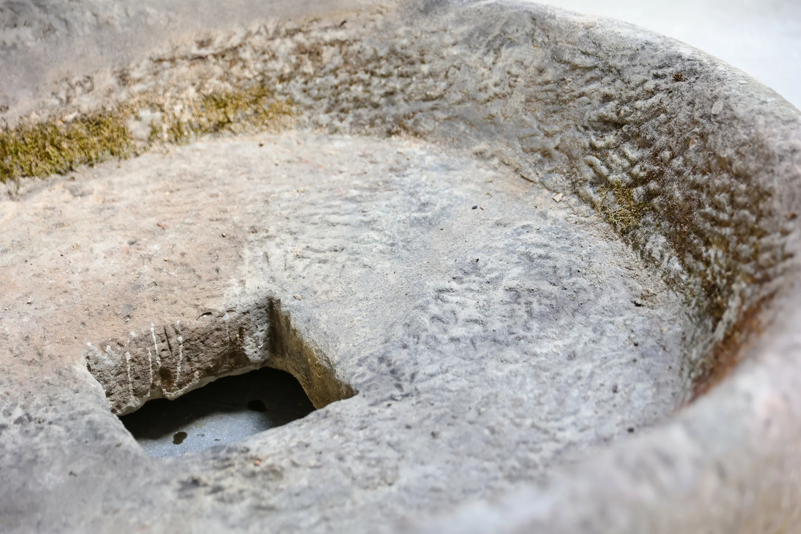 De volledig met de hand uitgehakte afwerking, samen met het uitgesproken patina en slijtagepatronen, wijzen op een datering in de 18e tot 19e eeuw. Vandaag de dag zijn zulke objecten zeer geliefd als authentieke tuinornamenten. Ze onderscheiden zich duidelijk van moderne reproducties door hun oneffen haksporen, natuurlijke verwering en unieke uitstraling.