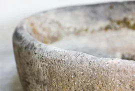Dit object is oorspronkelijk een antieke ronde water- of voederbak, handgehakt uit één blok natuursteen. Door zijn uitgesproken ronde vorm en relatief diepe uitholling, valt hij op tussen de veel vaker voorkomende rechthoekige exemplaren. Dergelijke bakken werden historisch gebruikt als abreuvoir (drinkbak voor vee of paarden), en soms als pierre à eau in kloosters of boerderijen. Mogelijk diende dit specifieke stuk zelfs als kuip of perssteen voor druiven of olijven.