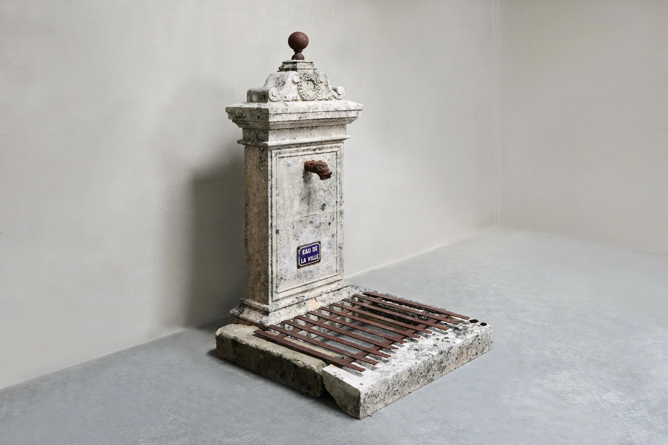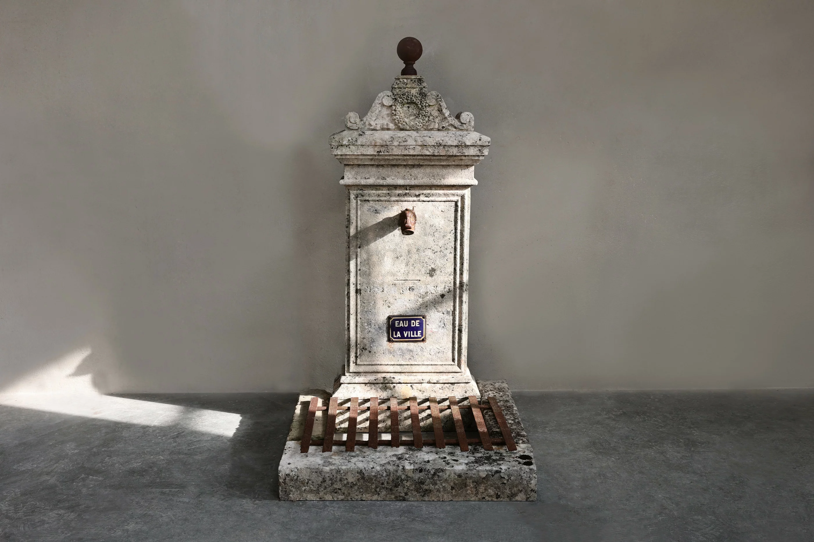 Deze charmante kalkstenen fontein werd begin 20e eeuw gebruikt als publieke waterpomp in een Zuid-Frans dorp. Het geprofileerde lijf met klassiek fronton, bolornament en de gietijzeren roosters op de opvangsokkel geven dit object een sterk architectonisch karakter.
