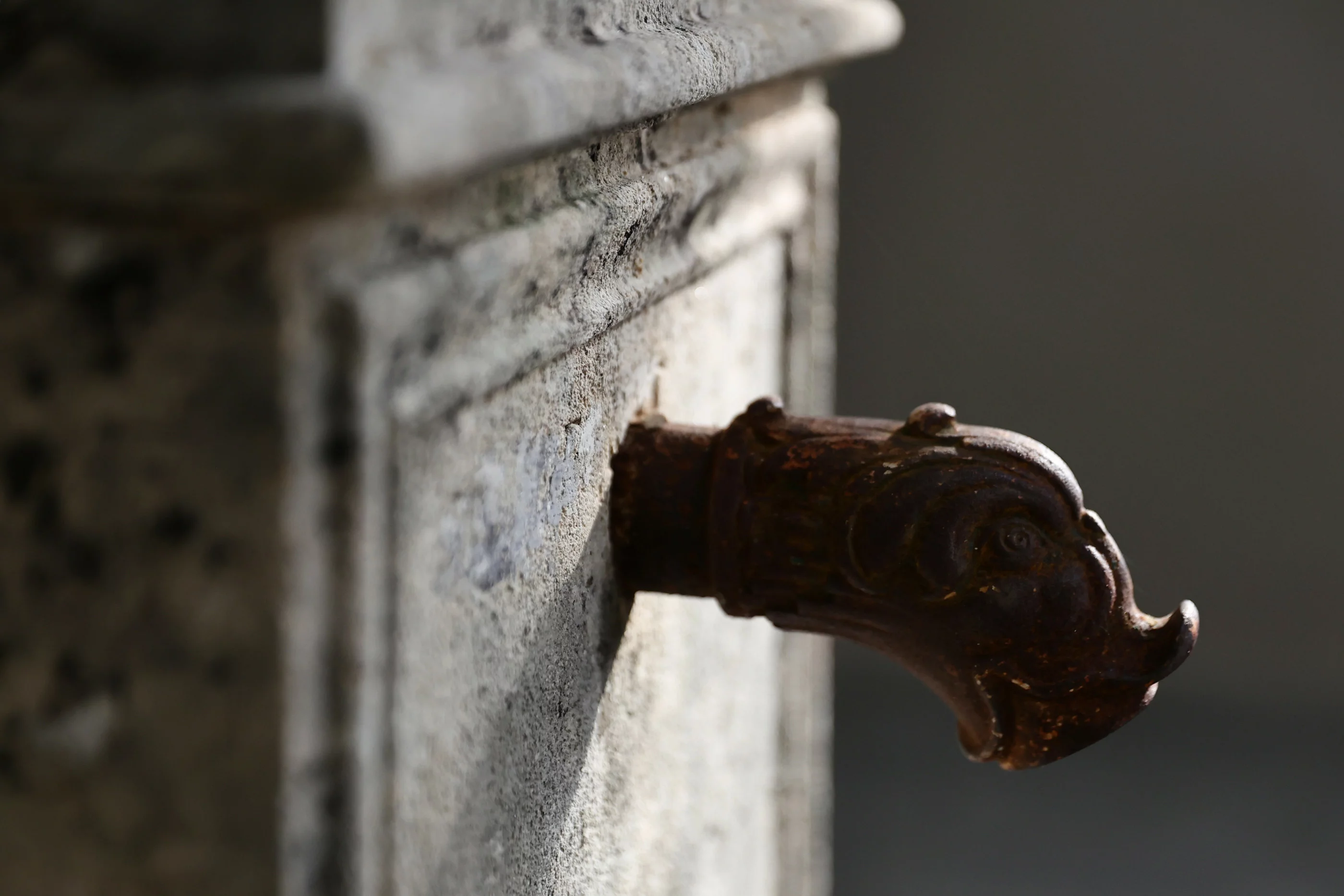 Zeldzame wandfontein met ijzeren rooster en bronzen uitloop