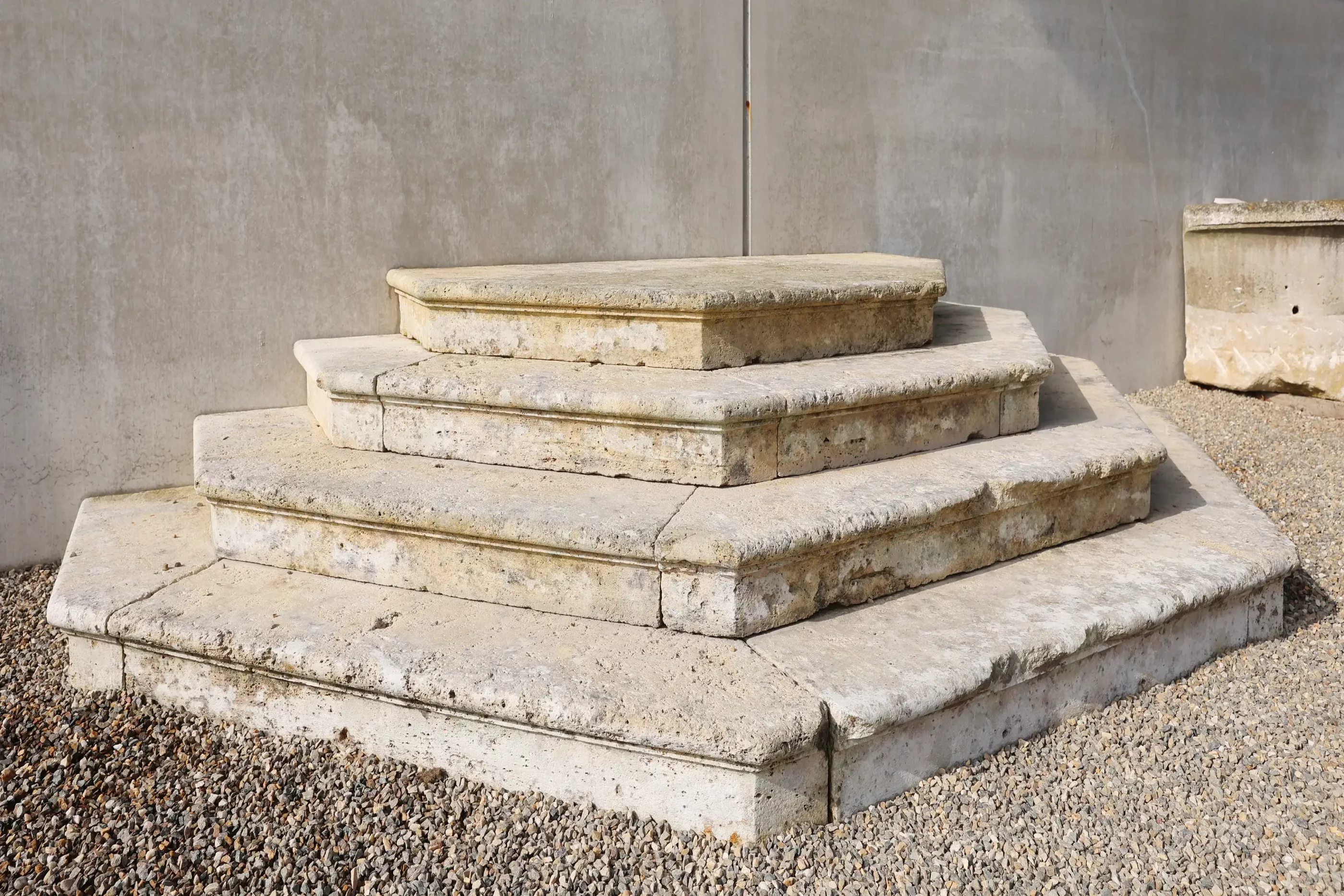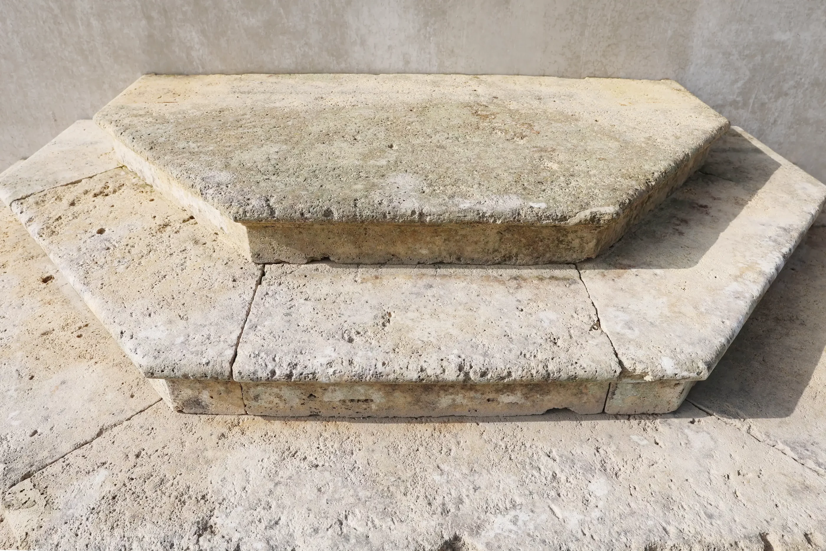 De verschillende niveaus zorgen voor een speels, architectonisch effect en maken deze trap geschikt als toegang tot een terras, entree of verhoogd tuinonderdeel. De kalksteen vertoont authentieke slijtage, kleurvariaties en kleine onregelmatigheden die bijdragen aan het karakter.