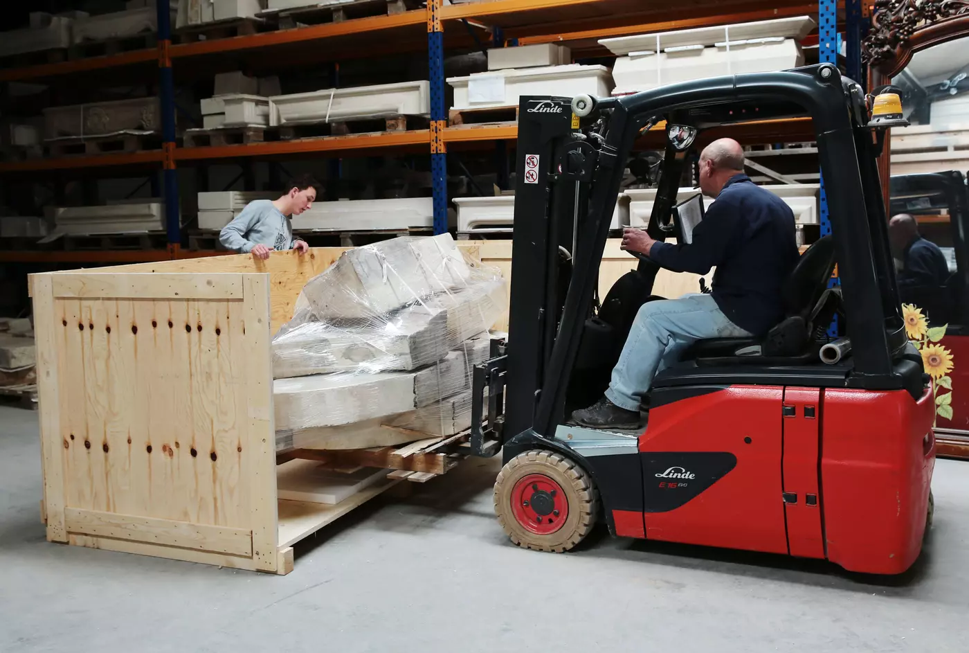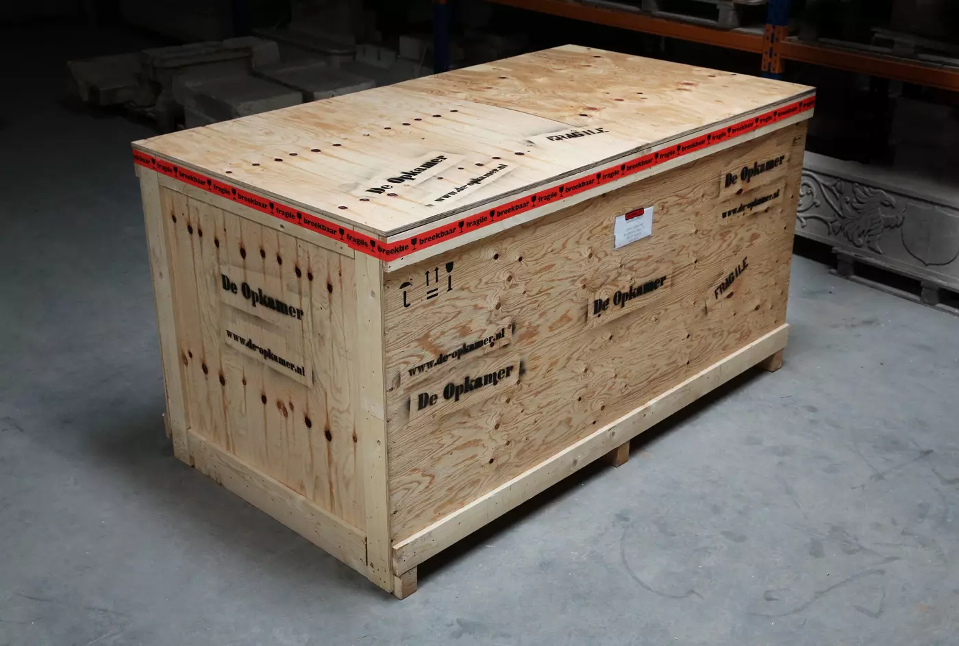 Al onze antieke schouwen, vloeren en bouwmaterialen worden in eigen beheer zorgvuldig verpakt voor veilig transport – of het nu gaat om een levering binnen Europa of verzending overzee. In ons atelier bouwen wij maatwerk houten kratten die perfect zijn afgestemd op het gewicht, formaat en kwetsbaarheid van elk object. Voor internationale zendingen per schip of vliegtuig voldoen wij aan alle geldende exportvoorschriften. Onze kratten zijn gemaakt van fumigated wood en voorzien van de vereiste ISPM 15-markeringen, zodat ze wereldwijd probleemloos ingevoerd kunnen worden – ook in streng gereguleerde landen zoals de Verenigde Staten, Australië en het Verenigd Koninkrijk. Of het nu gaat om één schouw of een volledige vloer: wij zorgen ervoor dat uw bestelling veilig, stabiel en internationaal erkend verpaktProfessionele crating service & exportklare verpakking