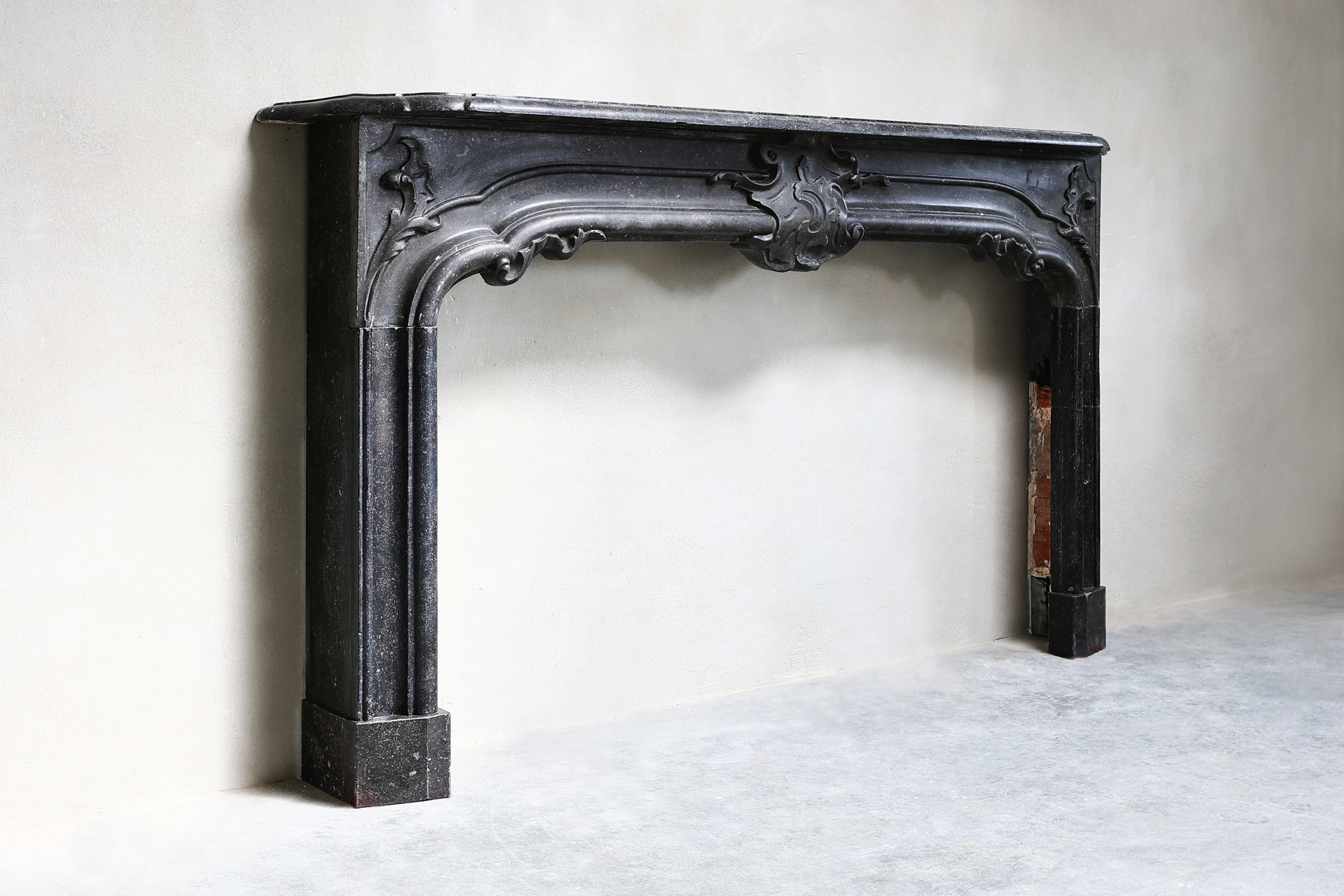 Prachtig gedecoreerde schouw van Belgisch hardsteen uit de 19e eeuw met een breedt van maar liefst 208 cm. Deze schouw is in stijl van Louis XVI. Een mooie opvallende schouw met ornamenten in het midden van het frontgedeelte en op de benen.