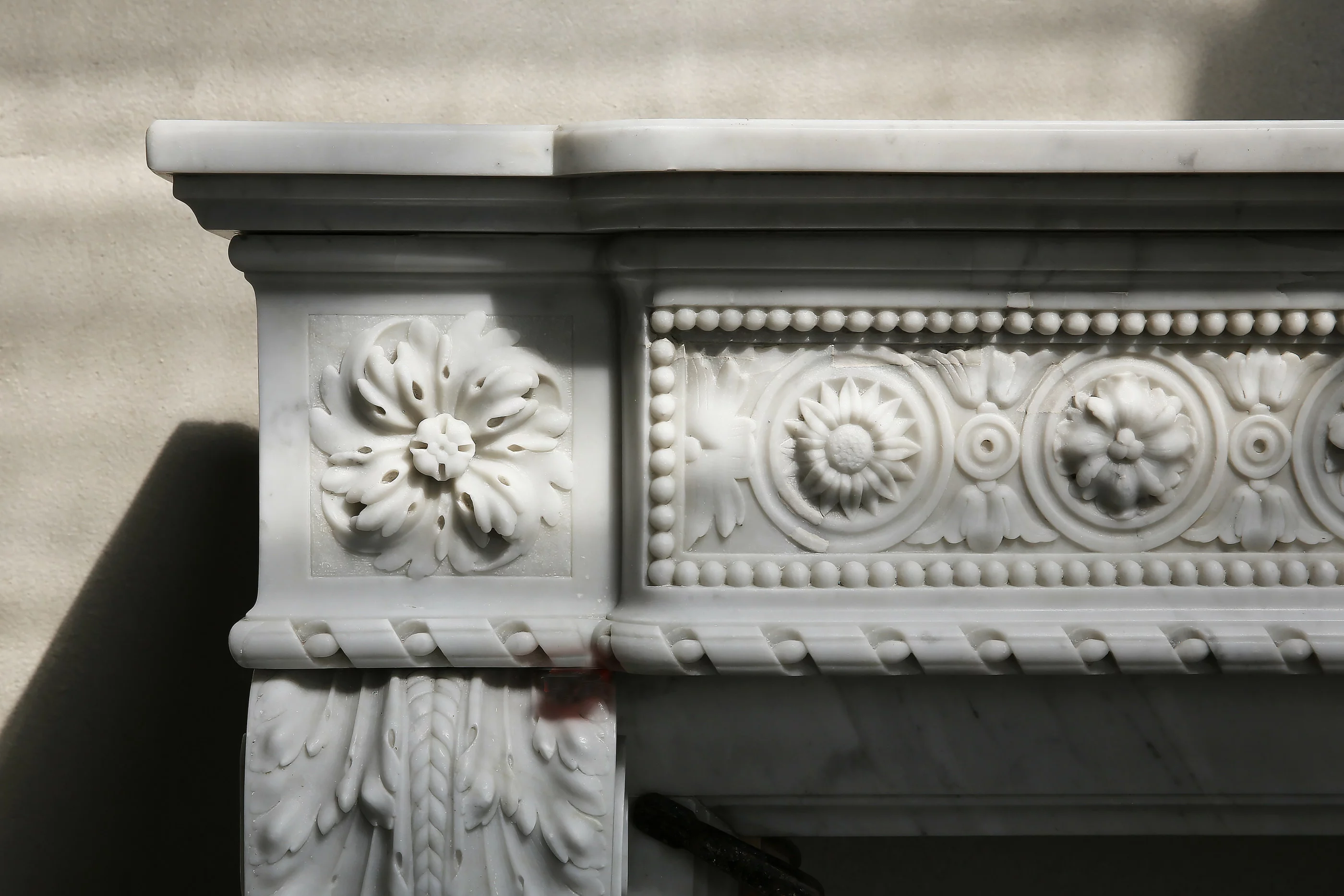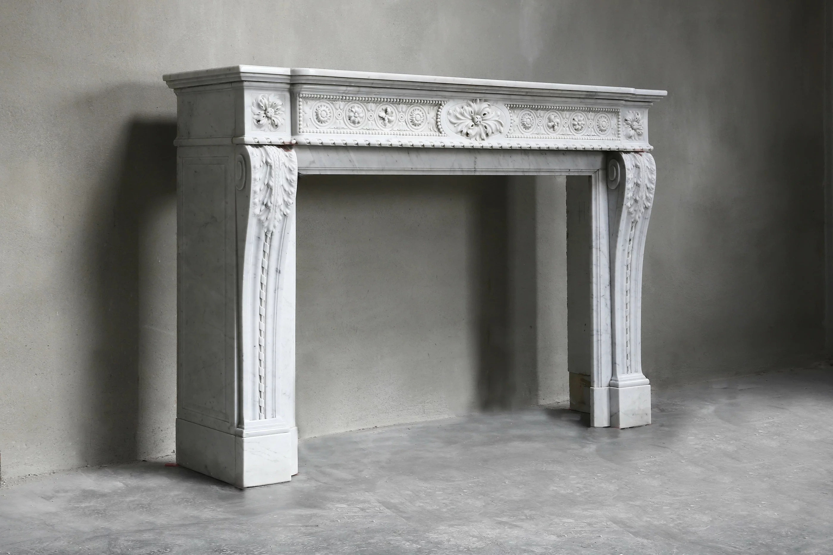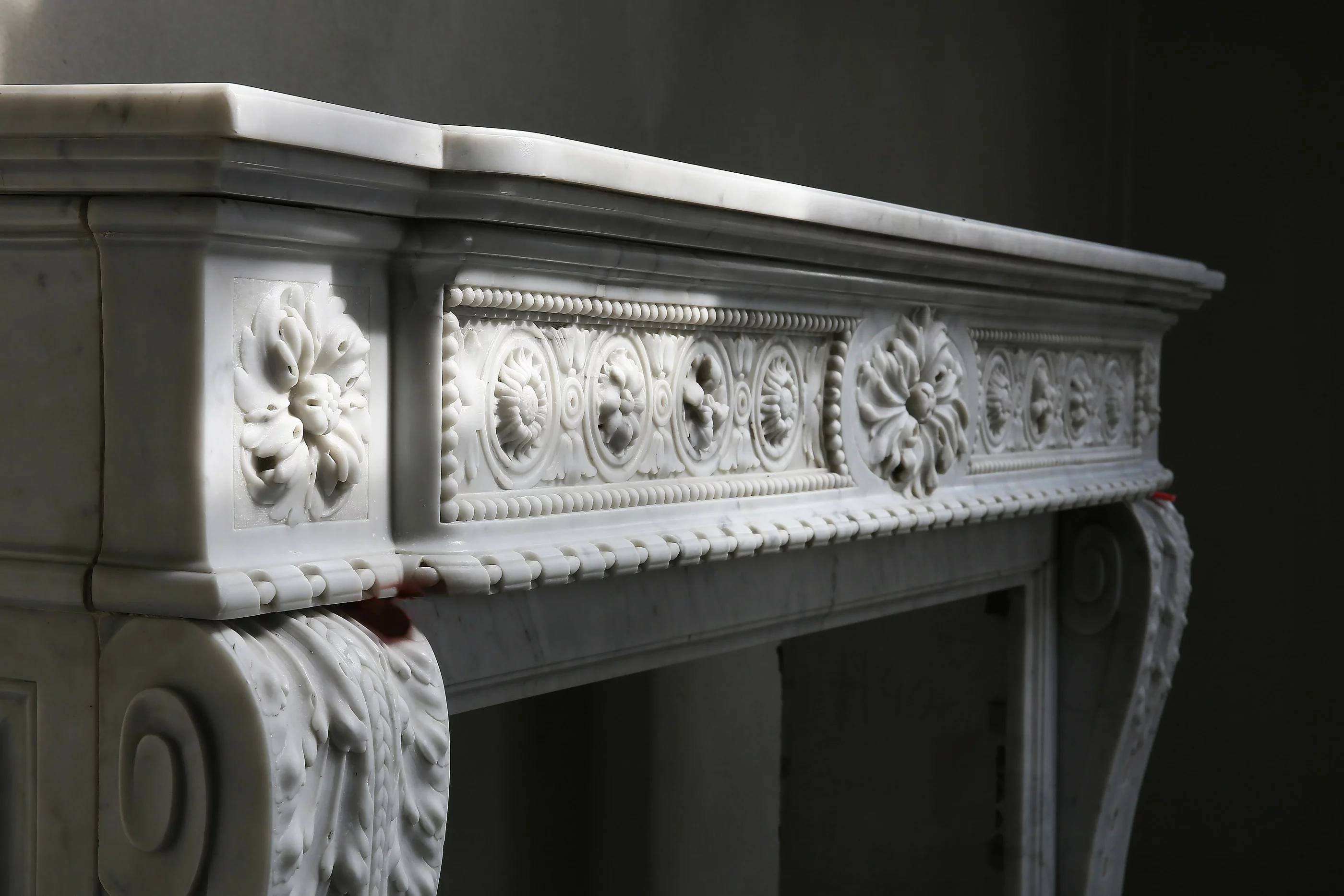 Bijzondere en exclusieve antieke schouw van Carrara marmer! Deze schouw in stijl van Louis XVI stamt uit de 18e eeuw. Het bovenblad is rijkelijk versierd met diverse elegante ornamenten. De benen zijn voorzien van acanthusbladeren en zijn licht gebogen. Een hele sierlijke en elegante schouw met een chique uitstraling.