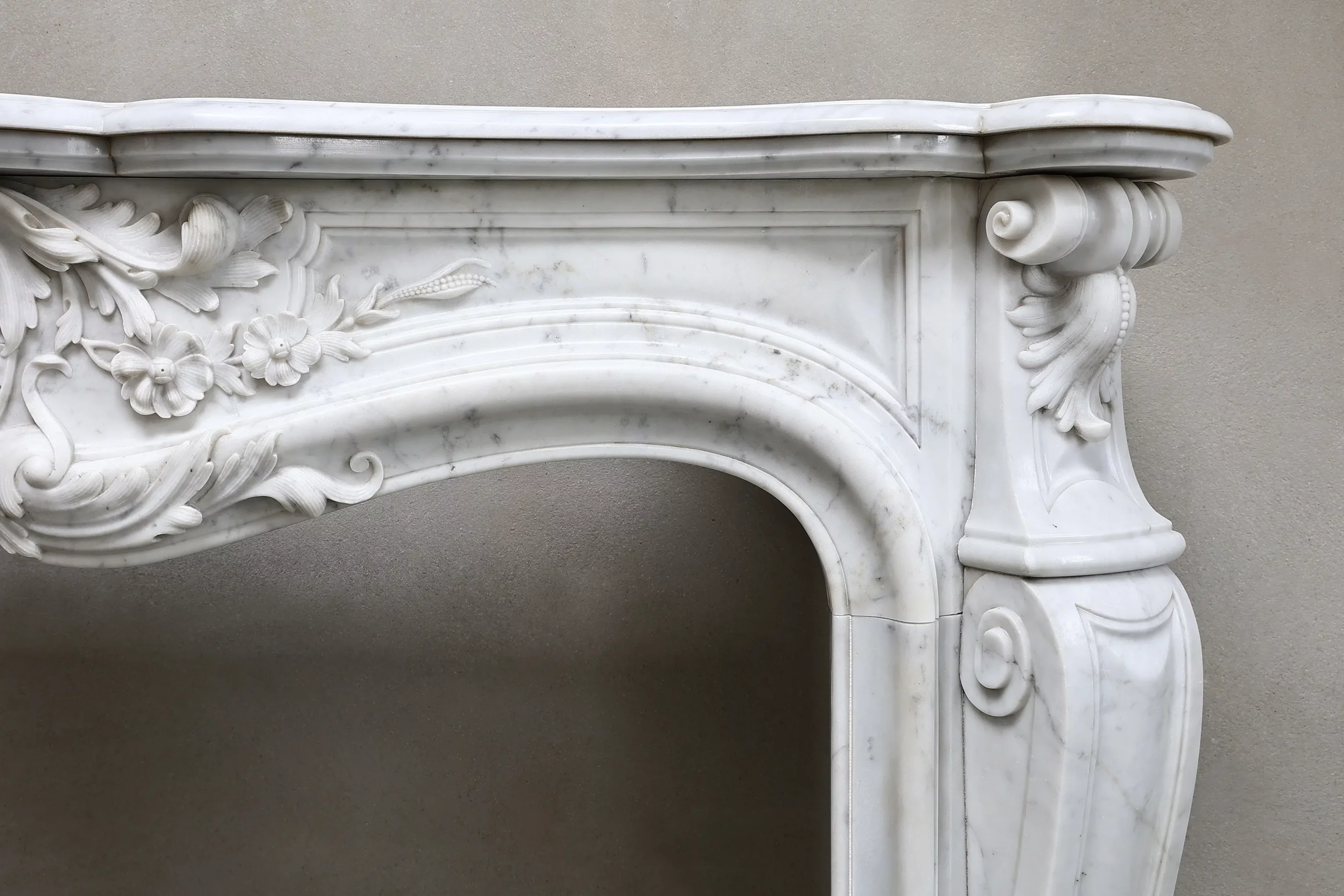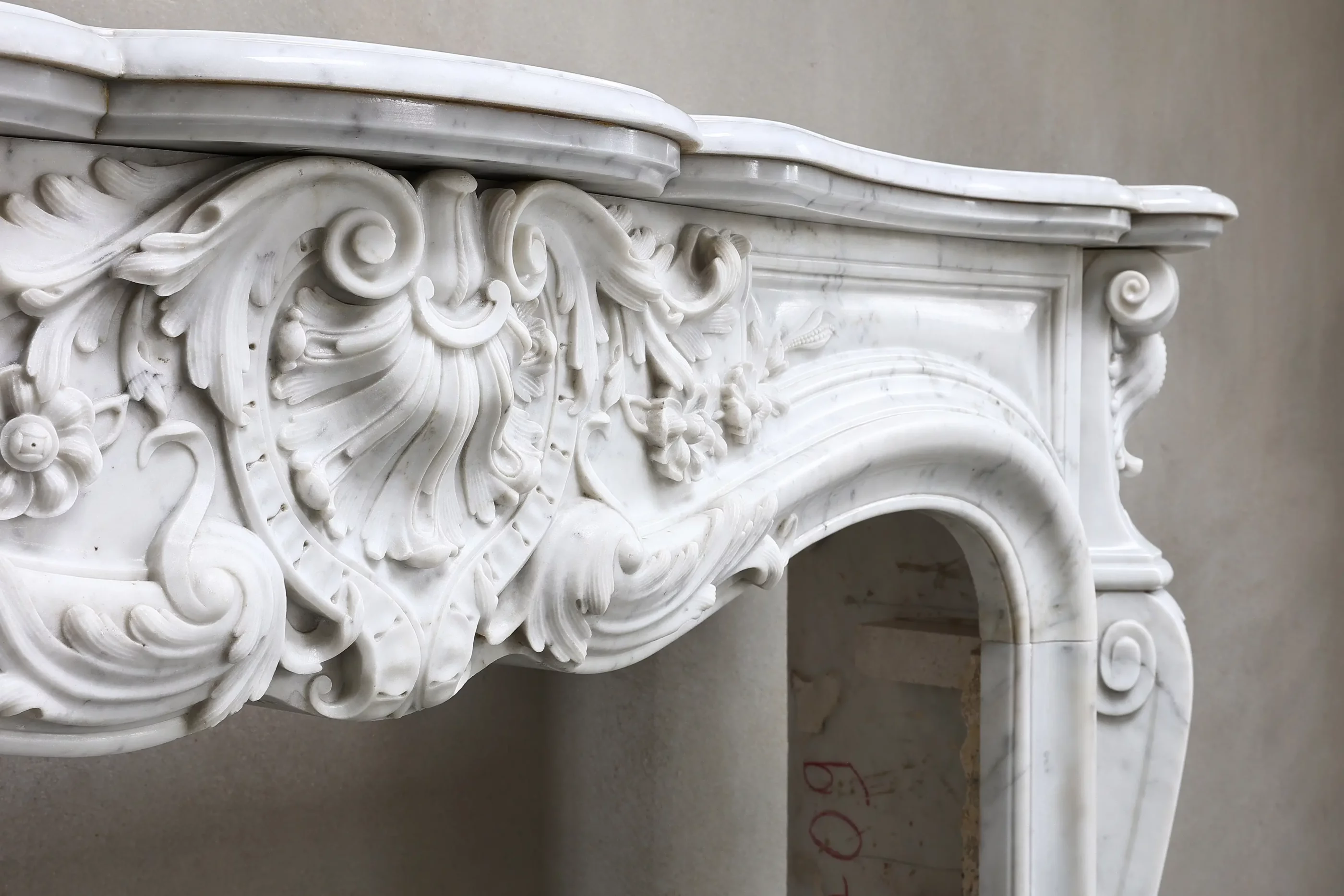 Prachtige, exclusieve antieke open haard van Carrara-marmer uit Italië! Deze 19e-eeuwse open haard is uitgevoerd in de stijl van Lodewijk XV en rijkelijk versierd met diverse ornamenten aan de voorzijde en op de poten. Een stijlvolle open haard uit onze collectie.