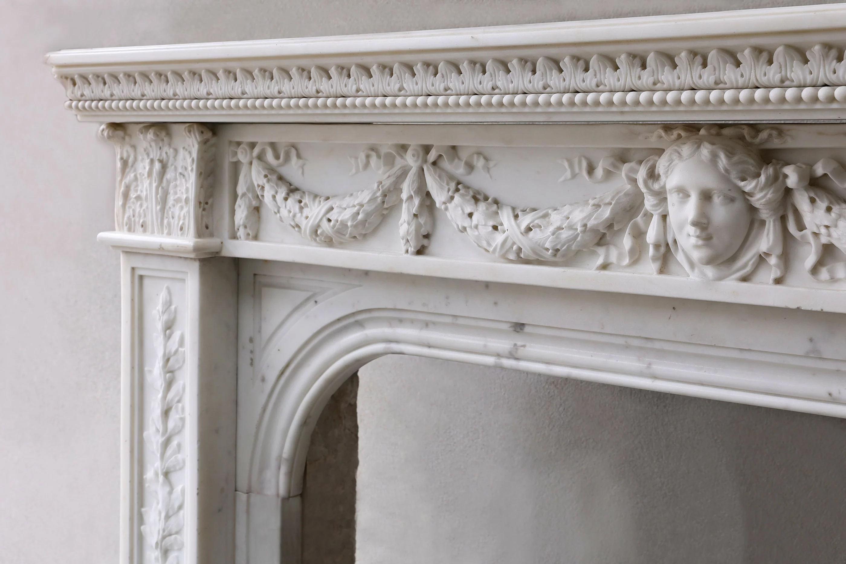 De schouw is rijk versierd met guirlandes, bladmotieven en een centraal vrouwenmasker, geheel in de kenmerkende neoklassieke stijl. Dankzij de ambachtelijke afwerking en het hoogwaardige materiaal is dit een uniek stuk dat zowel esthetische als duurzame waarde biedt.