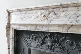 De schouw is uitgevoerd in Escalette marmer met contrasterende aders en zorgvuldig gesneden Louis XVI-details. De rozetten en het cartouche geven reliëf en ritme, terwijl de hoofdvorm rustig en symmetrisch blijft.