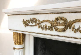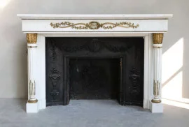 Deze vroege 19e‑eeuwse antieke marmeren schouw combineert de elegantie van de Louis XVI-stijl met het monumentale karakter van het Empire-tijdperk. De pijlvormige zuilen en vergulde bronzen ornamenten verwijzen naar het ontwerp uit het Zilveren Boudoir van het Château de Fontainebleau. Deze schouw is afkomstig uit het Franse Château de la Gesse, nabij Boulogne-sur-Gesse.