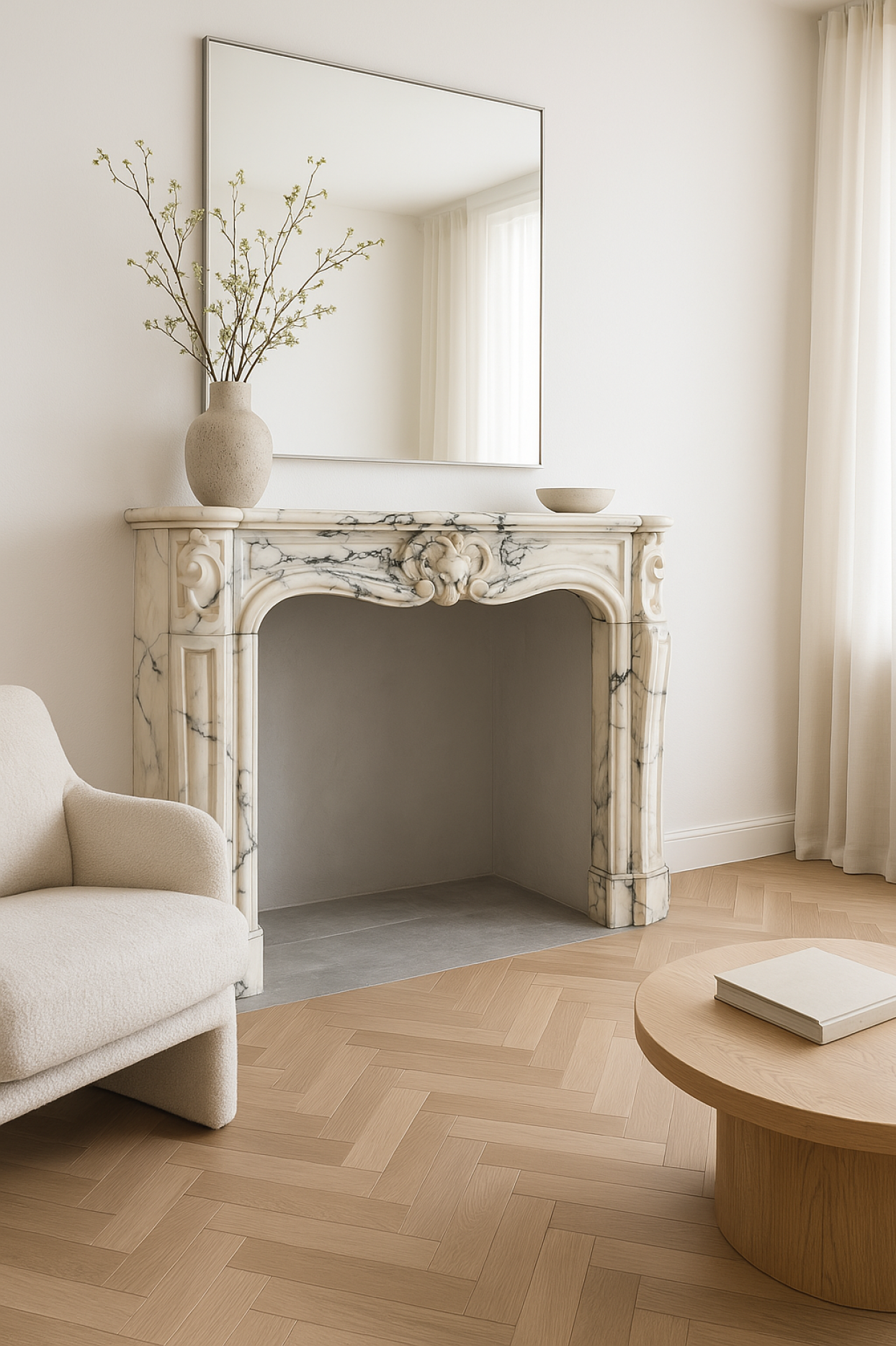 Historisch werd dit marmer veel gebruikt in Franse interieurarchitectuur en prestigieuze gebouwen. In combinatie met de sierlijke lijnen van de Louis XV-schouw komt het materiaal volledig tot zijn recht. De natuurlijke elegantie van Paonazzo draagt bij aan de authentieke charme en tijdloze waarde van deze haard.