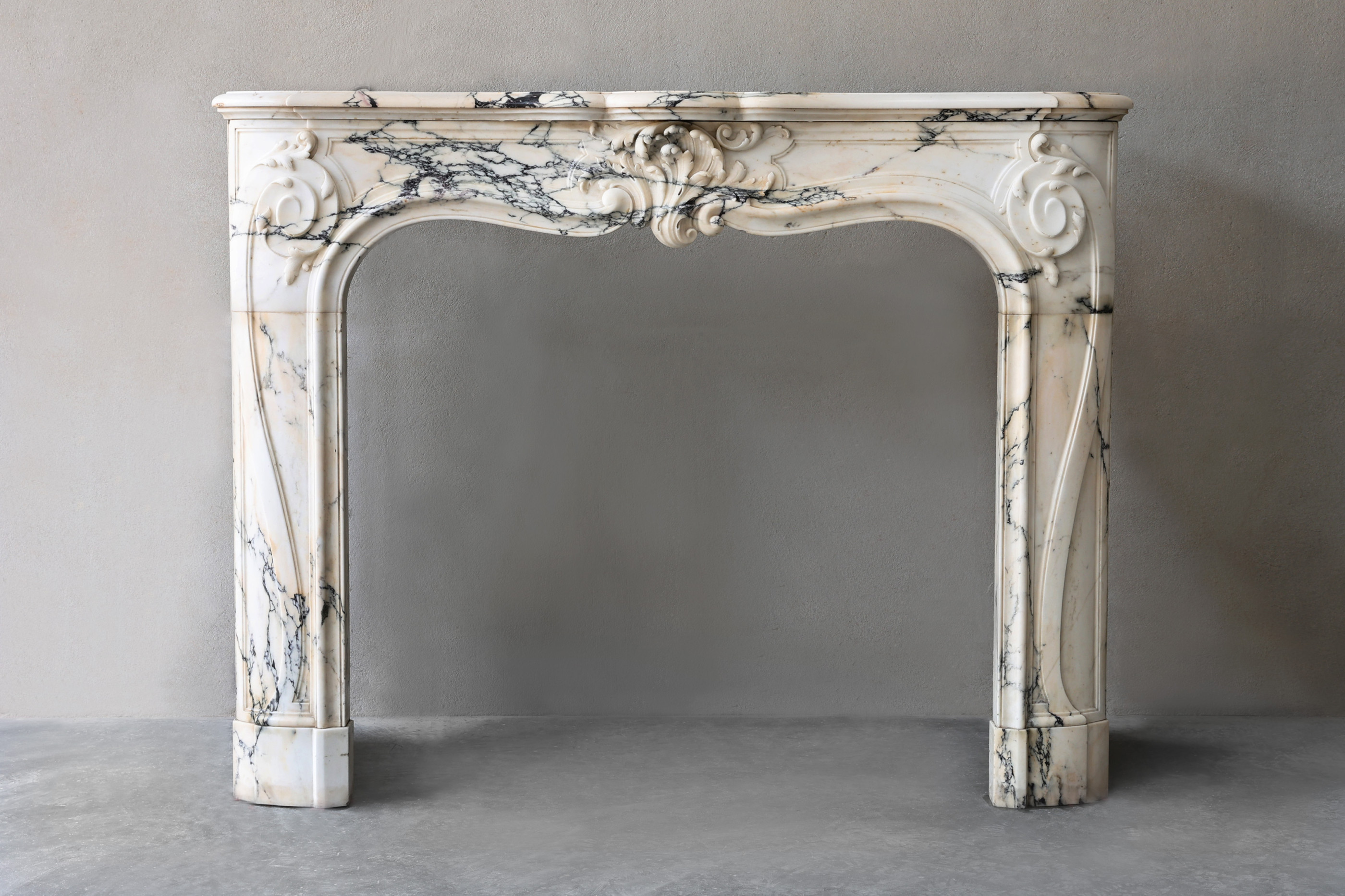 Deze antieke marmeren schouw is een origineel stuk uit de tweede helft van de 19e eeuw, afkomstig uit Parijs. Het ontwerp is volledig in lijn met de sierlijke Louis XV-stijl, gekenmerkt door vloeiende lijnen, symmetrie en een verfijnde afwerking. De haard is vervaardigd uit het zeldzame Paonazzo-marmer, herkenbaar aan zijn lichte achtergrond en opvallende aders in zwart, goud en grijs.