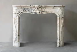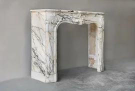 Deze antieke marmeren schouw is een origineel stuk uit de tweede helft van de 19e eeuw, afkomstig uit Parijs. Het ontwerp is volledig in lijn met de sierlijke Louis XV-stijl, gekenmerkt door vloeiende lijnen, symmetrie en een verfijnde afwerking. De haard is vervaardigd uit het zeldzame Paonazzo-marmer, herkenbaar aan zijn lichte achtergrond en opvallende aders in zwart, goud en grijs.