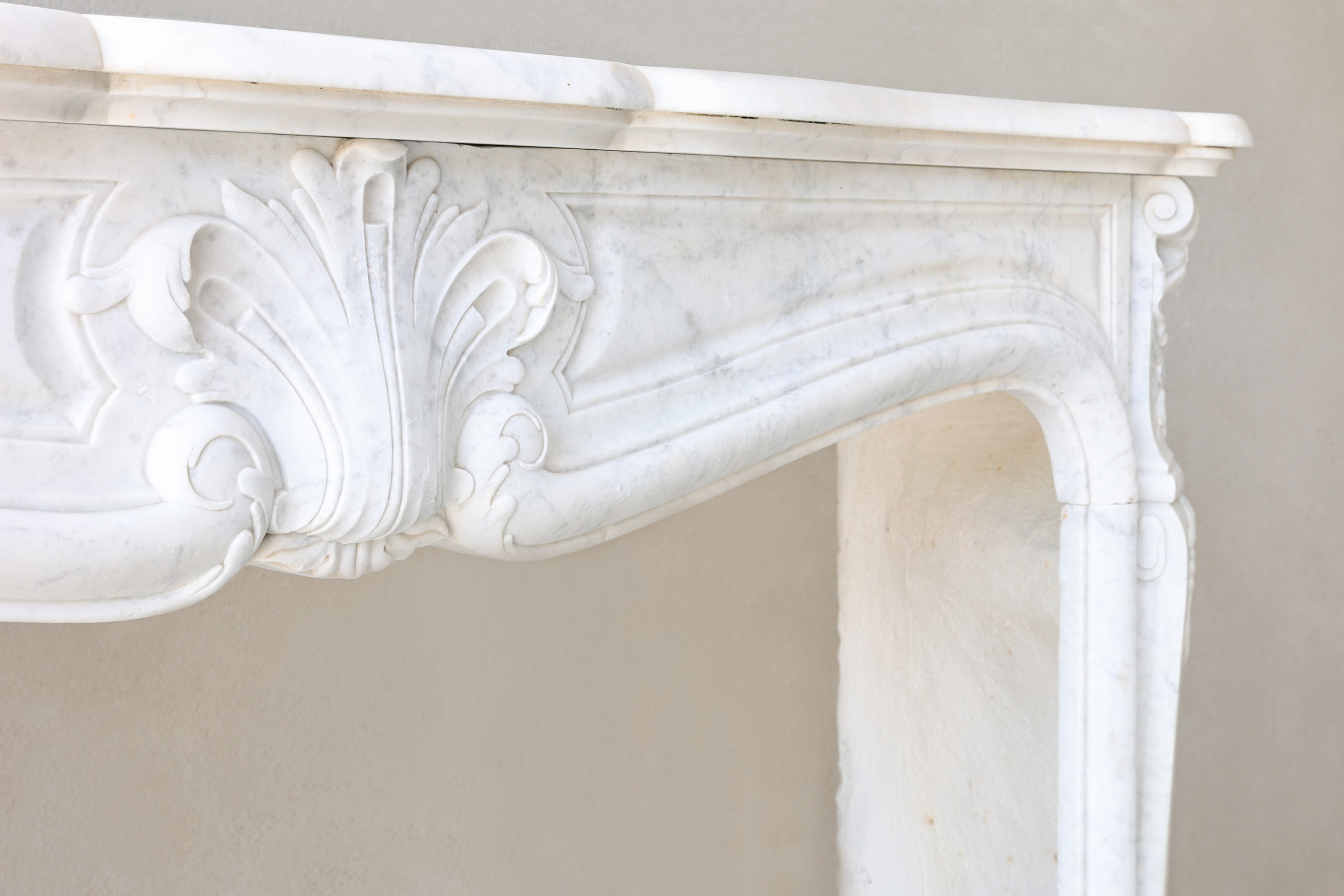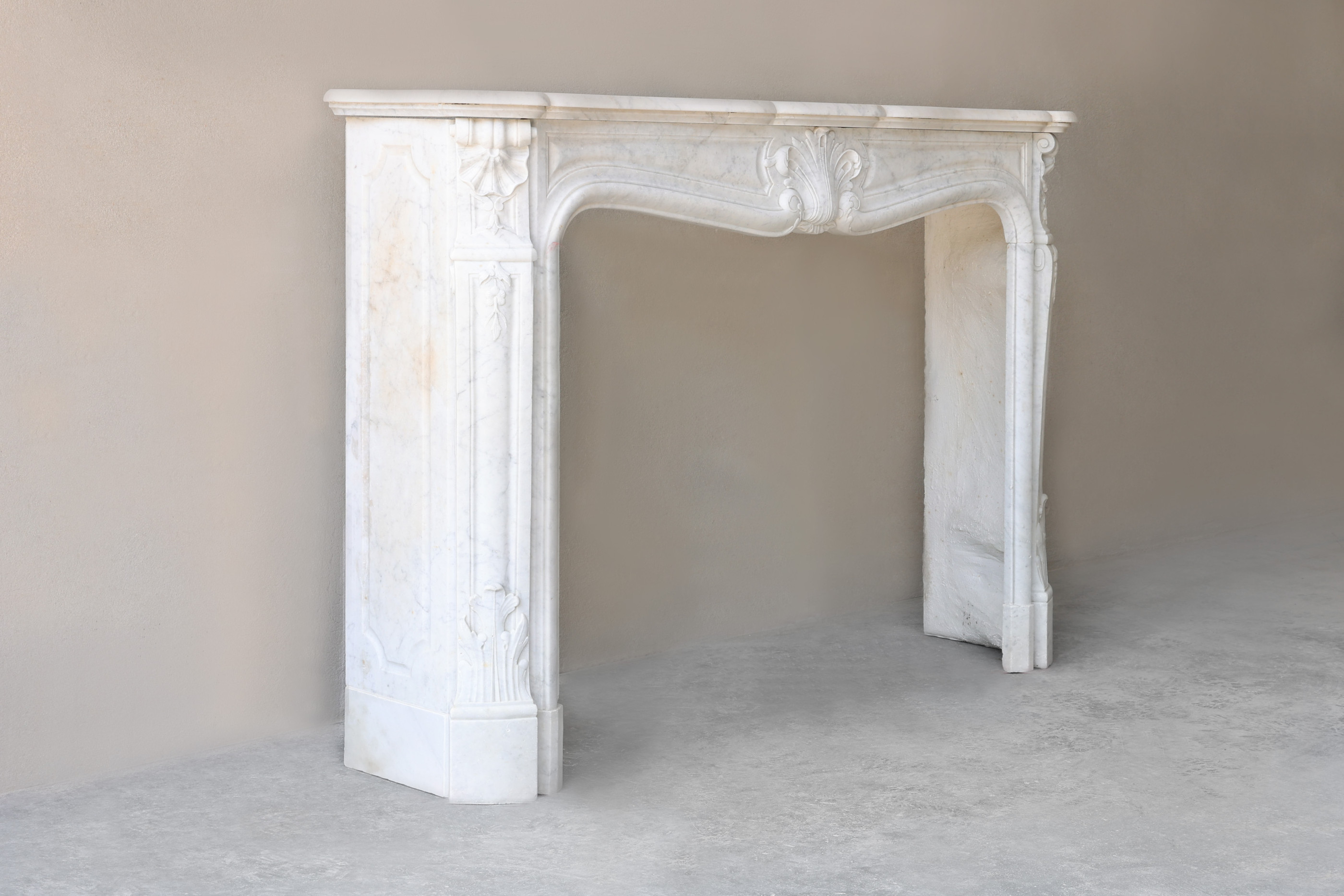Dit 19e-eeuwse meesterstuk in Carrara marmer verenigt Franse elegantie met tijdloze rust. De zacht golvende bovenregel en het centrale schelpornament (rocaille) maken de schouw tot een architecturaal middelpunt. Met haar serene wit en fijne adering brengt zij licht en waardigheid in elk project – van historisch herenhuis tot modern minimalistisch interieur.