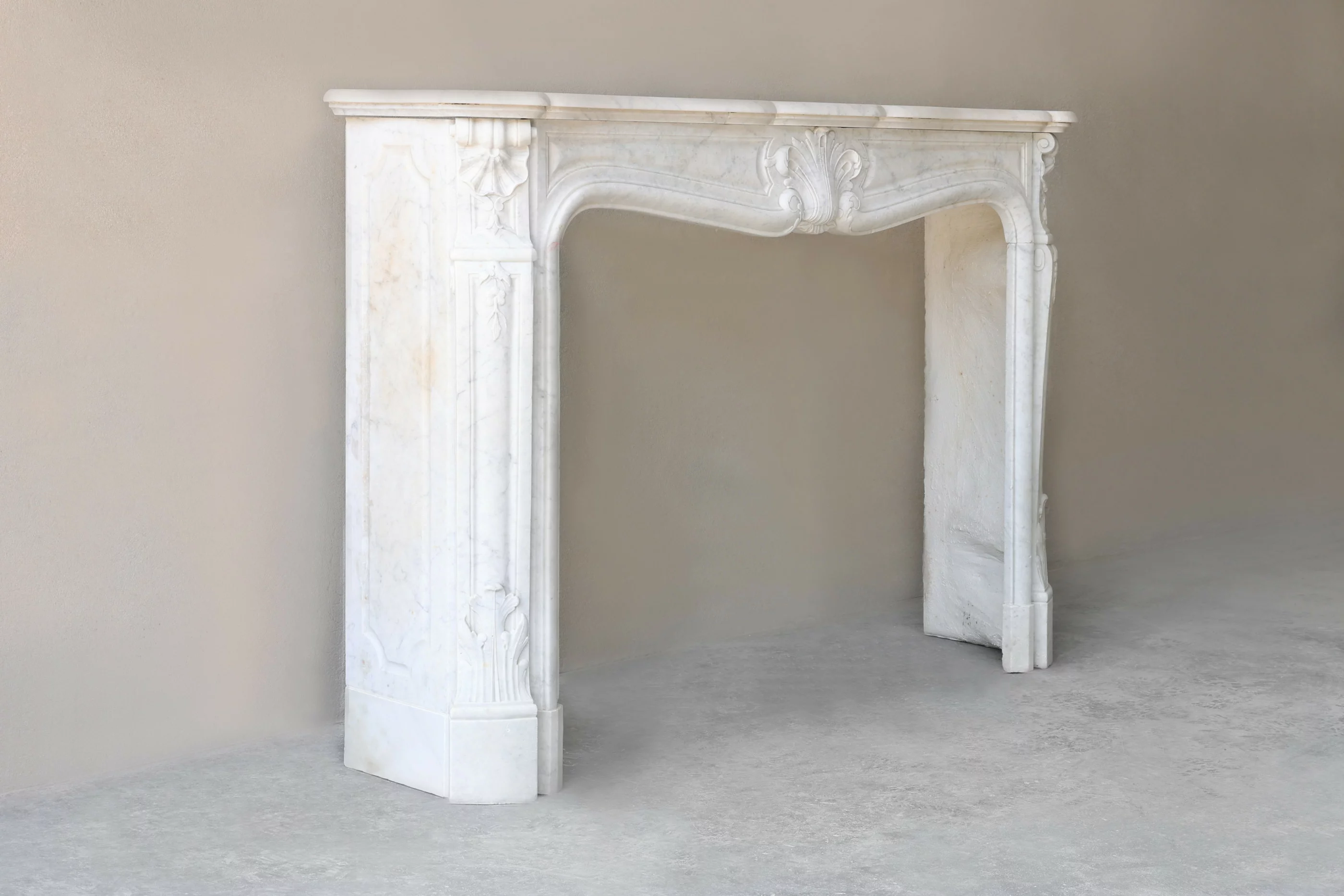 Deze antieke schouwmantel is uitgewerkt in puur Carrara marmer, het beeldhouwgesteente dat al sinds de Renaissance geliefd is om zijn fijne korrel en subtiele glans. De organische profileringen en de gracieuze schelp in het midden brengen de speelsheid van de Louis XV-periode tot leven zonder overdaad—ideaal voor interieurs waar verfijning en rust de boventoon voeren.