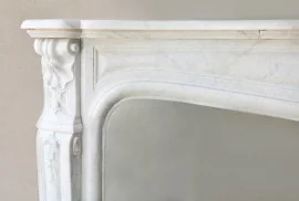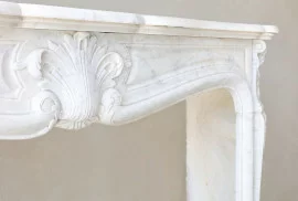 Dit 19e-eeuwse meesterstuk in Carrara marmer verenigt Franse elegantie met tijdloze rust. De zacht golvende bovenregel en het centrale schelpornament (rocaille) maken de schouw tot een architecturaal middelpunt. Met haar serene wit en fijne adering brengt zij licht en waardigheid in elk project – van historisch herenhuis tot modern minimalistisch interieur.