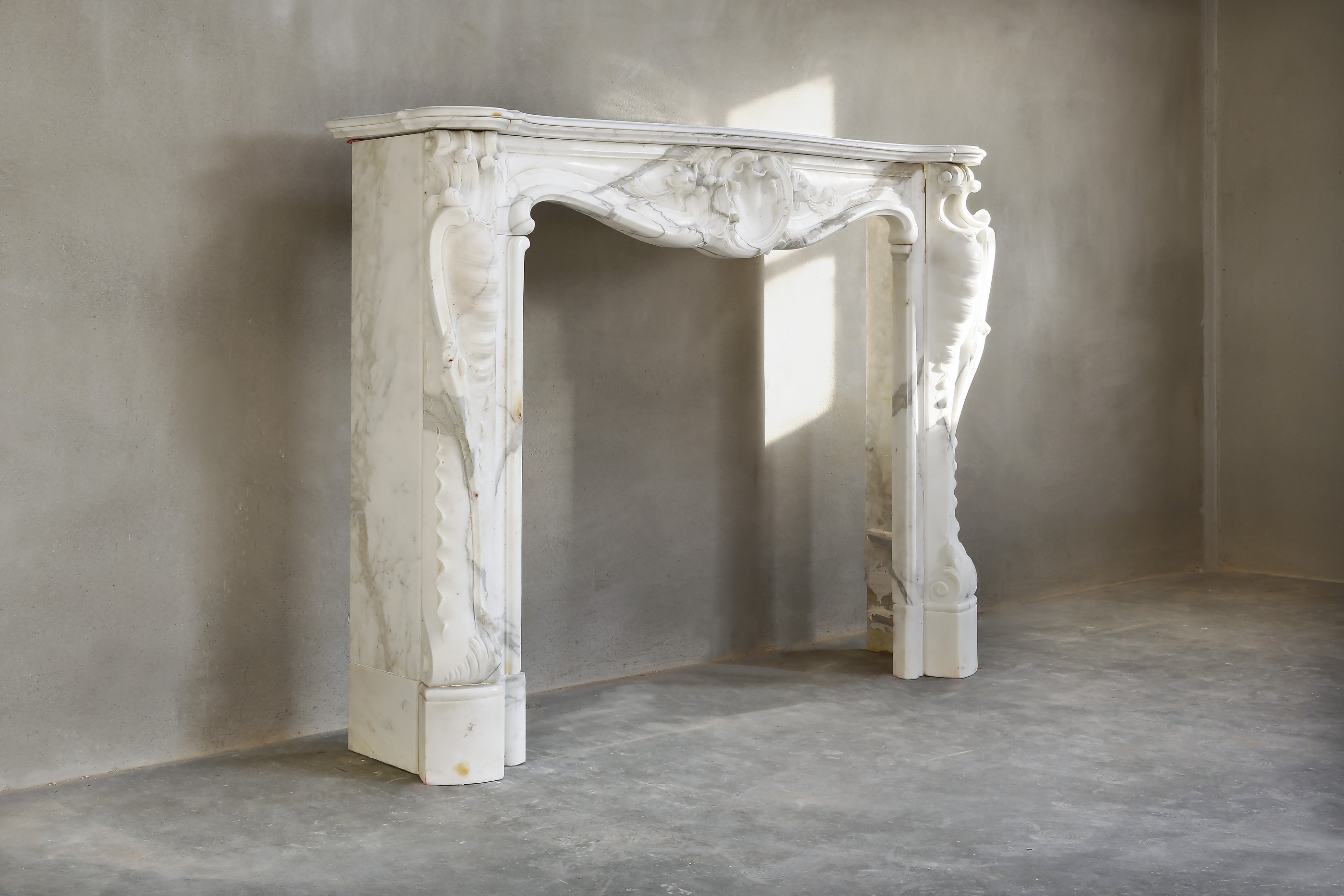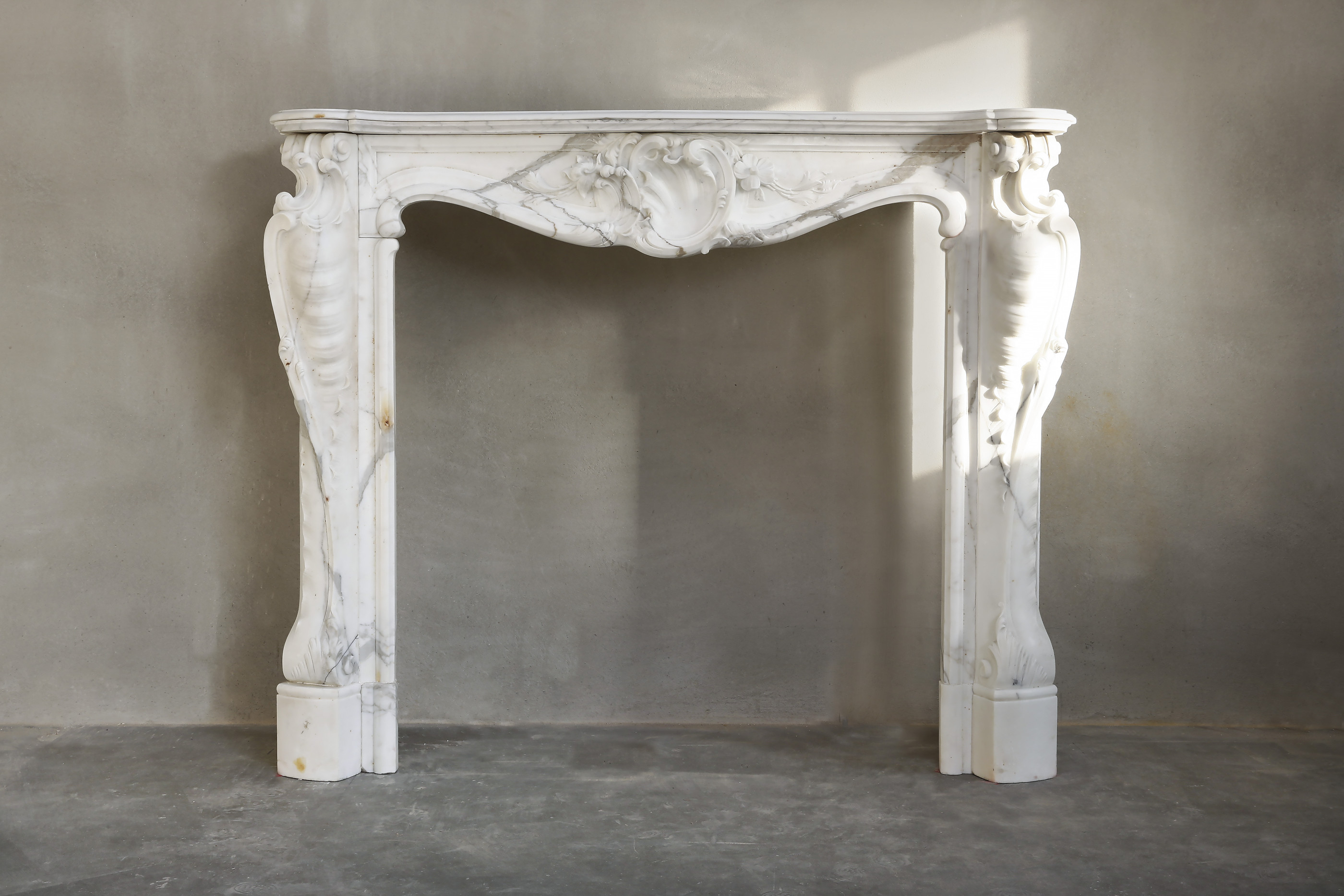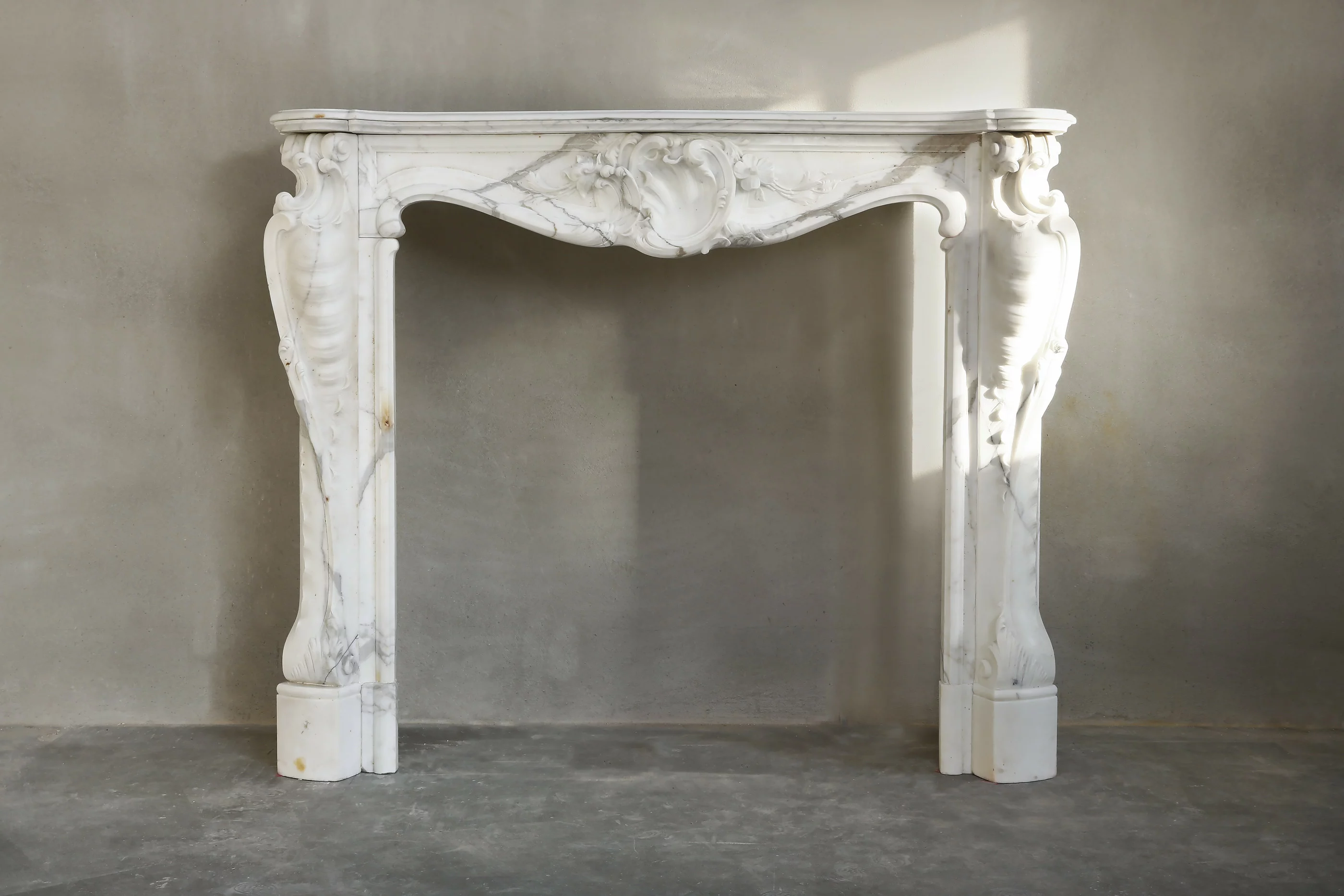 Een zeer mooie antieke schouw van statuario marmer. Deze marmersoort is afkomstig uit Italië en heeft lichte aderen. De schouw stamt uit de 19e eeuw en is in stijl van Louis XV. Dit type schouw is vaak voorzien van een coquille in het midden van het frontgedeelte en rijkelijk versierde benen.