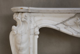 Een zeer mooie antieke schouw van statuario marmer. Deze marmersoort is afkomstig uit Italië en heeft lichte aderen. De schouw stamt uit de 19e eeuw en is in stijl van Louis XV. Dit type schouw is vaak voorzien van een coquille in het midden van het frontgedeelte en rijkelijk versierde benen.