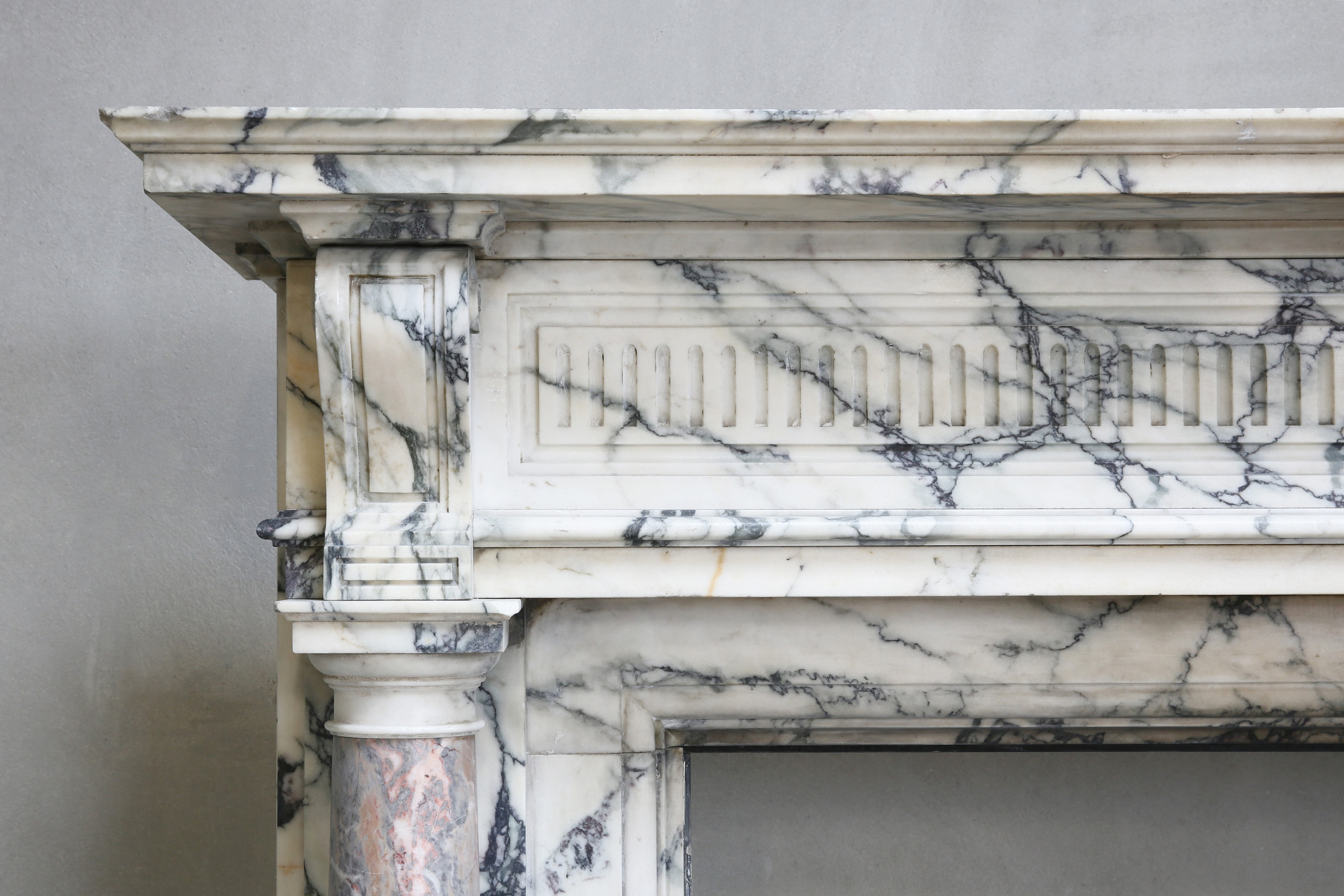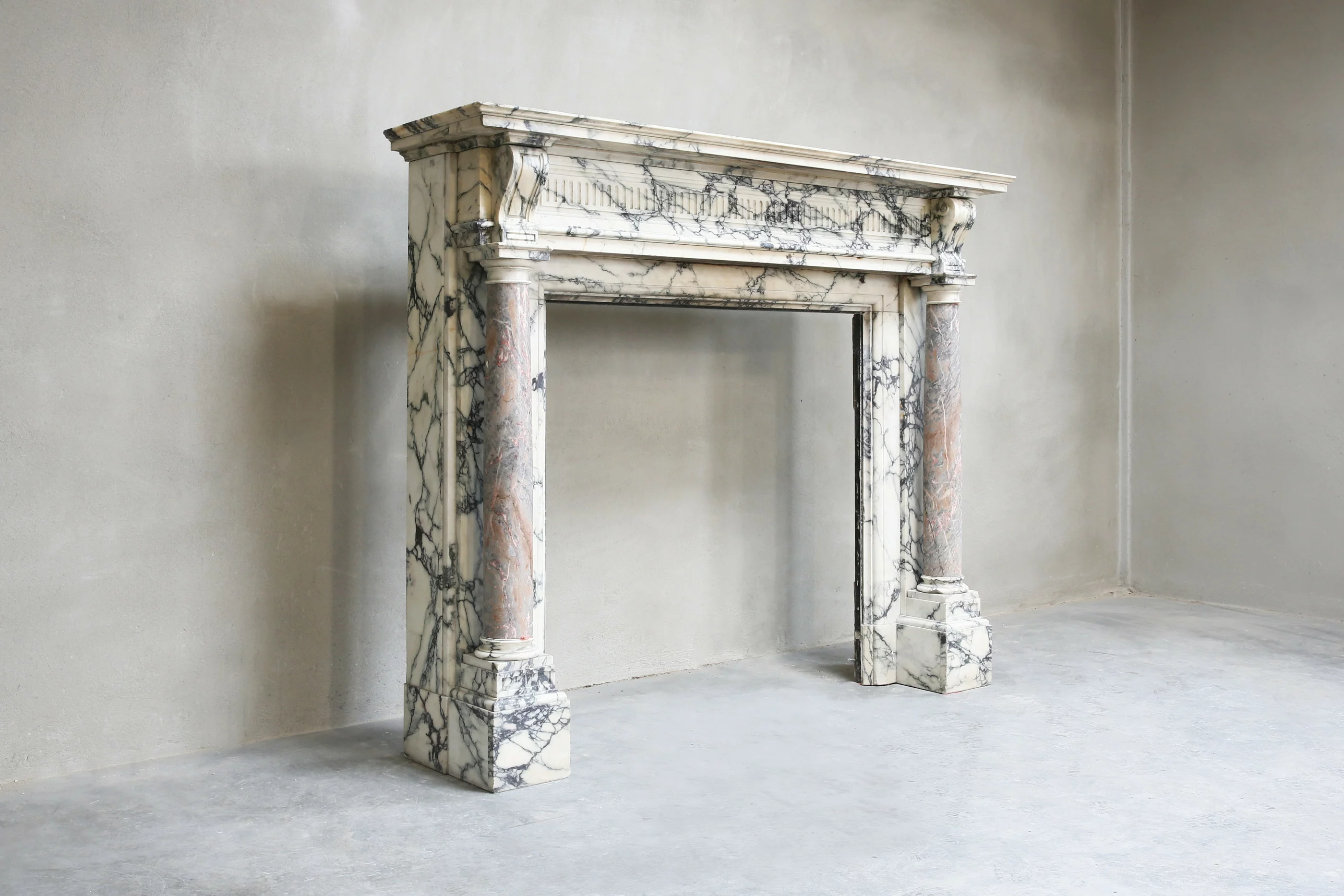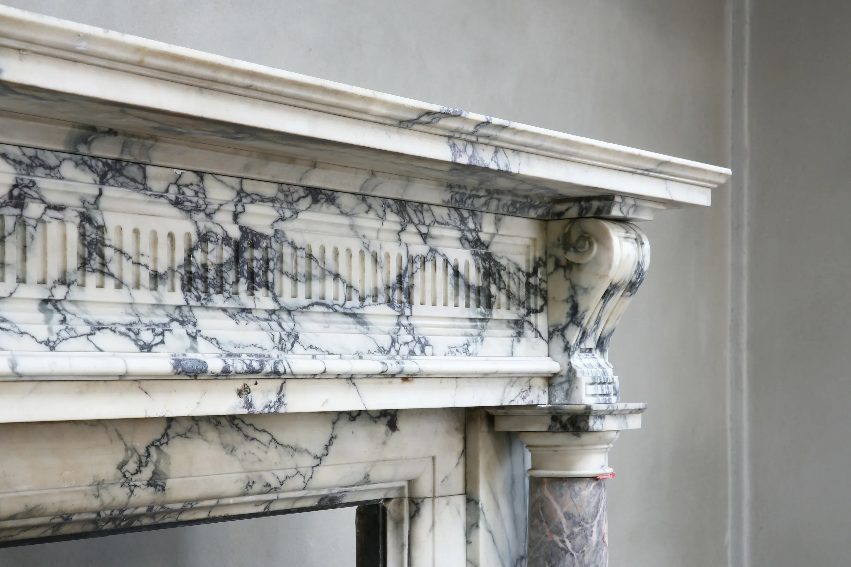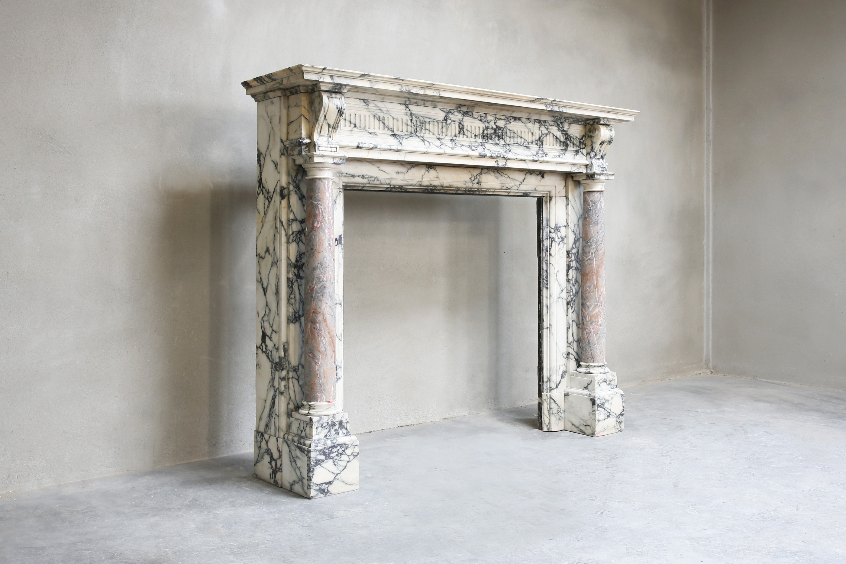 Met trots presenteren wij u deze prachtige antieke marmeren schouw! Een juweeltje binnen onze collectie. Deze schouw is vervaardigd uit twee exclusieve marmersoorten: het grootste gedeelte bestaat uit Paonazzo marmer en de twee pilaren op de benen zijn voorzien van Sarrancolin marmer. Een rijkelijk versierde schouw met een charismatische uitstraling. Deze schouw dateert uit het jaar 1880 en is in stijl van Louis XVI.