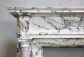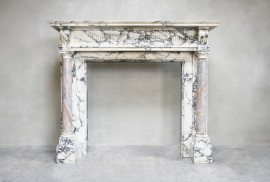 Met trots presenteren wij u deze prachtige antieke marmeren schouw! Een juweeltje binnen onze collectie. Deze schouw is vervaardigd uit twee exclusieve marmersoorten: het grootste gedeelte bestaat uit Paonazzo marmer en de twee pilaren op de benen zijn voorzien van Sarrancolin marmer. Een rijkelijk versierde schouw met een charismatische uitstraling. Deze schouw dateert uit het jaar 1880 en is in stijl van Louis XVI.