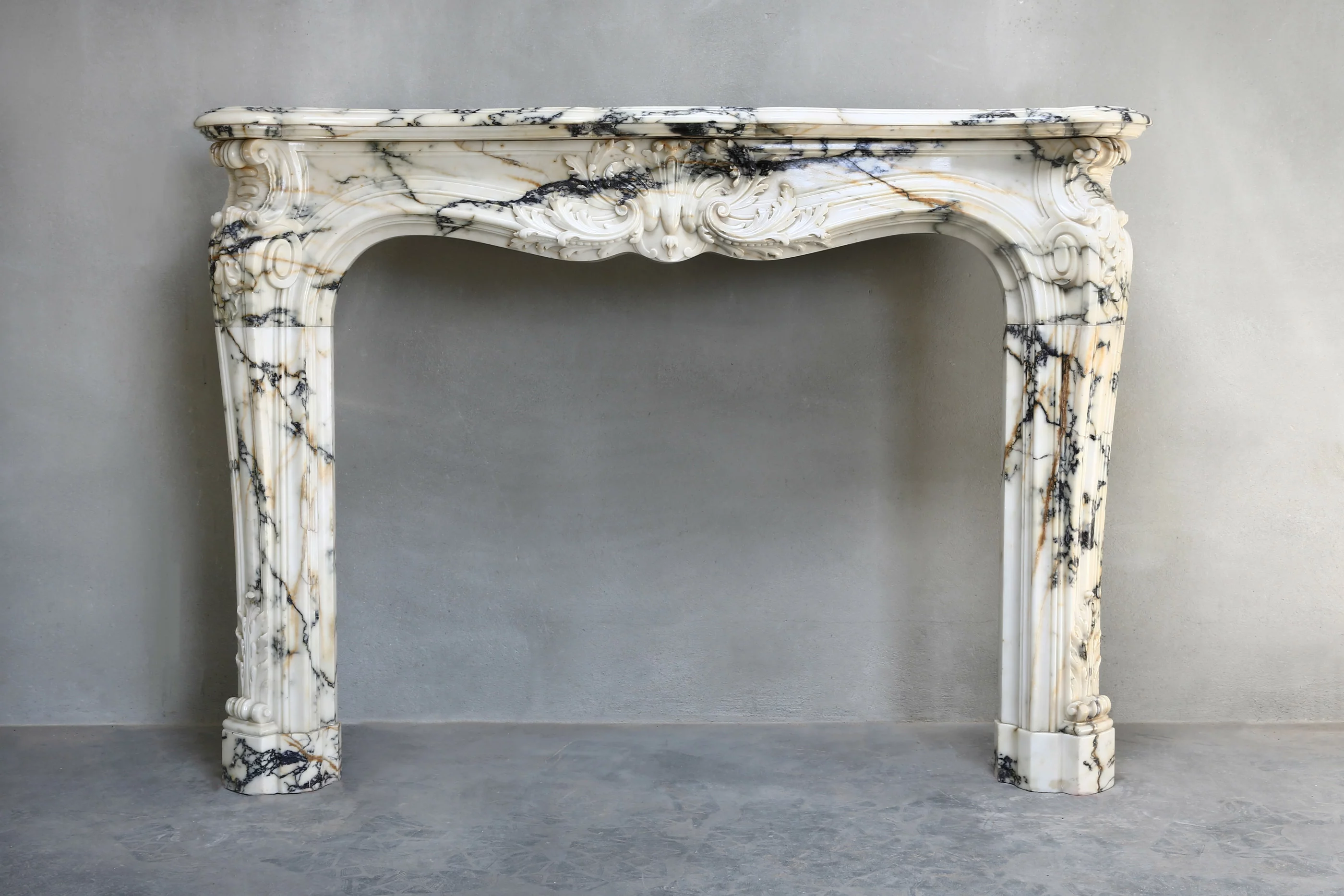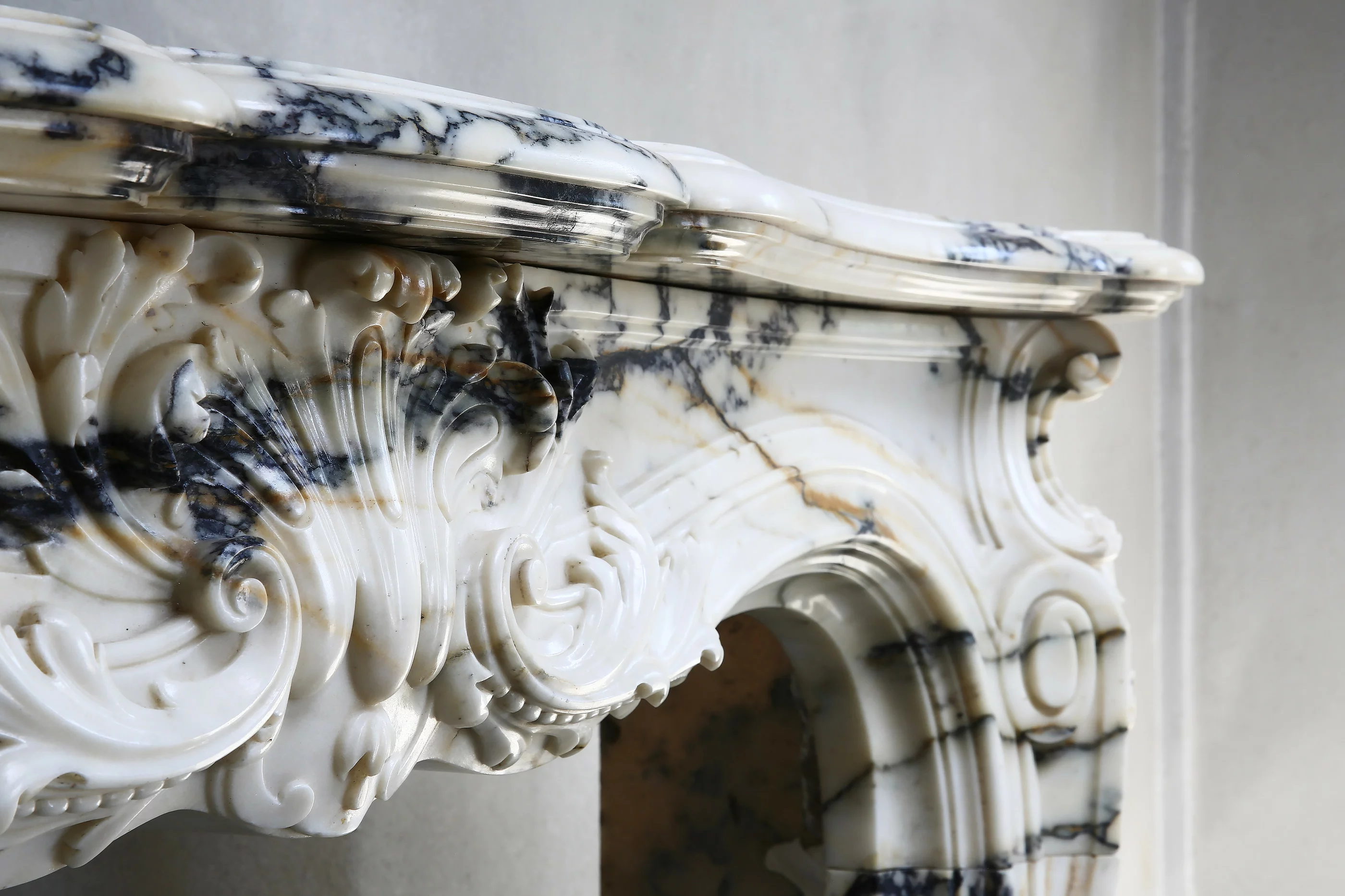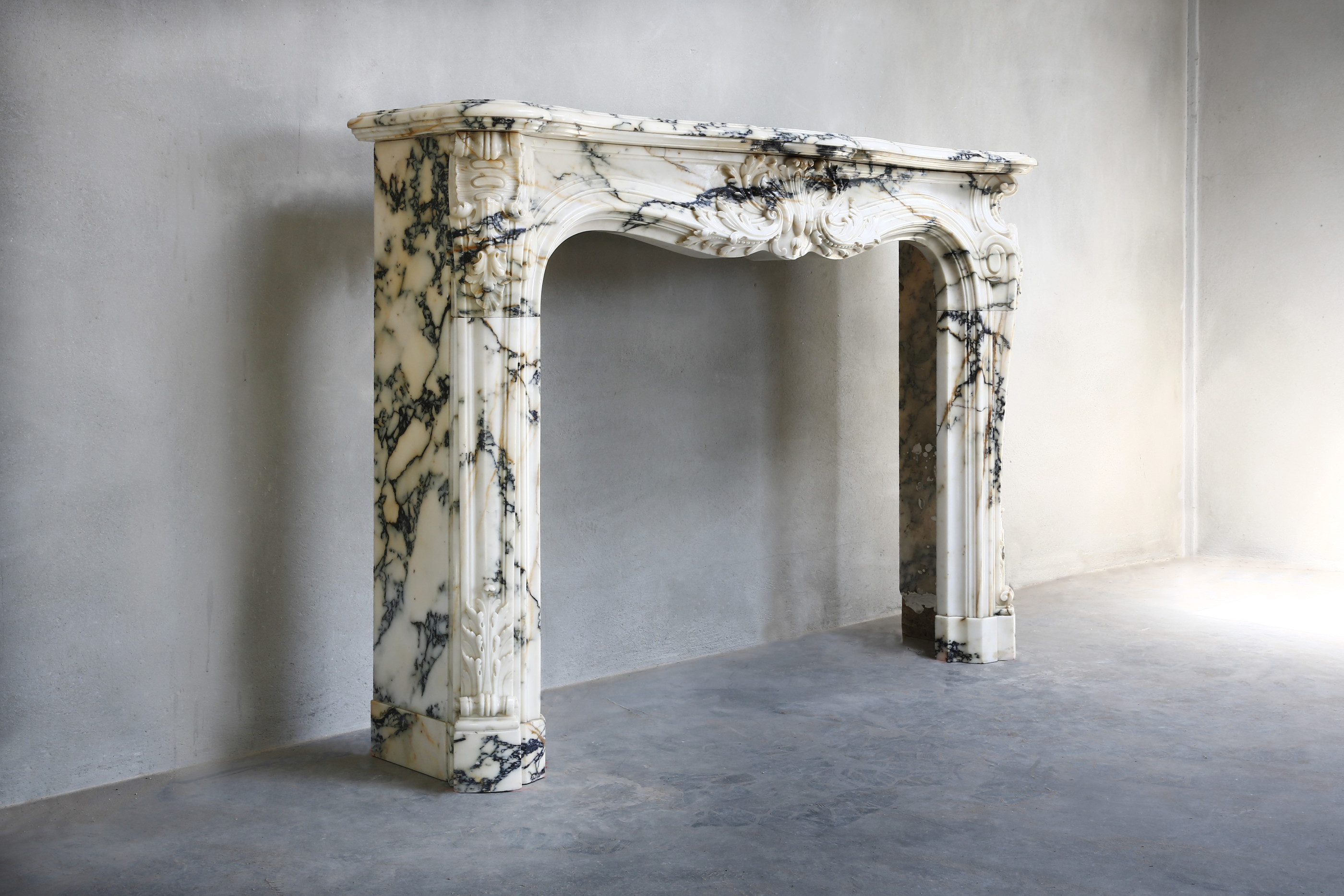 Zeer exclusieve antieke marmeren schouw uit het jaar 1820! De marmersoort van deze prachtige schouw is Paonazzo marmer uit Toscane. De kenmerken van Paonazzo marmer zijn de diversiteit aan kleur en samenstelling. Door de hoge dosis ijzeroxide onstaat er een warme gloed van oranje/geel die door de aders heen lopen. Deze indrukwekkende mantel is in stijl van Louis XV uit de Rococco Regence periode! Wij hebben deze schouw gedemonteerd uit Hotel de Paris uit Parijs. De coquille in het midden van het frontgedeelte met doorlopend ornamenten op de benen zorgen voor een sierlijk geheel. Een zeer mooie schouw die waardevol is voor elk interieur!