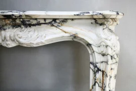 Zeer exclusieve antieke marmeren schouw uit het jaar 1820! De marmersoort van deze prachtige schouw is Paonazzo marmer uit Toscane. De kenmerken van Paonazzo marmer zijn de diversiteit aan kleur en samenstelling. Door de hoge dosis ijzeroxide onstaat er een warme gloed van oranje/geel die door de aders heen lopen. Deze indrukwekkende mantel is in stijl van Louis XV uit de Rococco Regence periode! Wij hebben deze schouw gedemonteerd uit Hotel de Paris uit Parijs. De coquille in het midden van het frontgedeelte met doorlopend ornamenten op de benen zorgen voor een sierlijk geheel. Een zeer mooie schouw die waardevol is voor elk interieur!