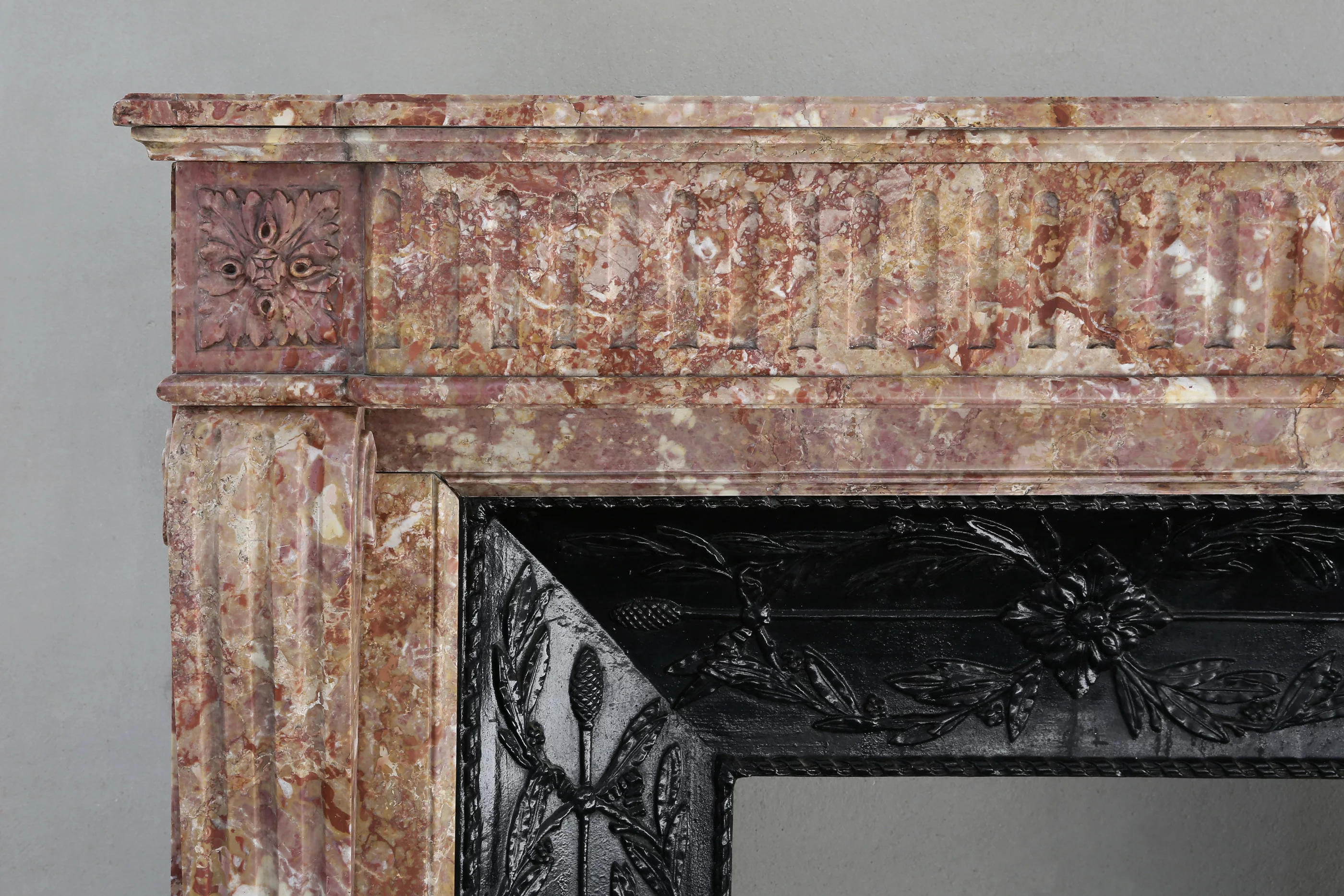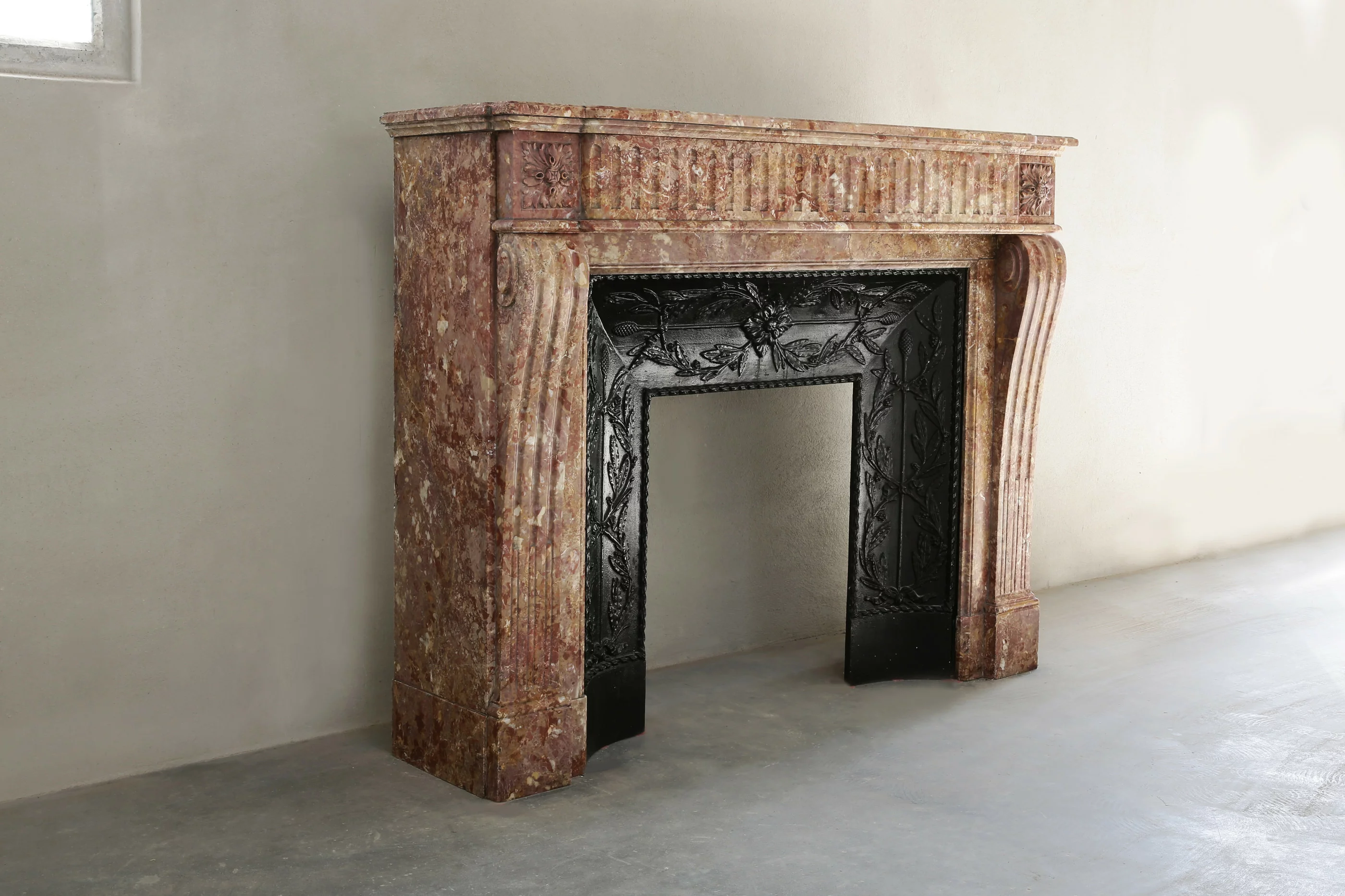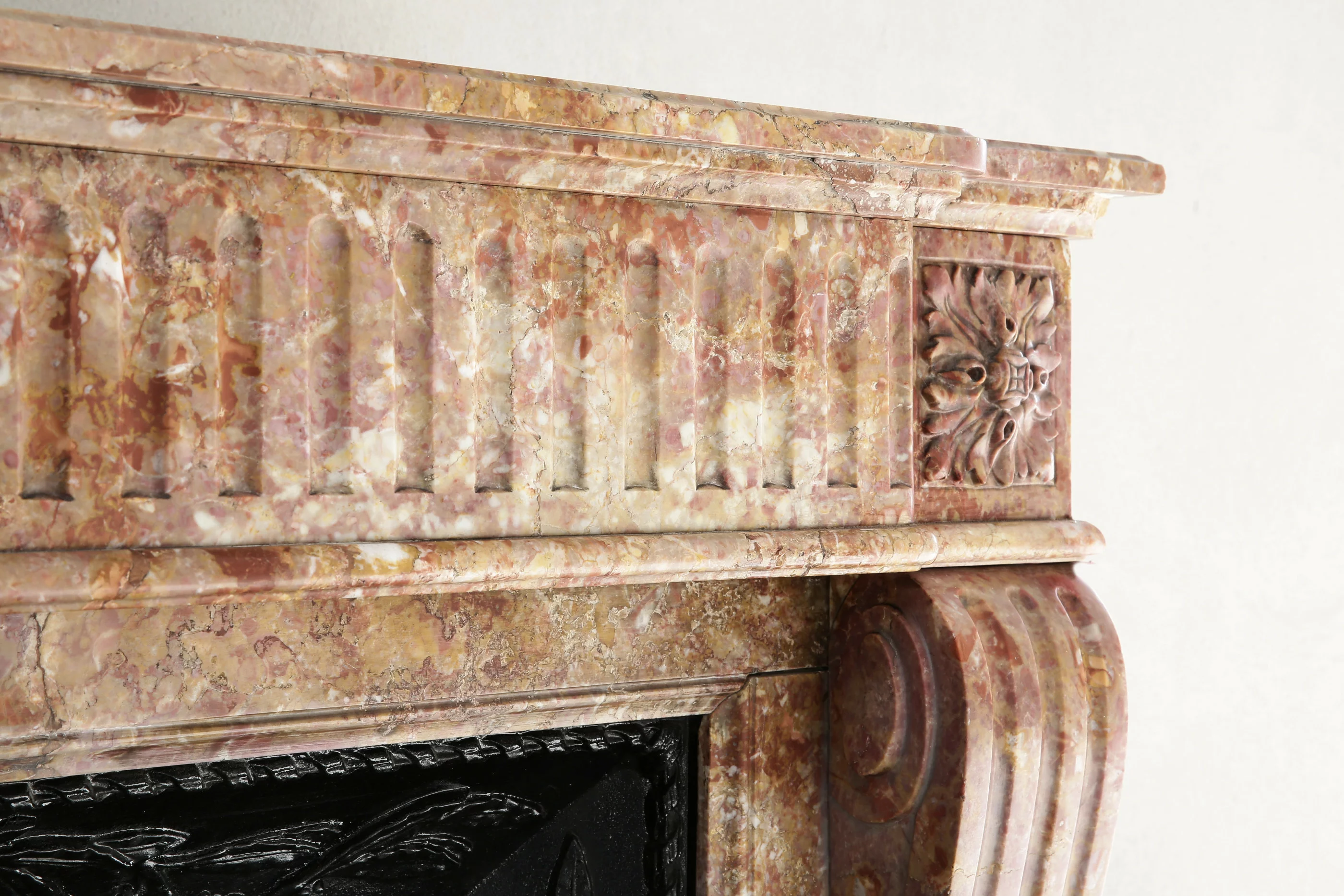 Antieke mantel van Brocatelle marmer uit Frankrijk in stijl van Louis XVI. Deze schouw uit de 19e eeuw is versierd met cannelures in het fontgedeelte en doorlopend op de benen. Wat deze schouw bijzonder maakt is de cast iron insert die voor deze schouw gemaakt is.
