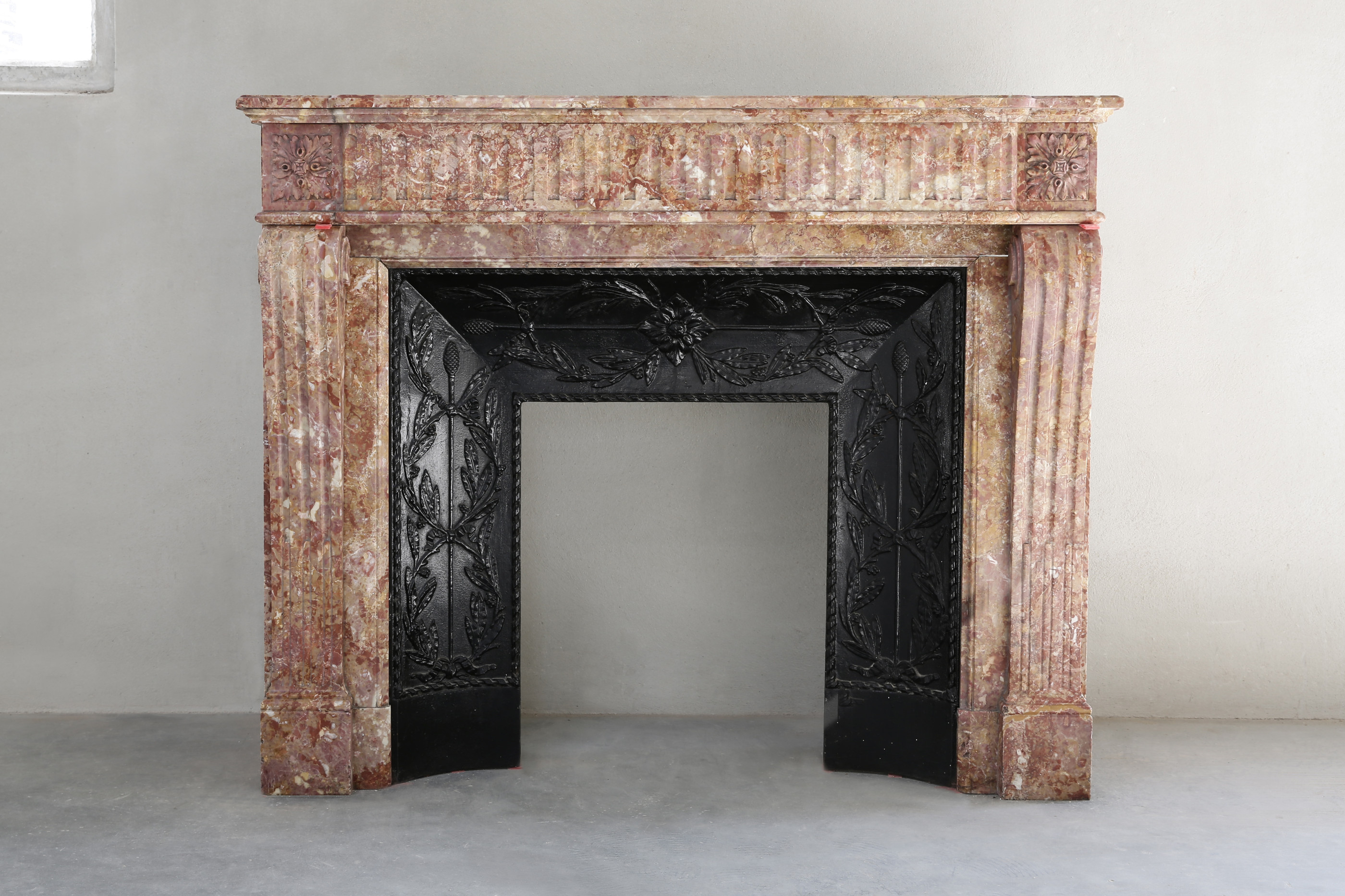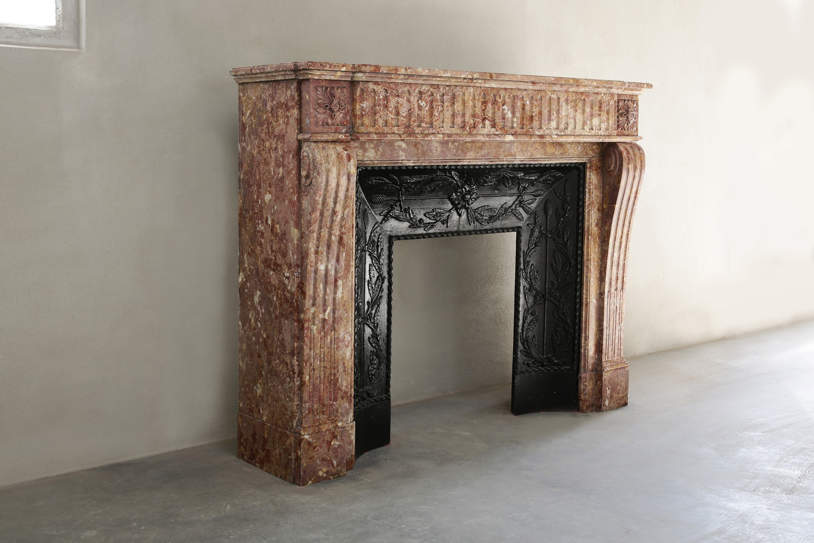 Antieke mantel van Brocatelle marmer uit Frankrijk in stijl van Louis XVI. Deze schouw uit de 19e eeuw is versierd met cannelures in het fontgedeelte en doorlopend op de benen. Wat deze schouw bijzonder maakt is de cast iron insert die voor deze schouw gemaakt is.