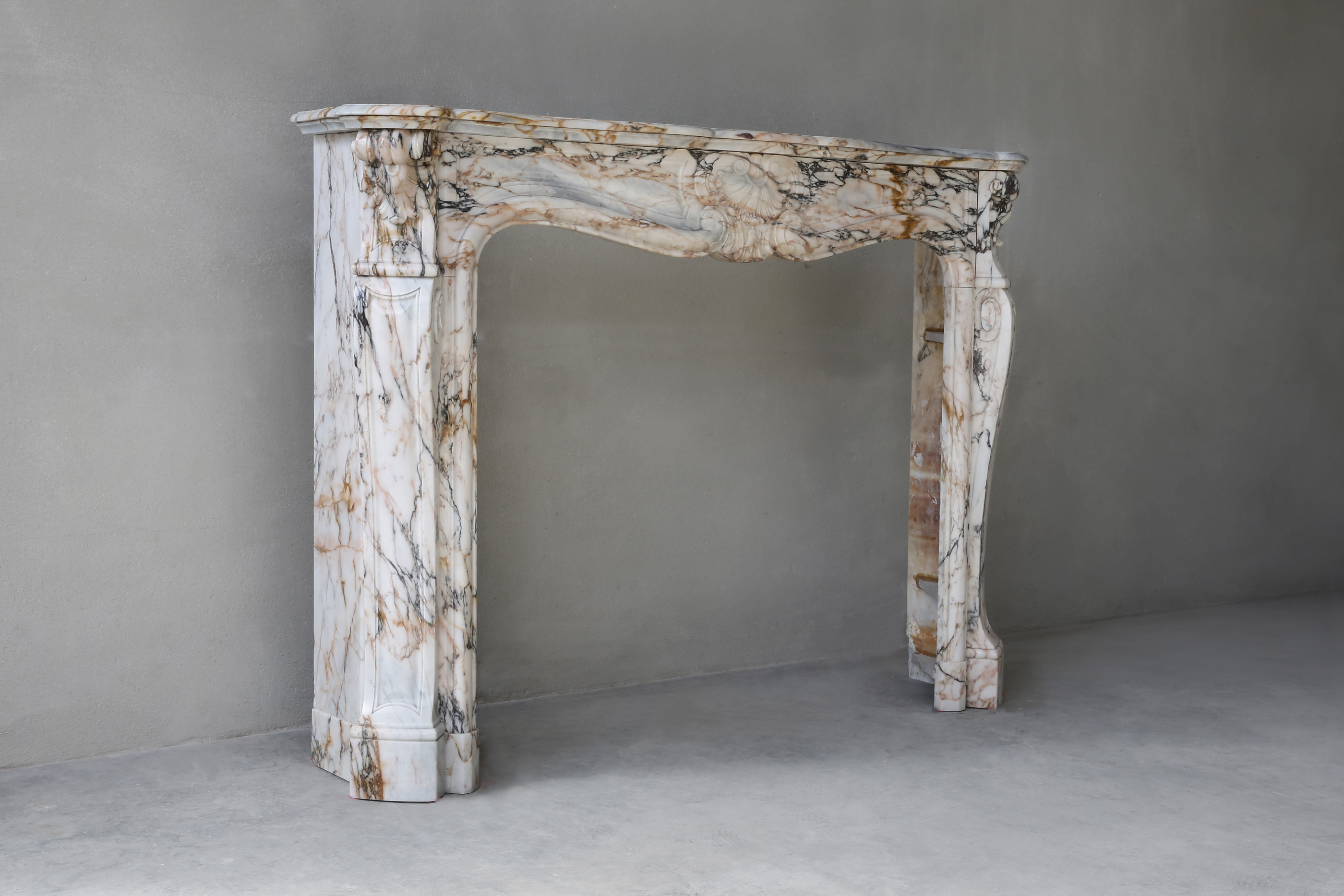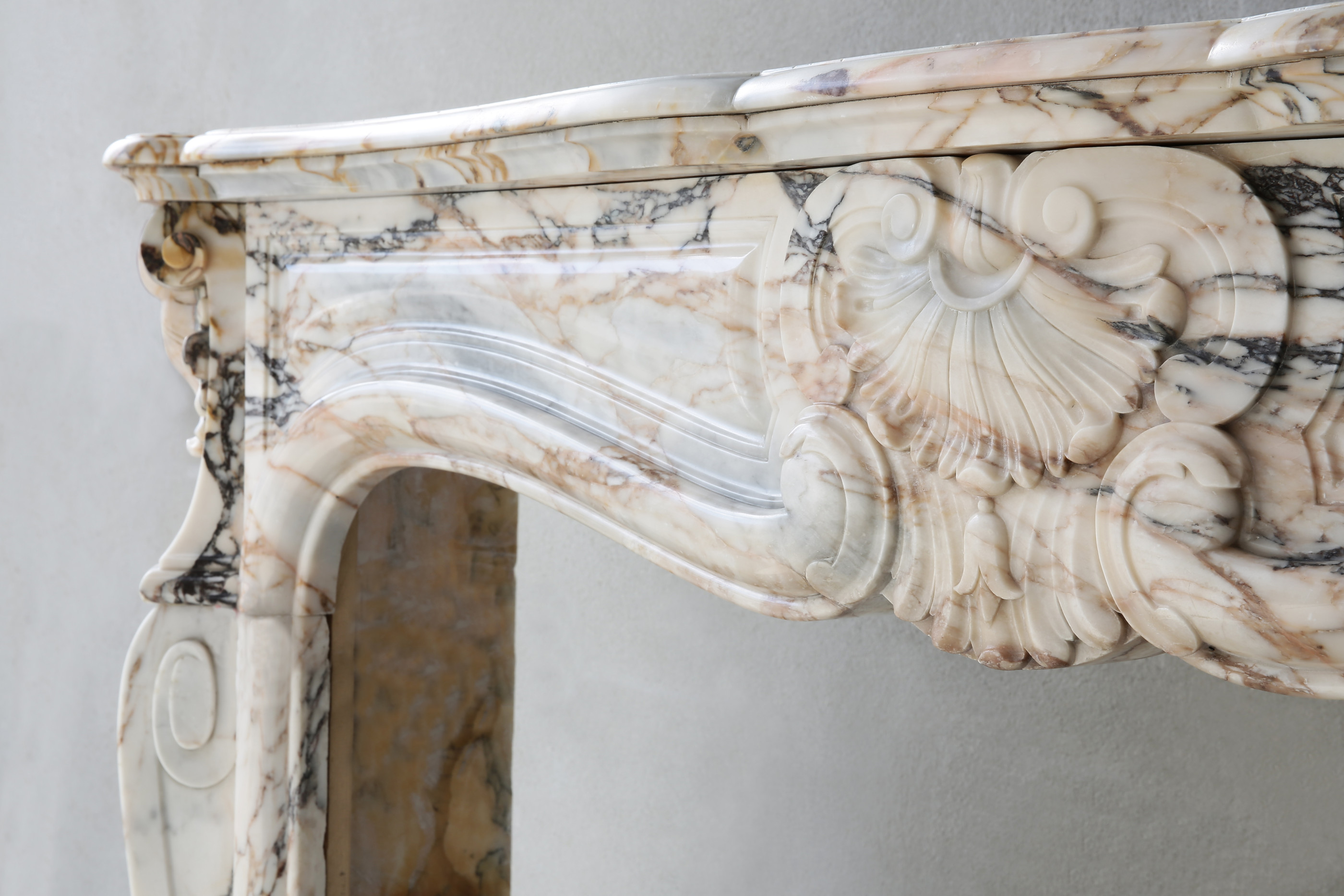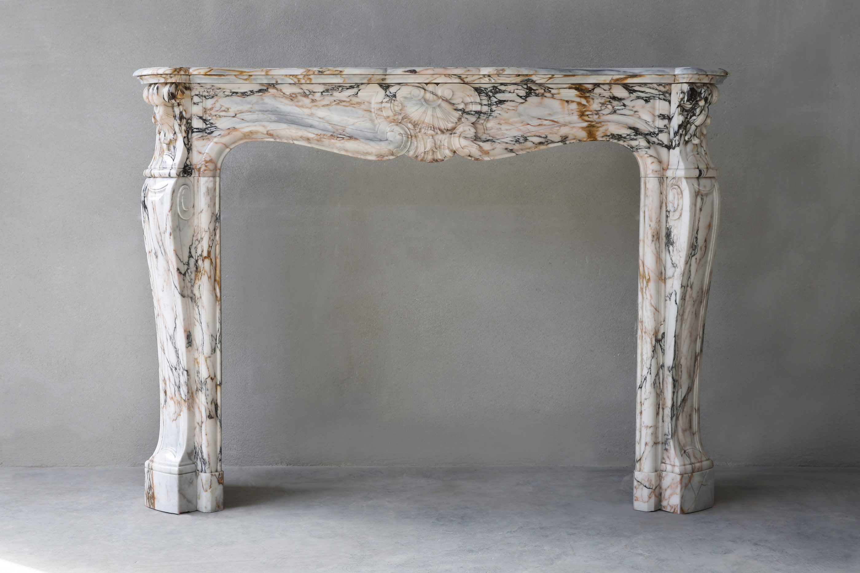 Chique antieke marmeren mantel uit 1890 - 1900. Deze prachtige schouw is gebeiteld uit de Griekse marmersoort Skyros en heeft een warme kleurstelling. Deze schouw is in stijl van Louis XV en heeft een coquille in het midden van het frontgedeelte met doorlopende versieringen op de benen. Een prachtige stijlvolle schouw die uit het oude stadscentrum van Brussel komt.