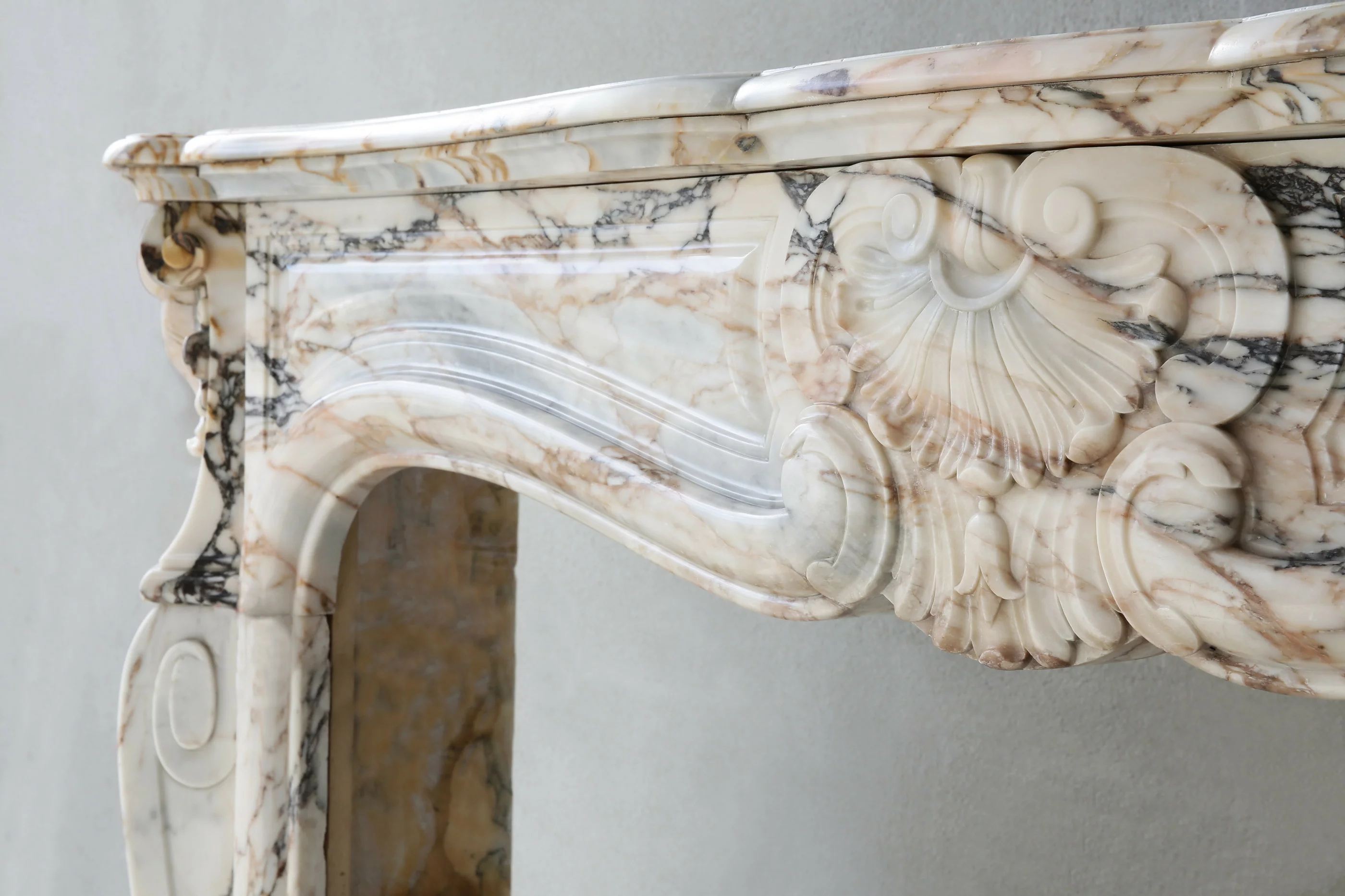 Chique antieke marmeren mantel uit 1890 - 1900. Deze prachtige schouw is gebeiteld uit de Griekse marmersoort Skyros en heeft een warme kleurstelling. Deze schouw is in stijl van Louis XV en heeft een coquille in het midden van het frontgedeelte met doorlopende versieringen op de benen. Een prachtige stijlvolle schouw die uit het oude stadscentrum van Brussel komt.