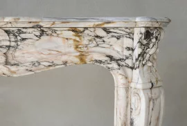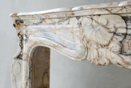 Chique antieke marmeren mantel uit 1890 - 1900. Deze prachtige schouw is gebeiteld uit de Griekse marmersoort Skyros en heeft een warme kleurstelling. Deze schouw is in stijl van Louis XV en heeft een coquille in het midden van het frontgedeelte met doorlopende versieringen op de benen. Een prachtige stijlvolle schouw die uit het oude stadscentrum van Brussel komt.