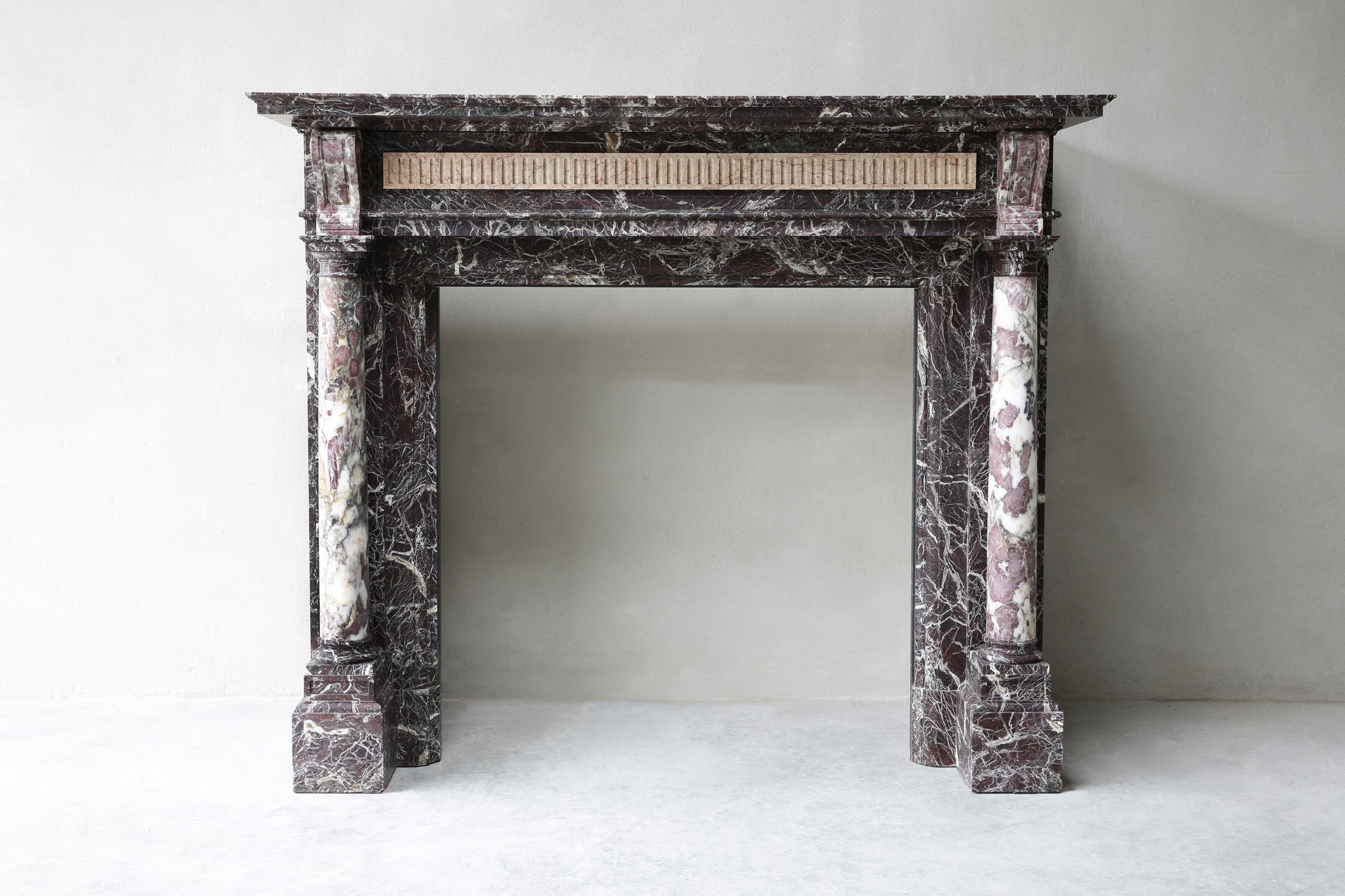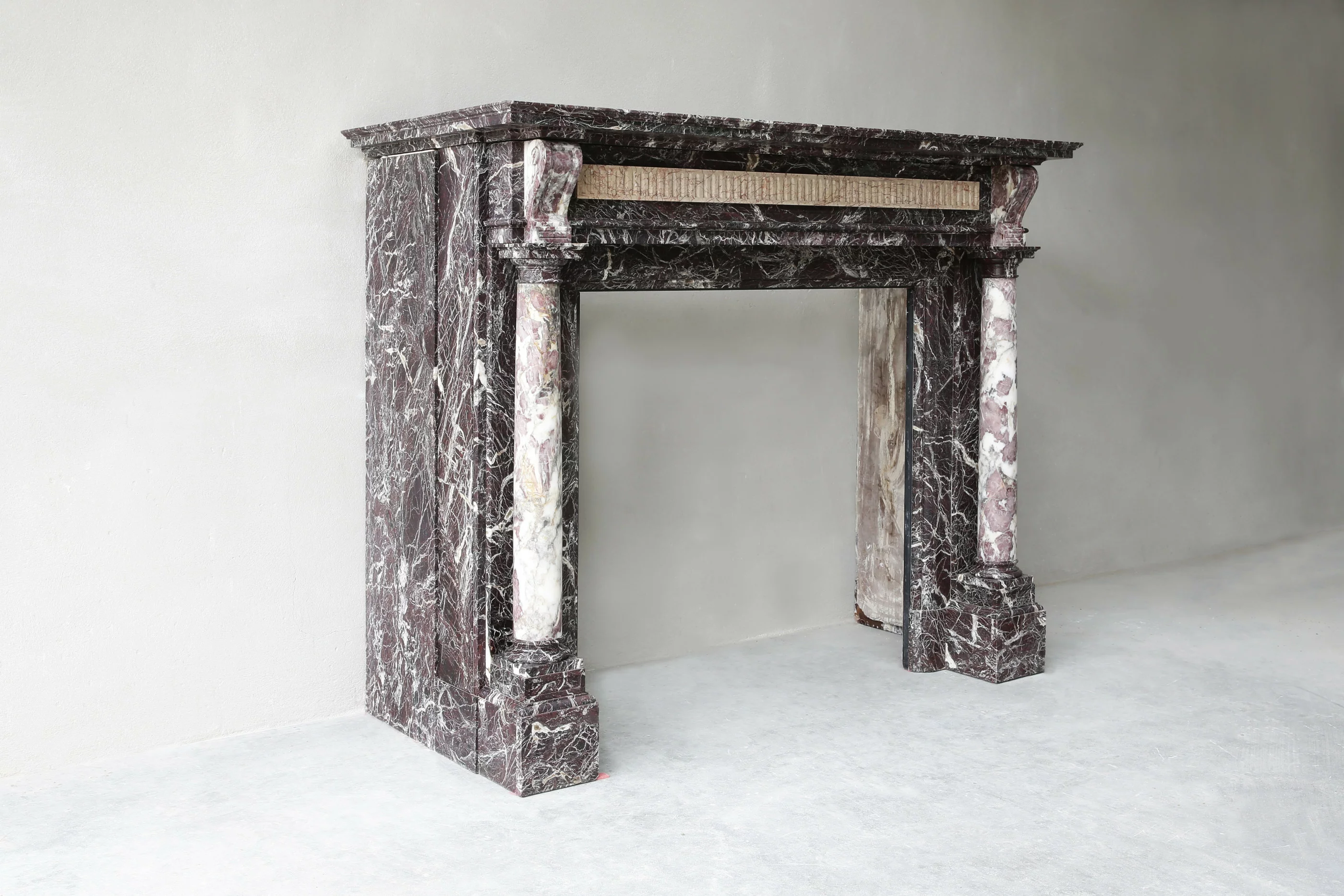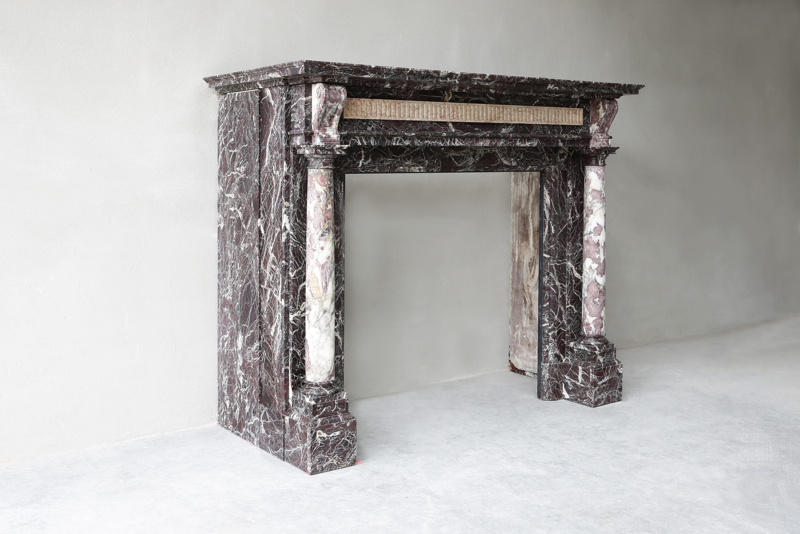 Exclusieve antieke marmeren schouw met pilaren uit de 19e eeuw! Een prachtige mantel binnen onze collectie, voorzien van mooie belijningen en ornamenten, in stijl van Louis XVI. De marmersoort is Levanto marmer en komt oorspronkelijk uit Italië. Wij hebben deze mooie mantel uit een oud pand in Brussel gehaald.