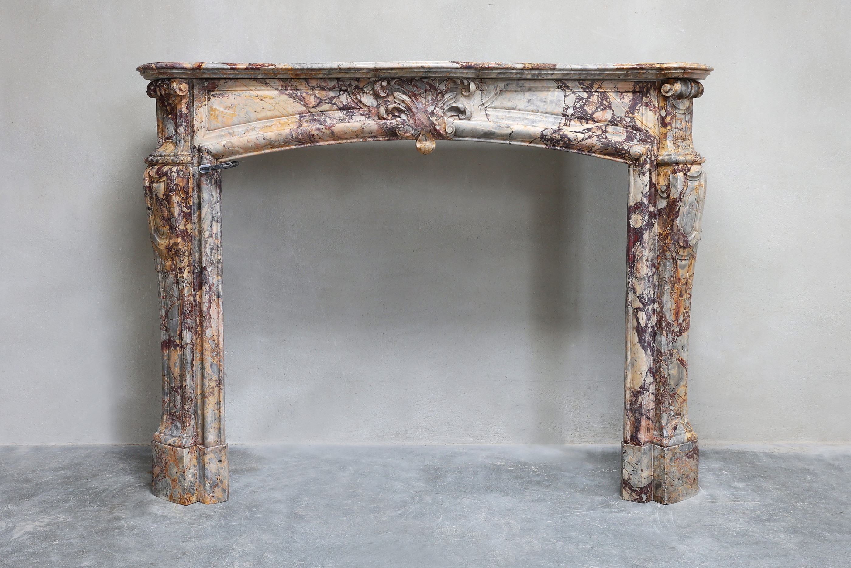 Prachtige antieke schouw van Breche de Medou marmer in stijl van Regence Pompadour. Een schouw van een bijzondere kleurrijke marmersoort uit Frankrijk! Deze schouw stamt uit 1870 - 1880. Een juweeltje voor elk interieur!