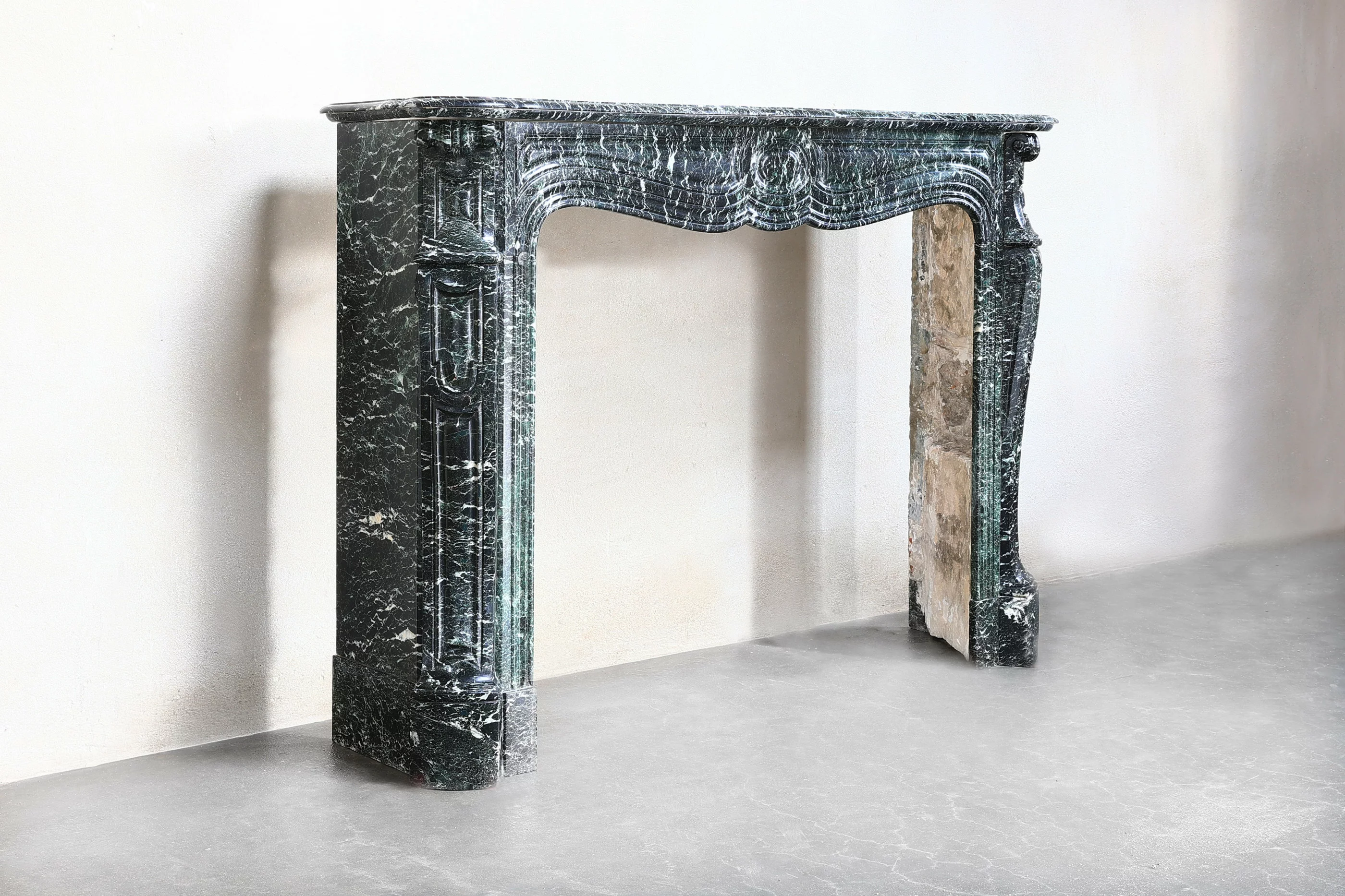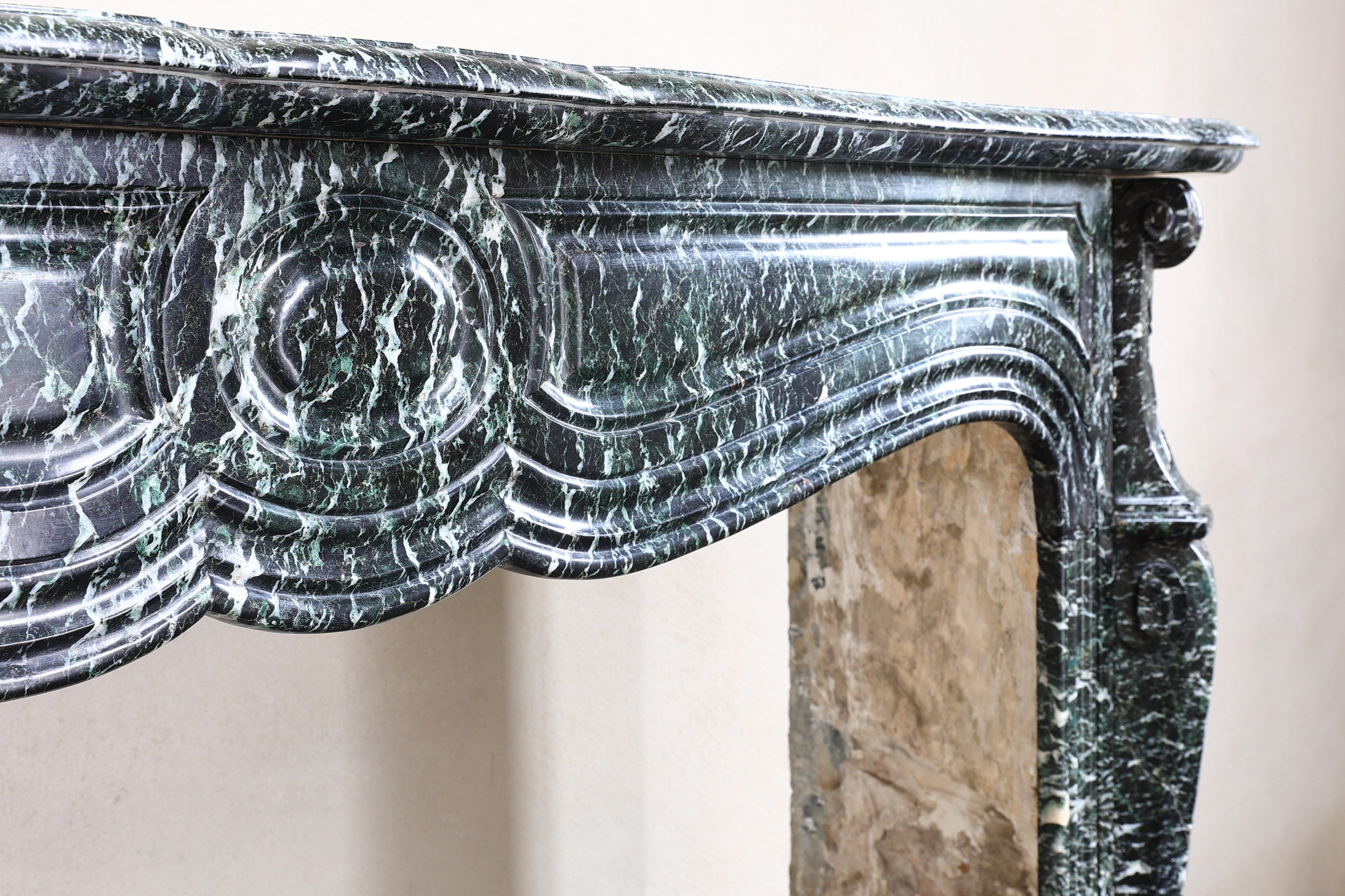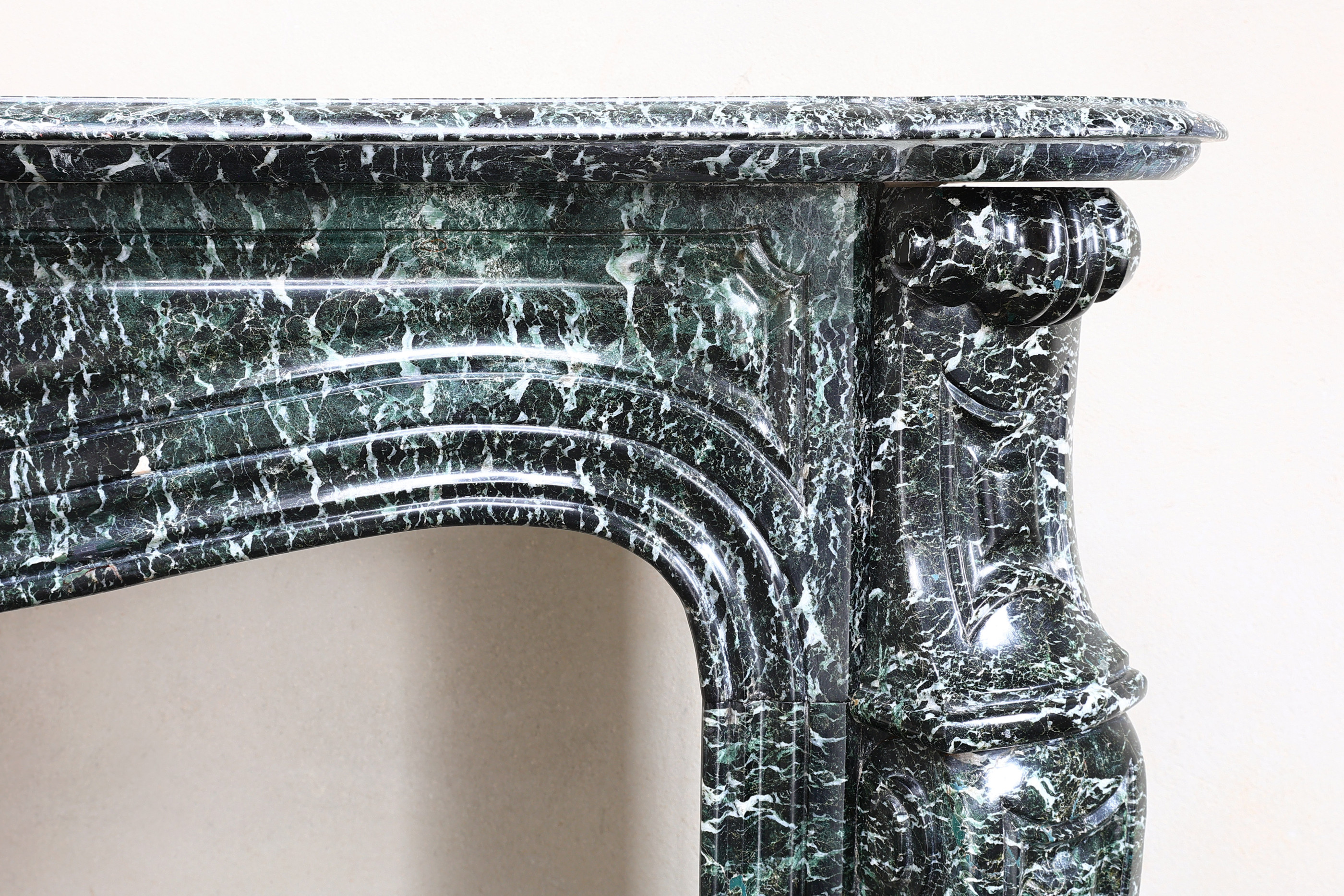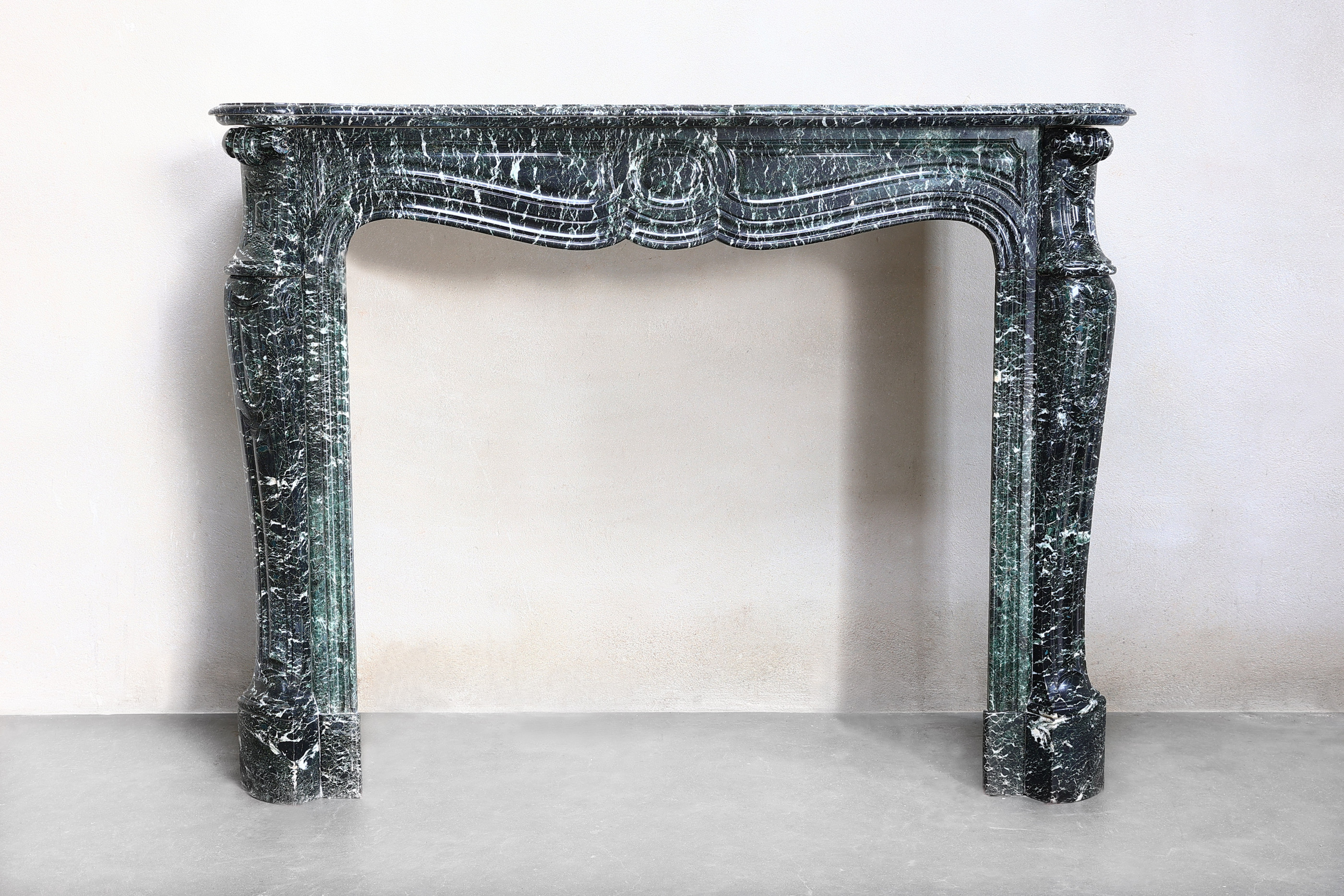 Prachtige antieke schouw van Vert de Mer marmer in stijl van Pompadour uit 1850 - 1870. Pompadour schouwen zijn herkenbaar aan de ronding in het midden. Dit is een hele charmante en stijlvolle mantel van een bijzondere marmersoort.