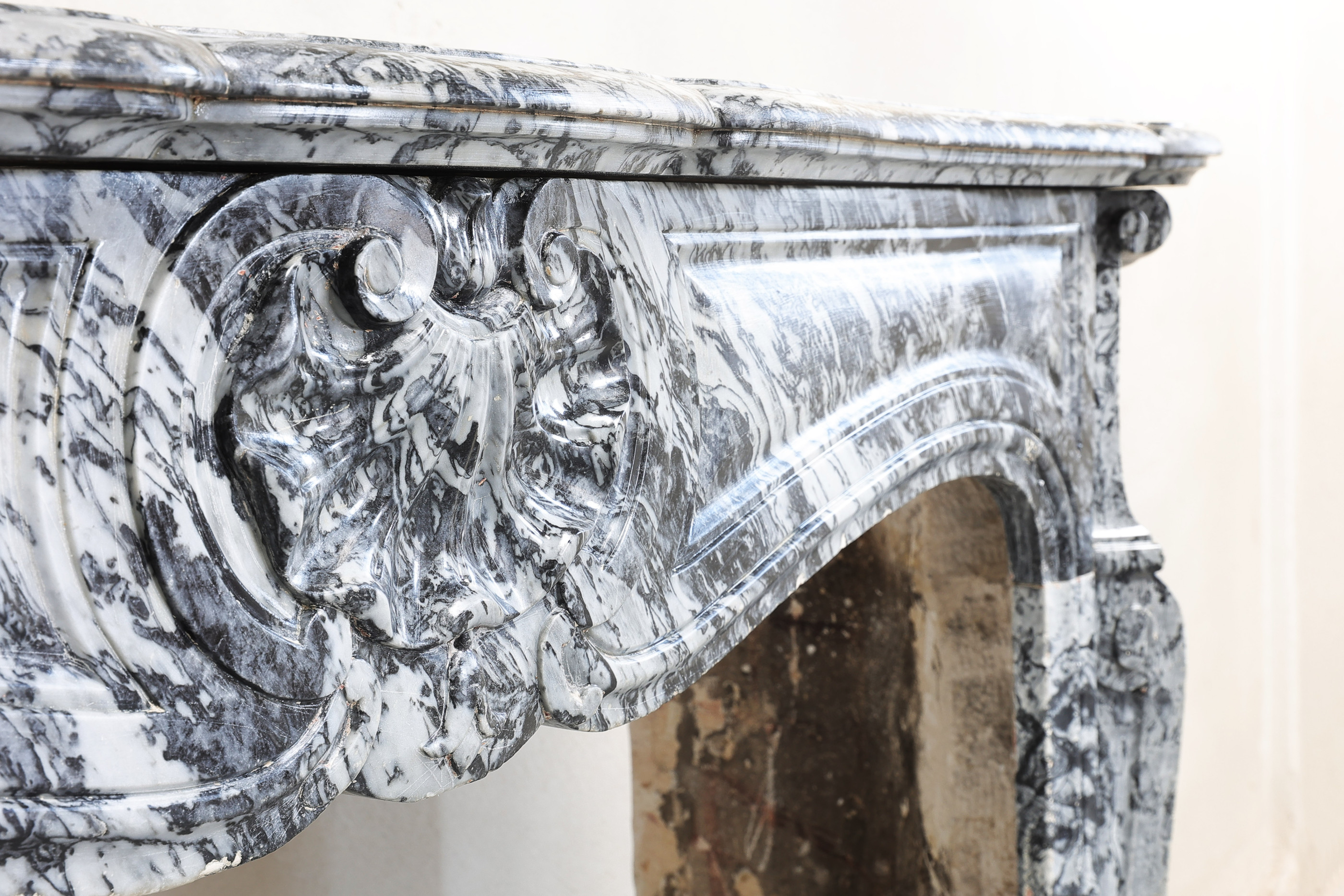 Mooie antieke schouw van Blue Fleuri marmer! Deze schouw is in stijl van Louis XV en is voorzien van een coquille in het midden. De schouw stamt uit de 19 eeuw en is in goede staat.