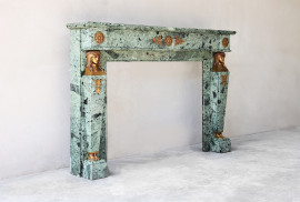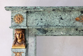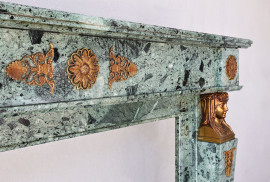 Zeer bijzondere antieke schouw van de Griekse marmersoort 'Vert de Grece'. Deze open haard is in stijl van Empire en stamt uit eind 19e eeuw (1890-1910). De herkomst van deze schouw is Frankrijk - Lille. De prachtige combinatie van de bronzen beelden en griekse marmer maakt deze schouw zeldzaam!