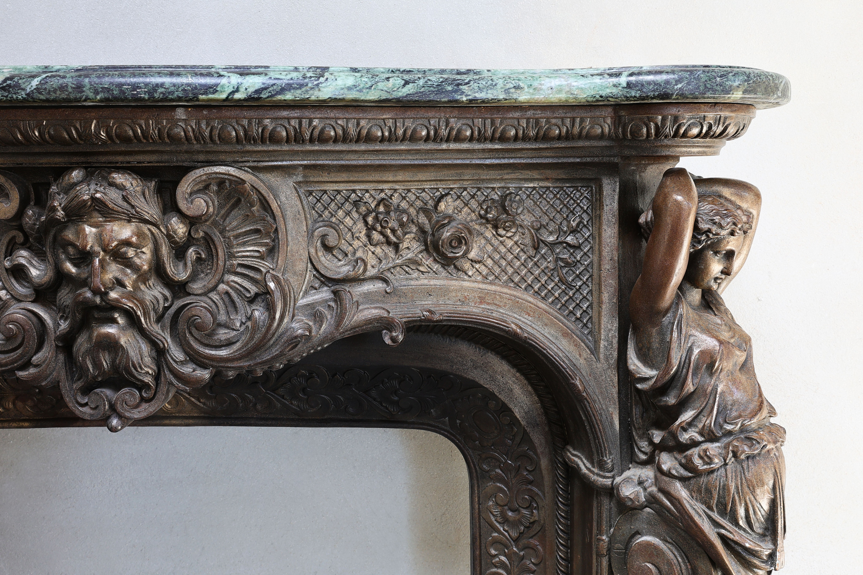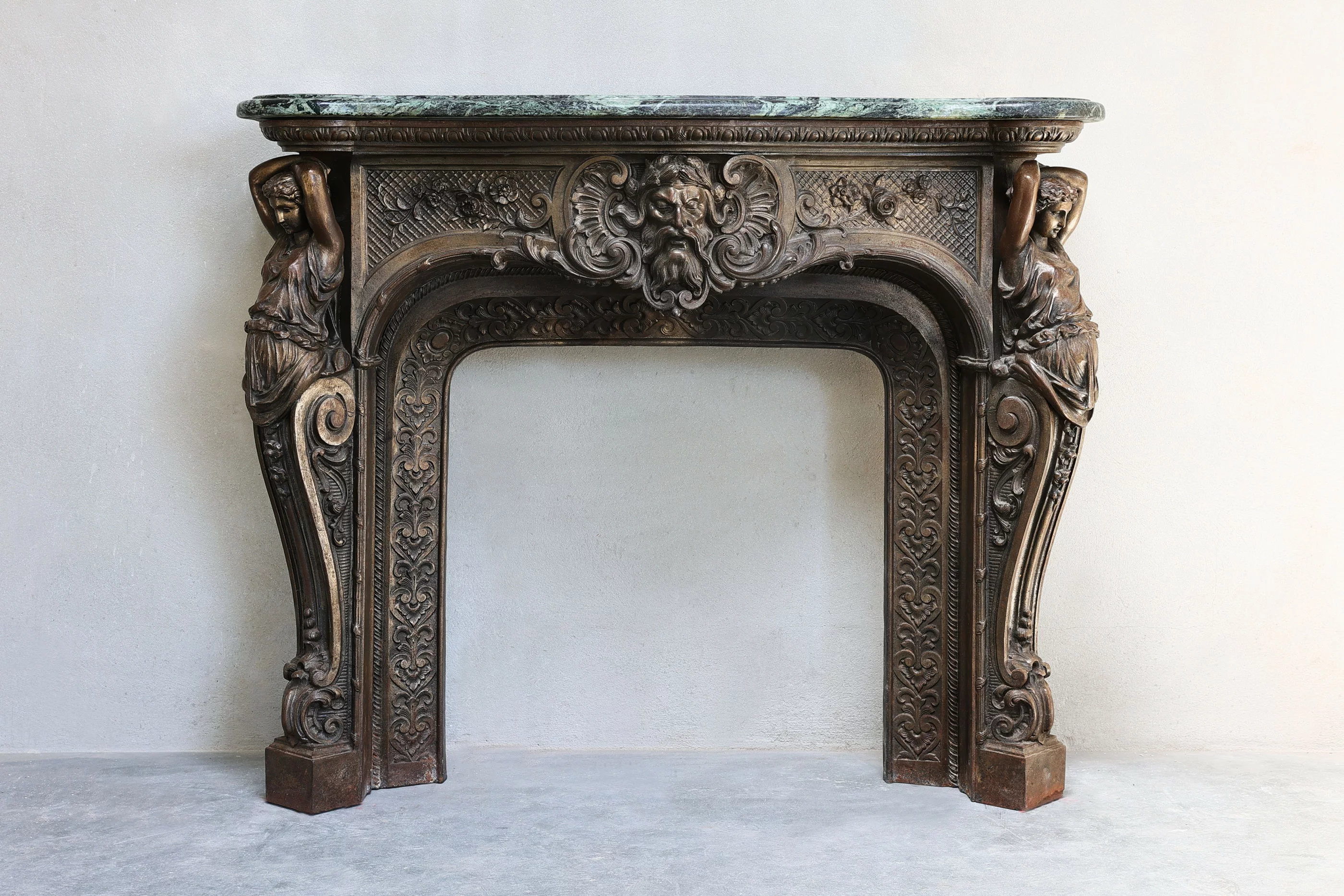 Zeer unieke en zeldzame antieke marmeren schouw van gietijzer brons gepatineerd en Vert de Gréce marmer (Tinos) uit medio 19e-eeuwse schouw! De gezichten komen uit de Griekste mythologie. In het midden ziet u Poseidon, de God van de Zee en de beelden aan de zijkanten is zijn vrouw Amphitrite. Een zeer bijzondere schouw die een mooie plaats verdient binnen een interieur.