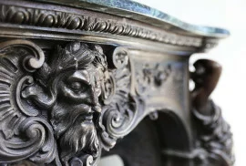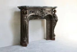 Zeer unieke en zeldzame antieke marmeren schouw van gietijzer brons gepatineerd en Vert de Gréce marmer (Tinos) uit medio 19e-eeuwse schouw! De gezichten komen uit de Griekste mythologie. In het midden ziet u Poseidon, de God van de Zee en de beelden aan de zijkanten is zijn vrouw Amphitrite. Een zeer bijzondere schouw die een mooie plaats verdient binnen een interieur.