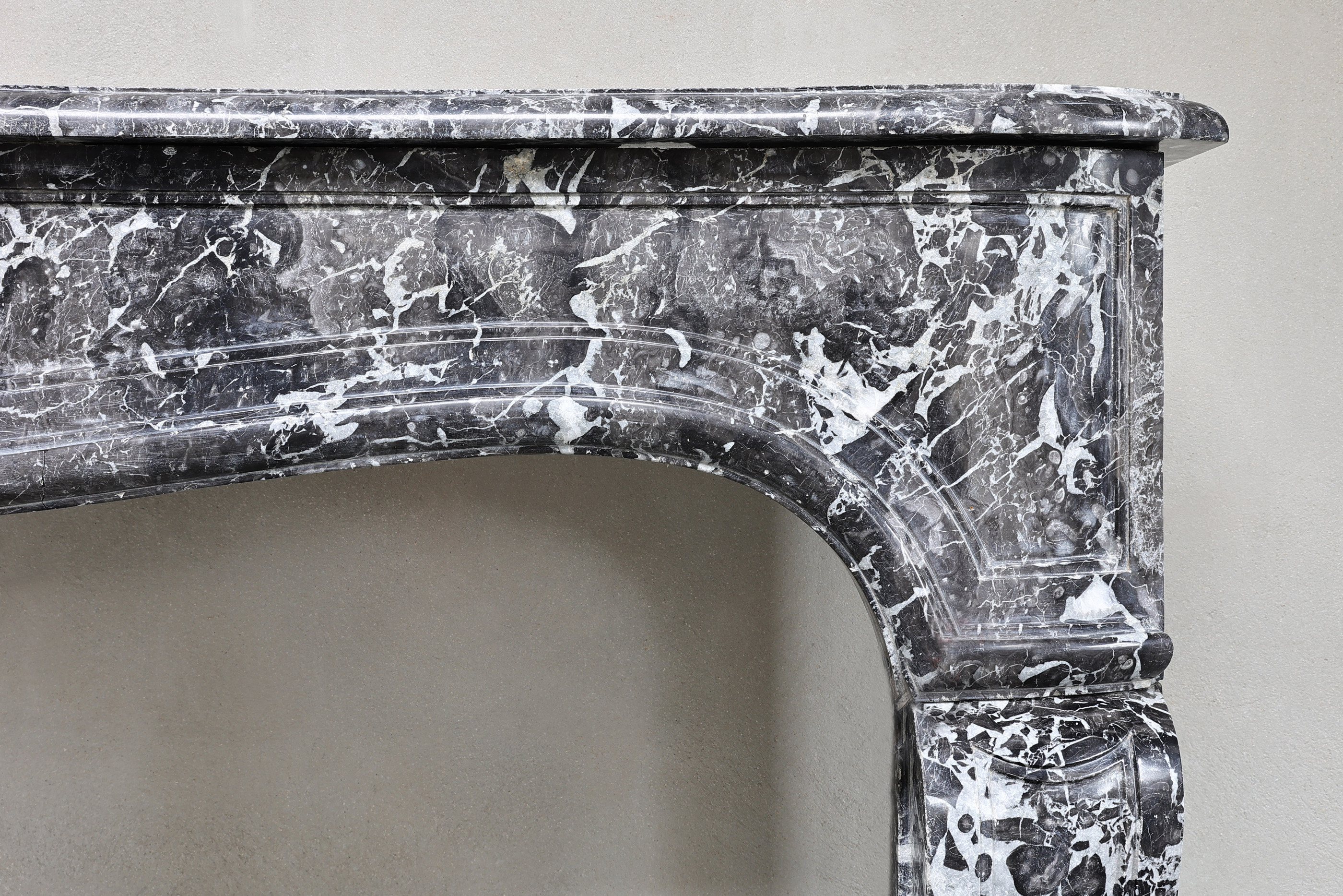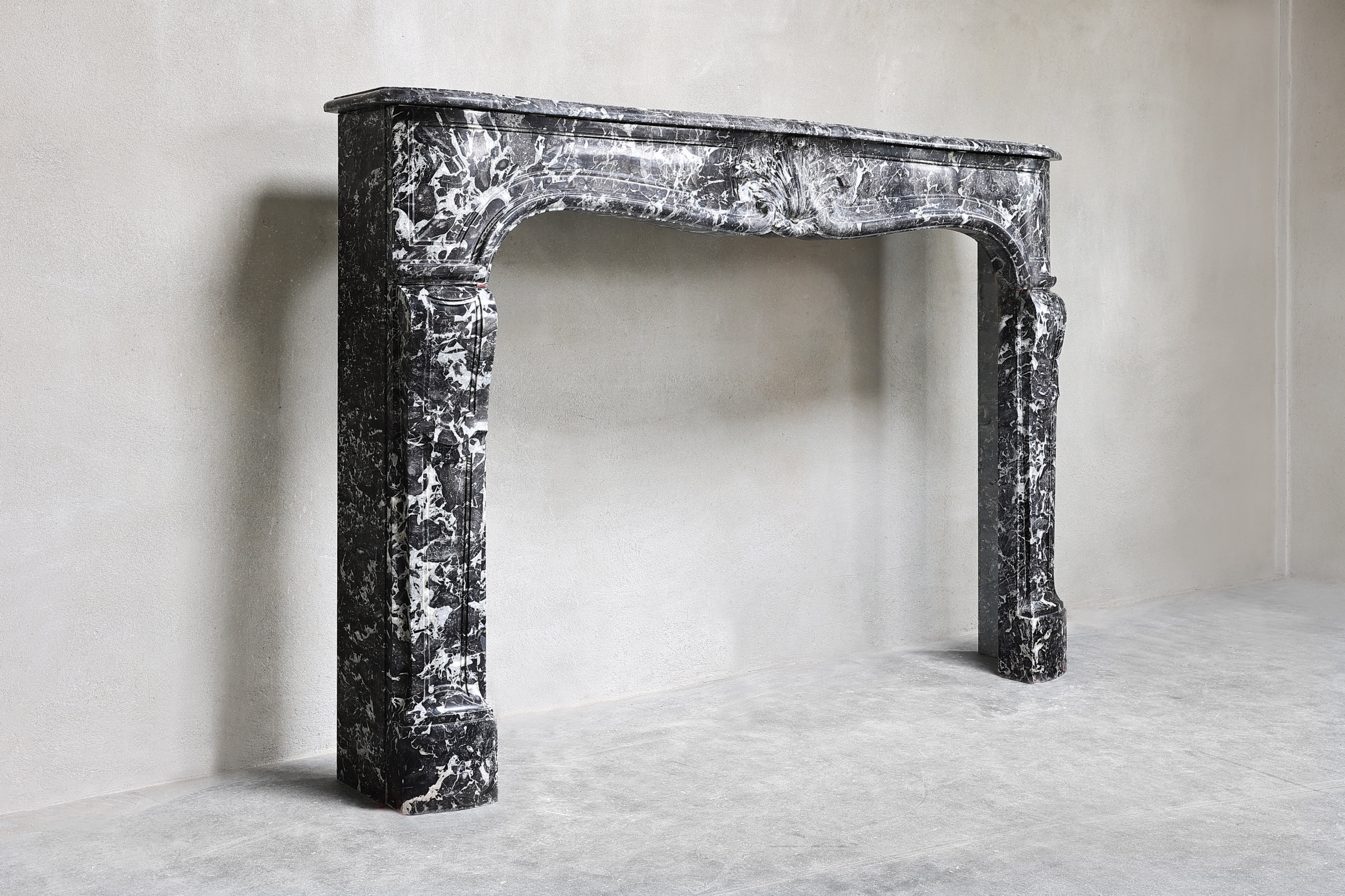18e eeuwse antieke schouw van Sint Anna marmer uit België! Een mooie grijs/zwarte marmersoort met lichte aders! Een schouw met ronde vormen en een coquille in het midden van het frontgedeelte. Deze schouw is in stijl van Louis XV en heeft licht gebogen benen.