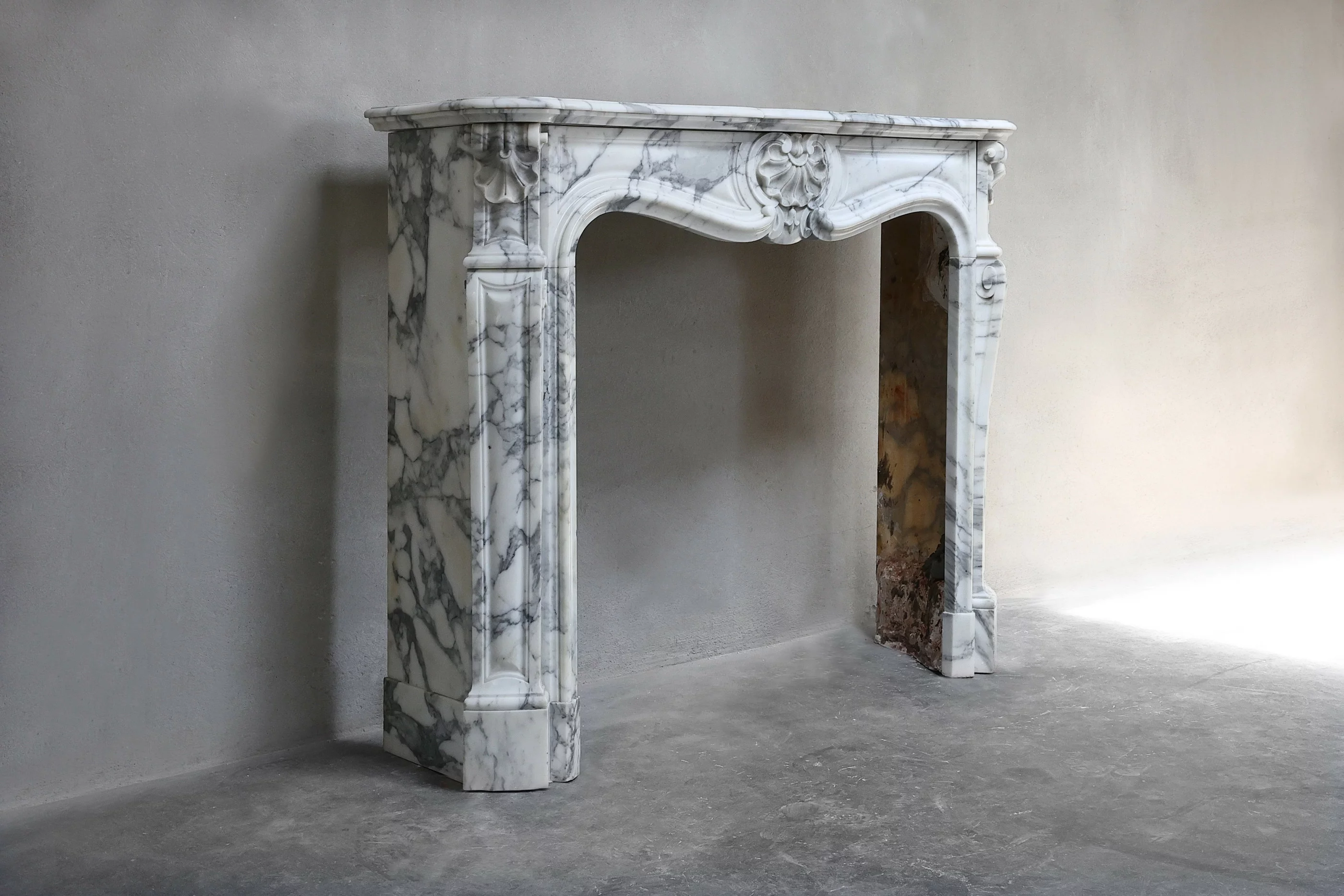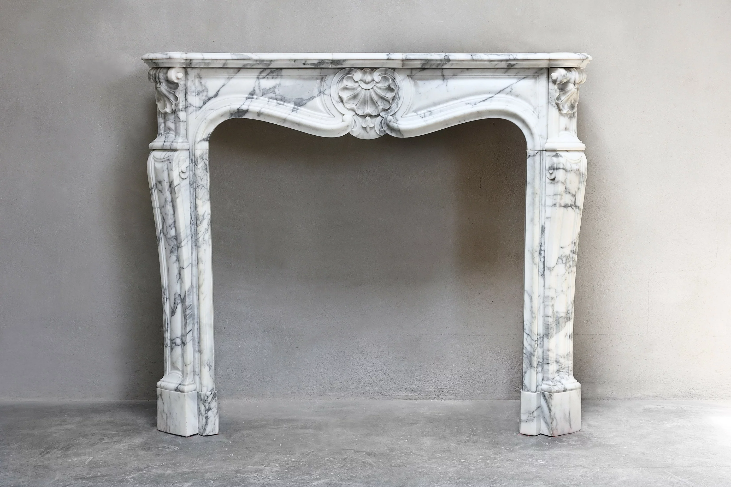 Mooie compacte schouw van Arabescato marmer uit de 19e eeuw in stijl van Louis XV. Deze antieke schouw heeft mooie lichte aderen en prachtige ornamenten zoals 'trois coquilles', een coquille in het midden en op beide benen! Een chique schouw die voor vele interieurs toepasbaar is.