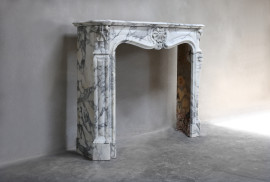 Mooie compacte schouw van Arabescato marmer uit de 19e eeuw in stijl van Louis XV. Deze antieke schouw heeft mooie lichte aderen en prachtige ornamenten zoals 'trois coquilles', een coquille in het midden en op beide benen! Een chique schouw die voor vele interieurs toepasbaar is.