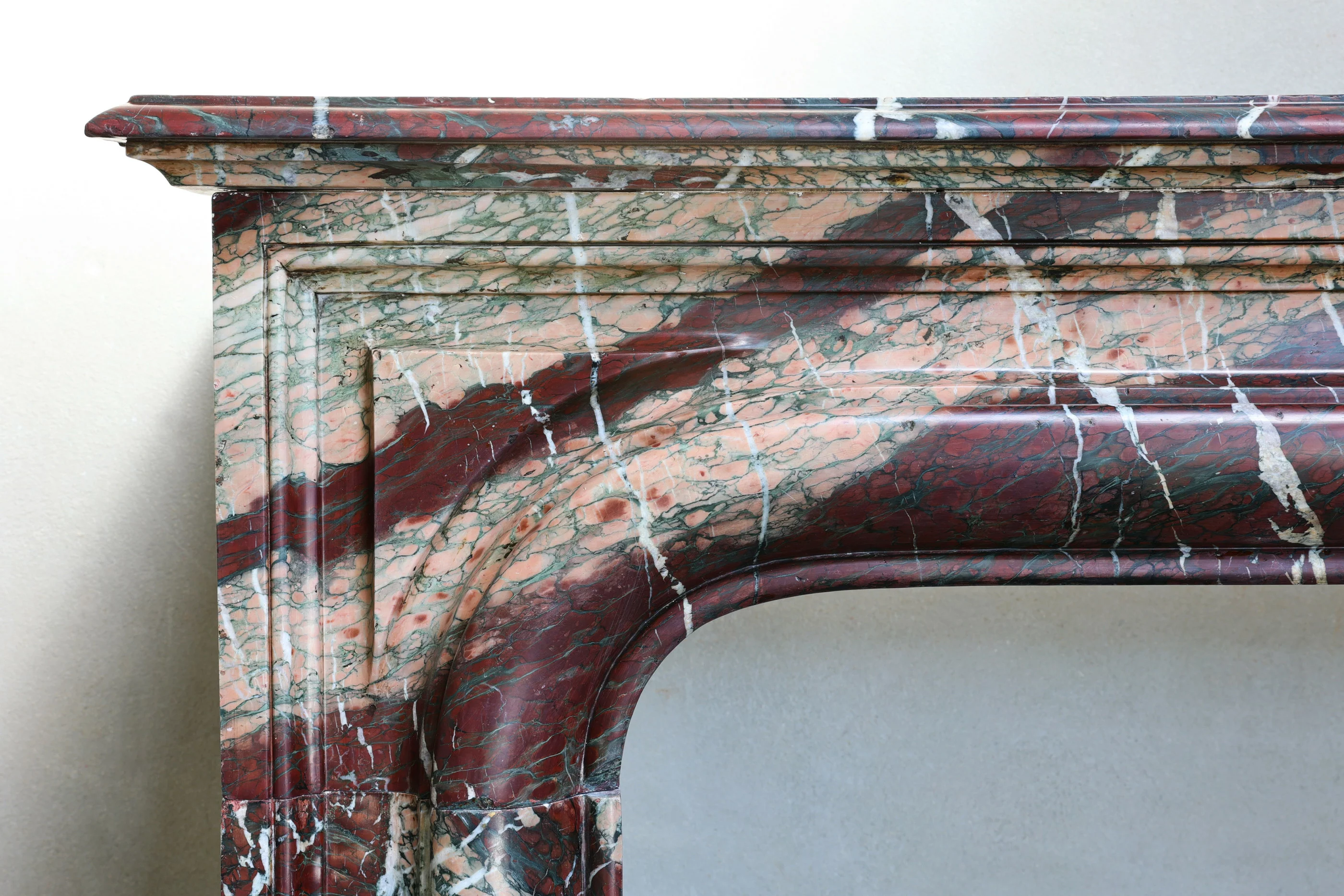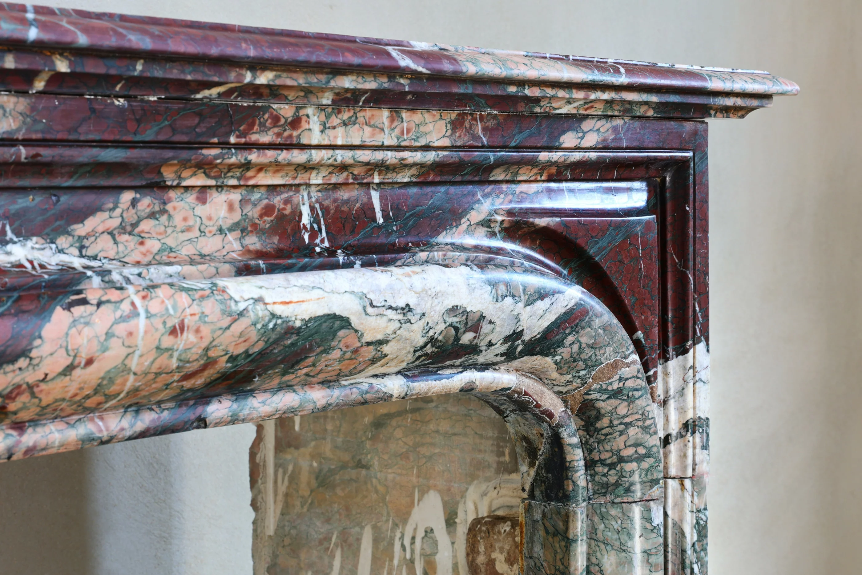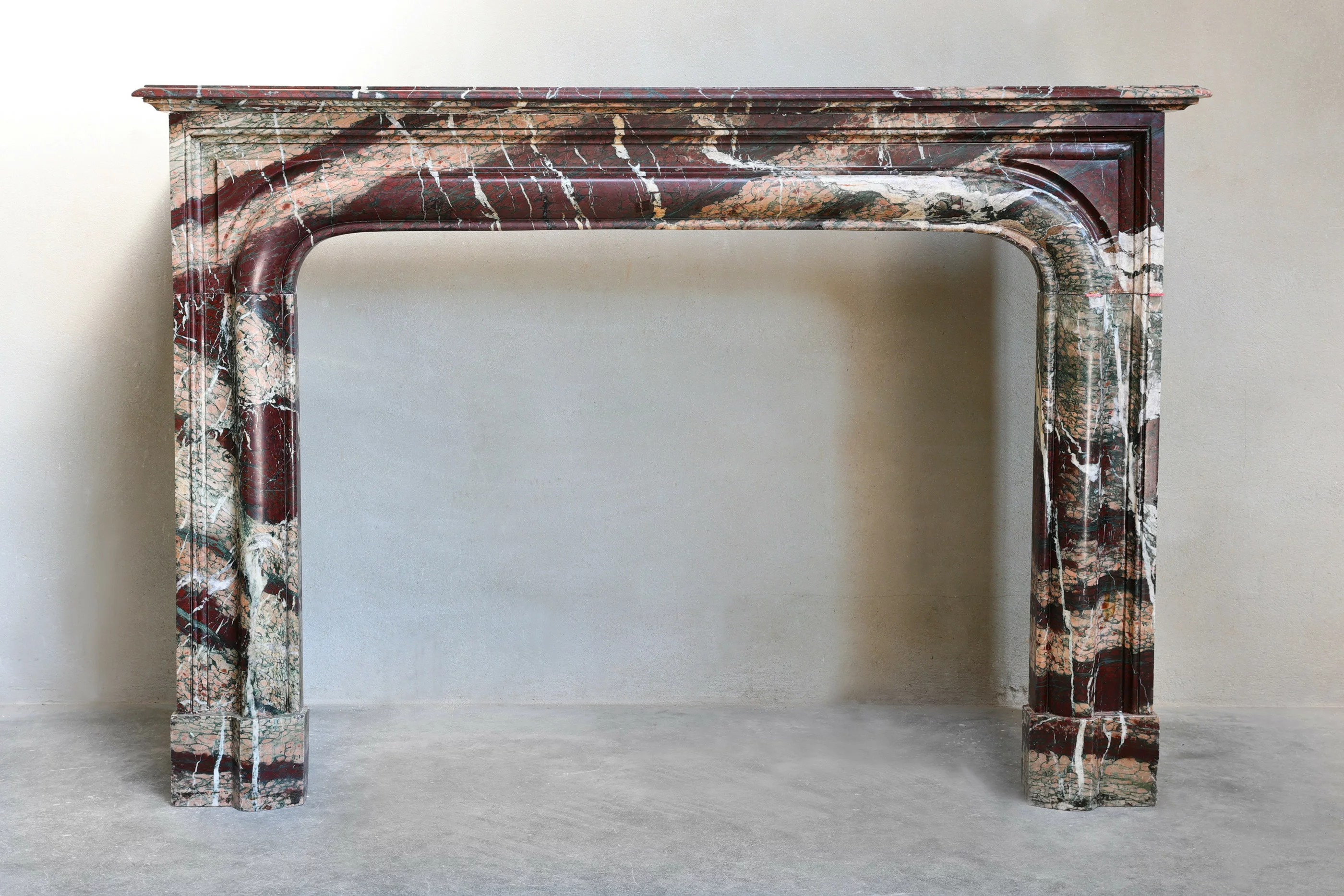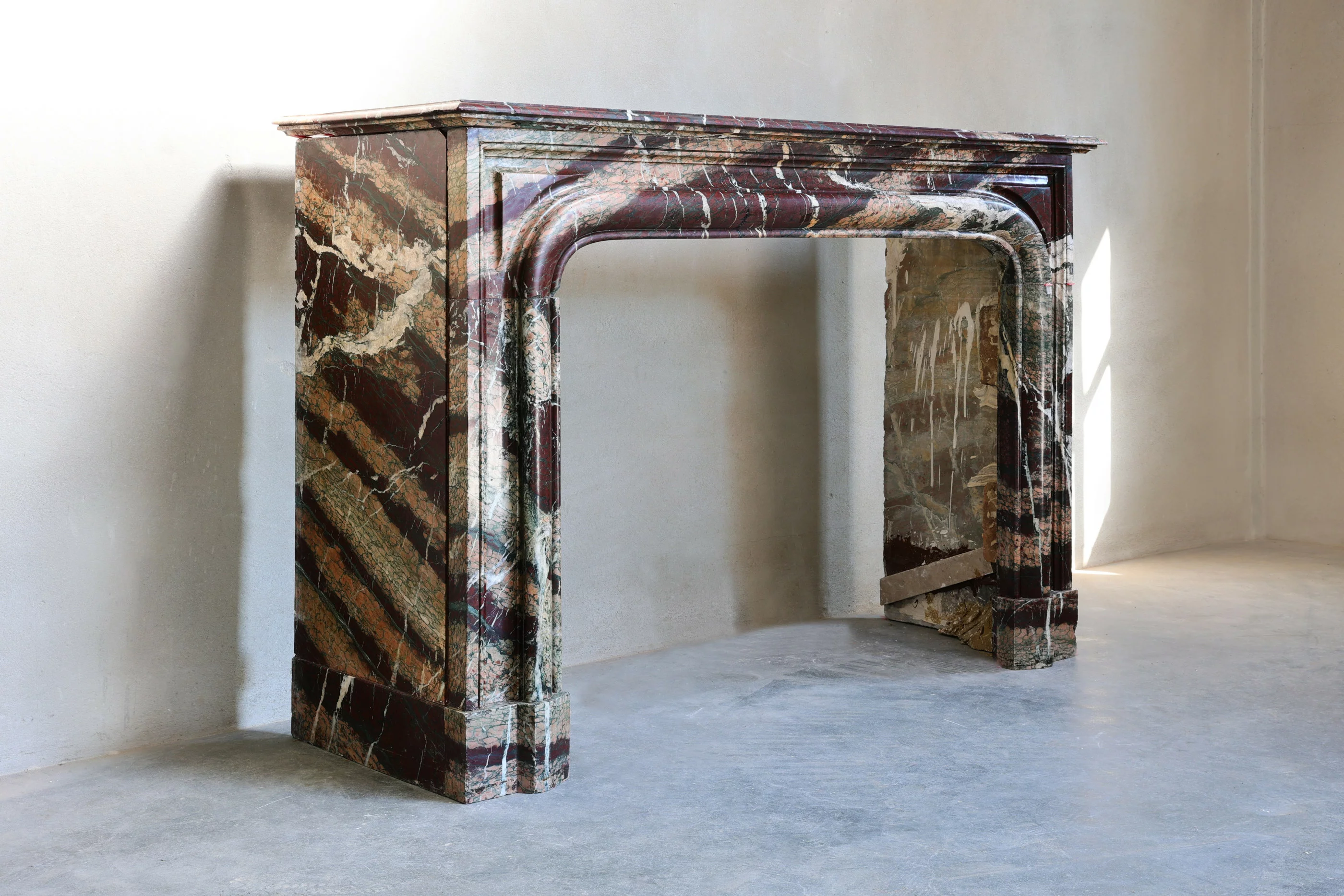Een prachtige antieke schouw van de bijzondere marmersoort Campan Rubane! Een unieke schouw in stijl van Louis XIV met mooie belijningen uit 1850 - 1860. De marmersoort heeft een warme kleurstelling en het is erg mooi om te zien hoe deze marmer in de natuur is ontstaan!