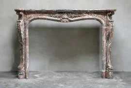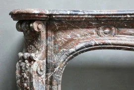 Deze antieke schouw van Saint Remy‑marmer is vervaardigd in de 19e eeuw in de omgeving van Luik (België). De warme marmerkleur met gebeitelde ornamenten weerspiegelt de elegante esthetiek van de Louis XV‑stijl en spreekt tot de verbeelding van architecten en connaisseurs.